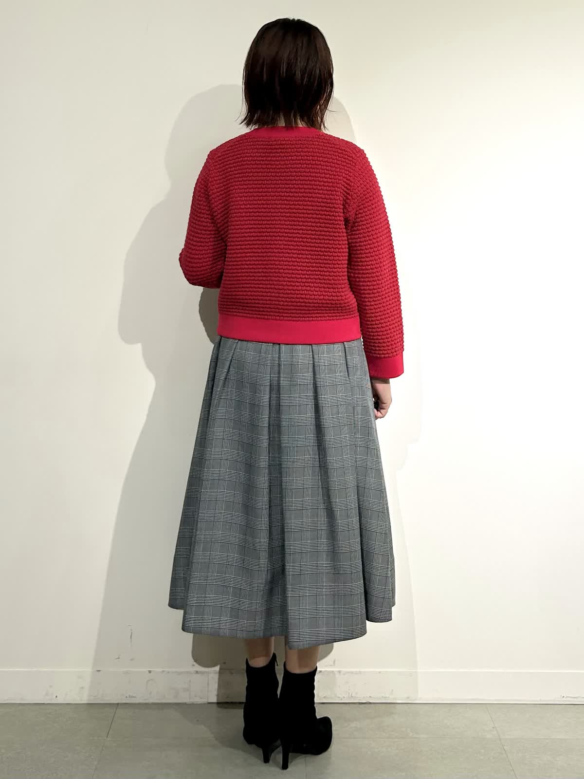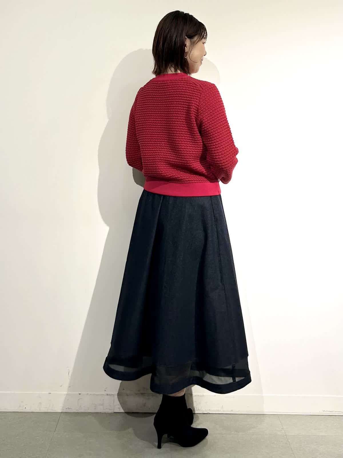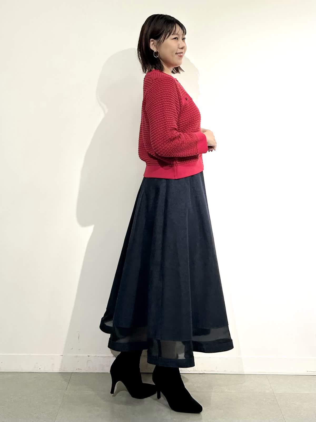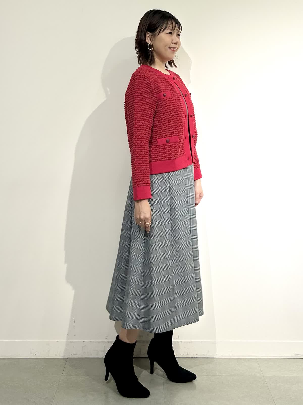 【着用カラー】ニットジャケット:レッド スカート:インディゴ ワンピ: グレンチェク