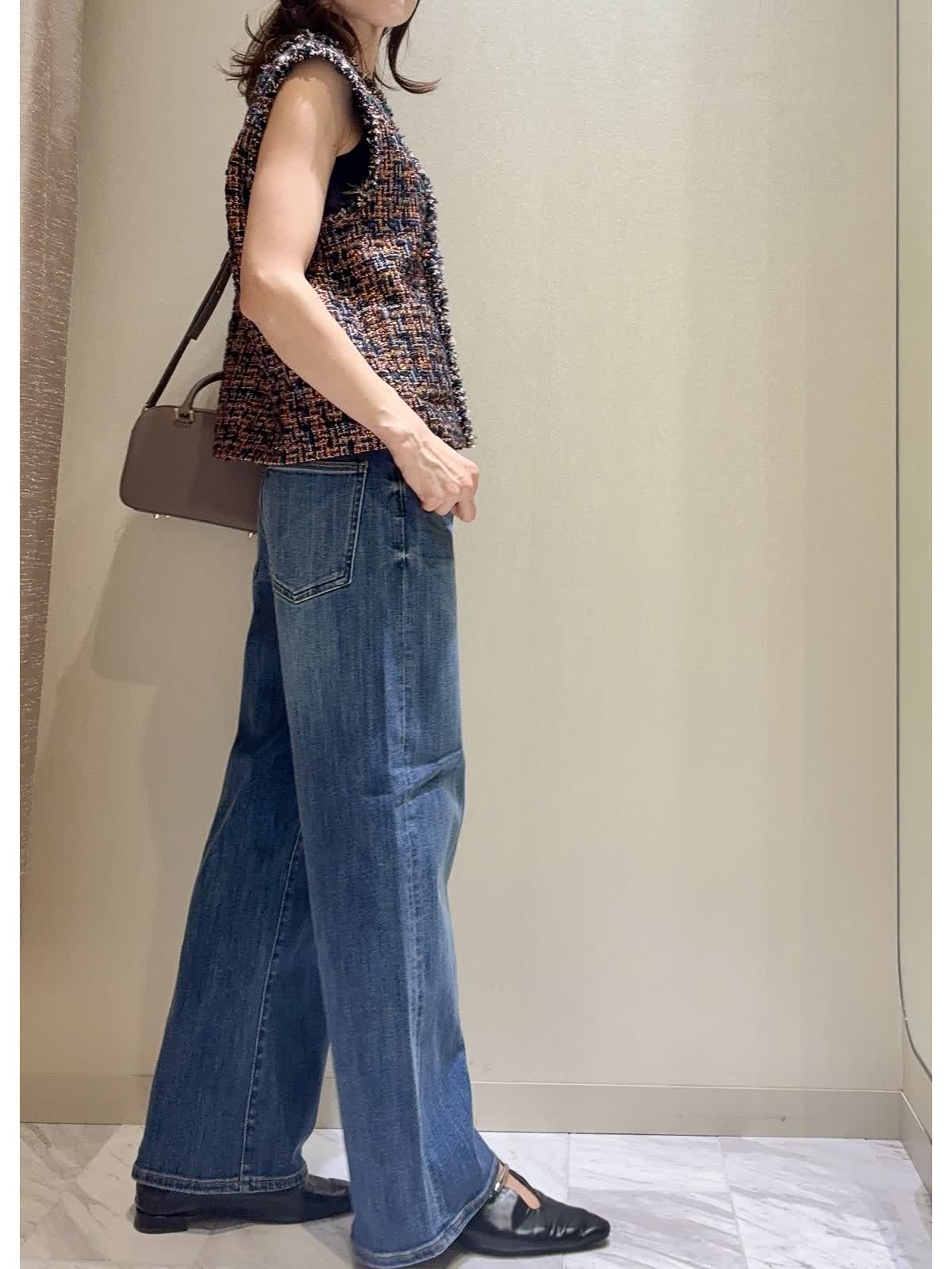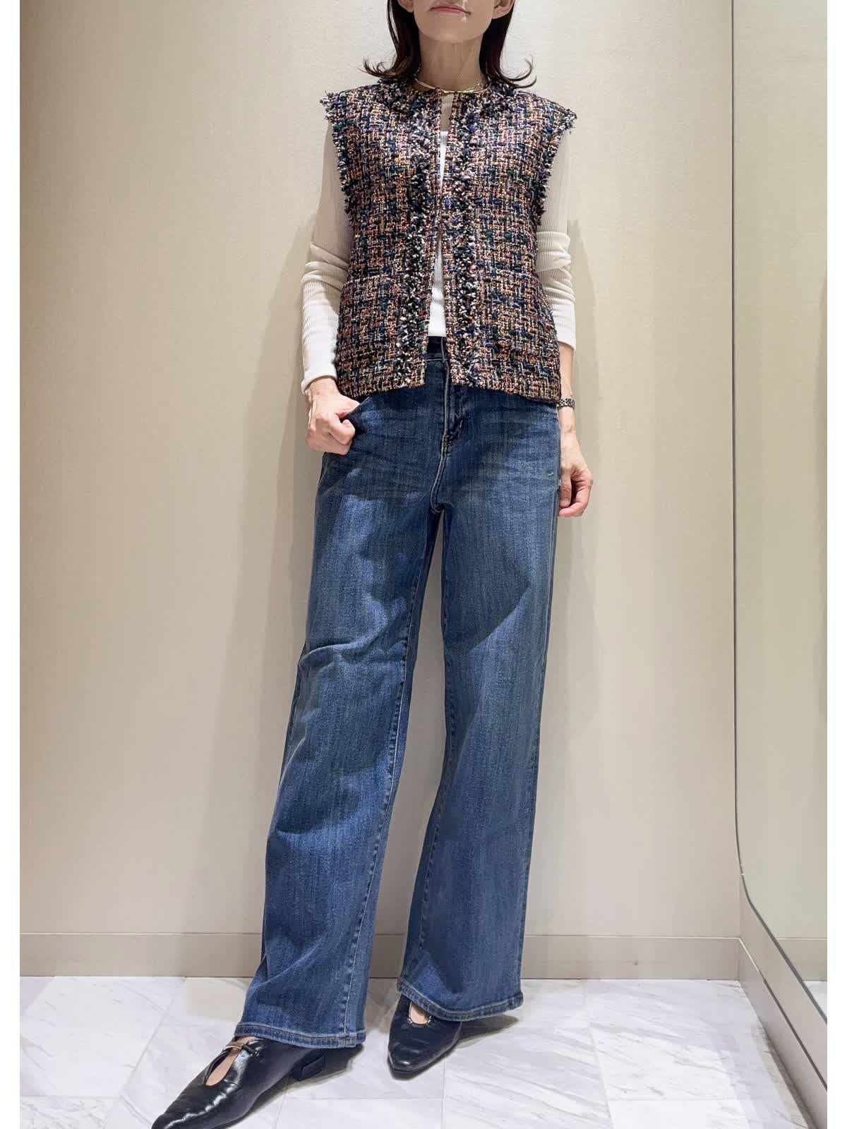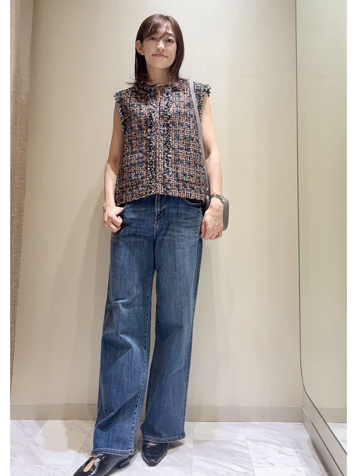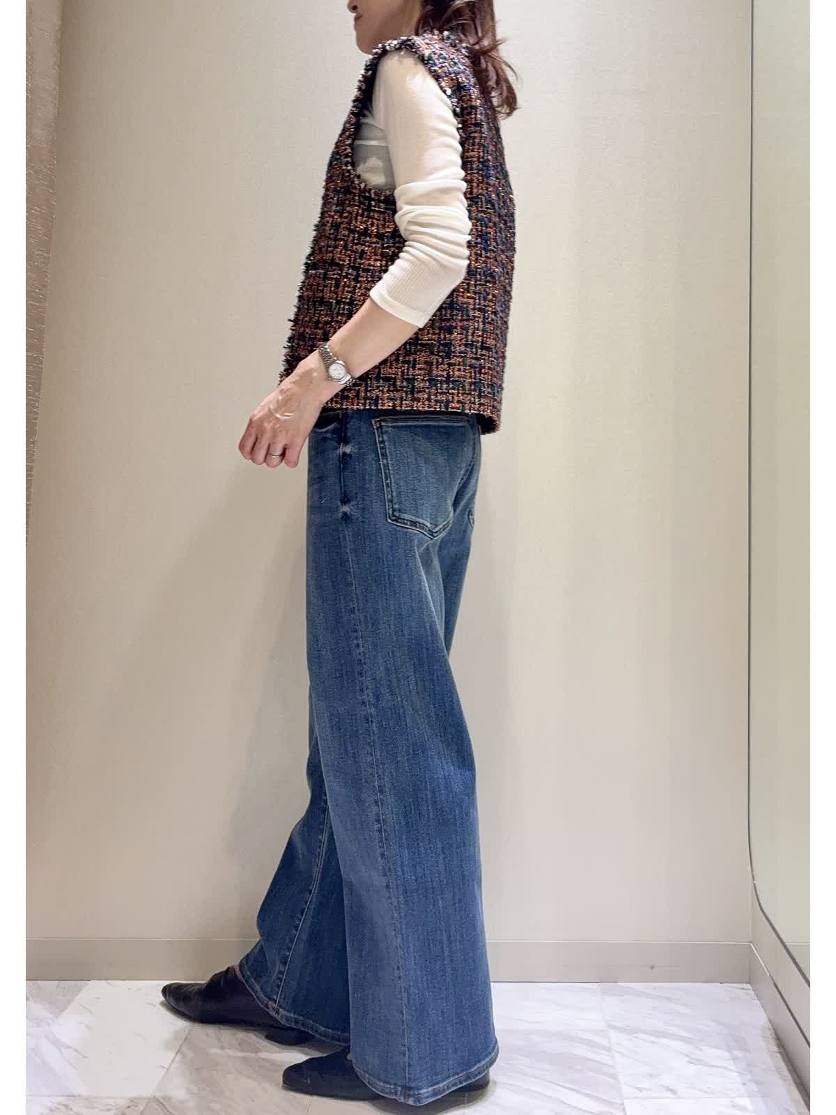 【着用サイズ】全て:9号 【着用カラー】ツイードジレ:ベージュ ニット:オフホワイト バッグ:グレーベージュ 新作ツイードジレのカジュアルスタイルです。 ジレは秋らしい暖かみのあるベージュカラーです。オレンジやグリーンカラーがミックスされており、見た目もとても華やかです。 お休みの日にはデニムを合わせて、ドライブやお出かけにもおすすめです。 気温に合わせて、一枚着としても、ニットやTシャツを重ねて羽織としてもコーディネートを楽しめます。