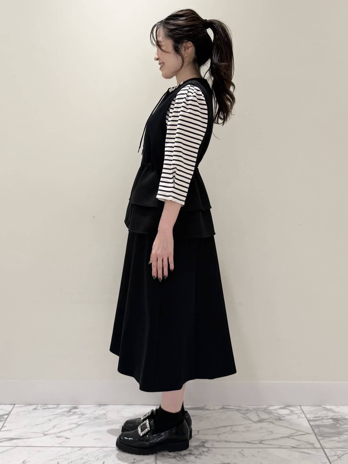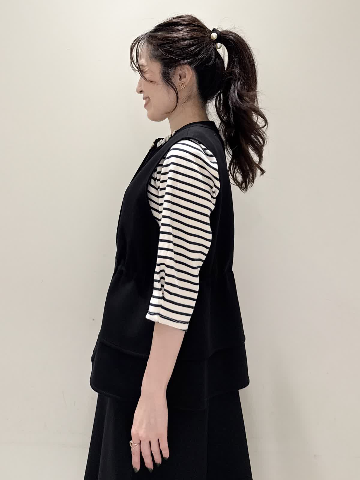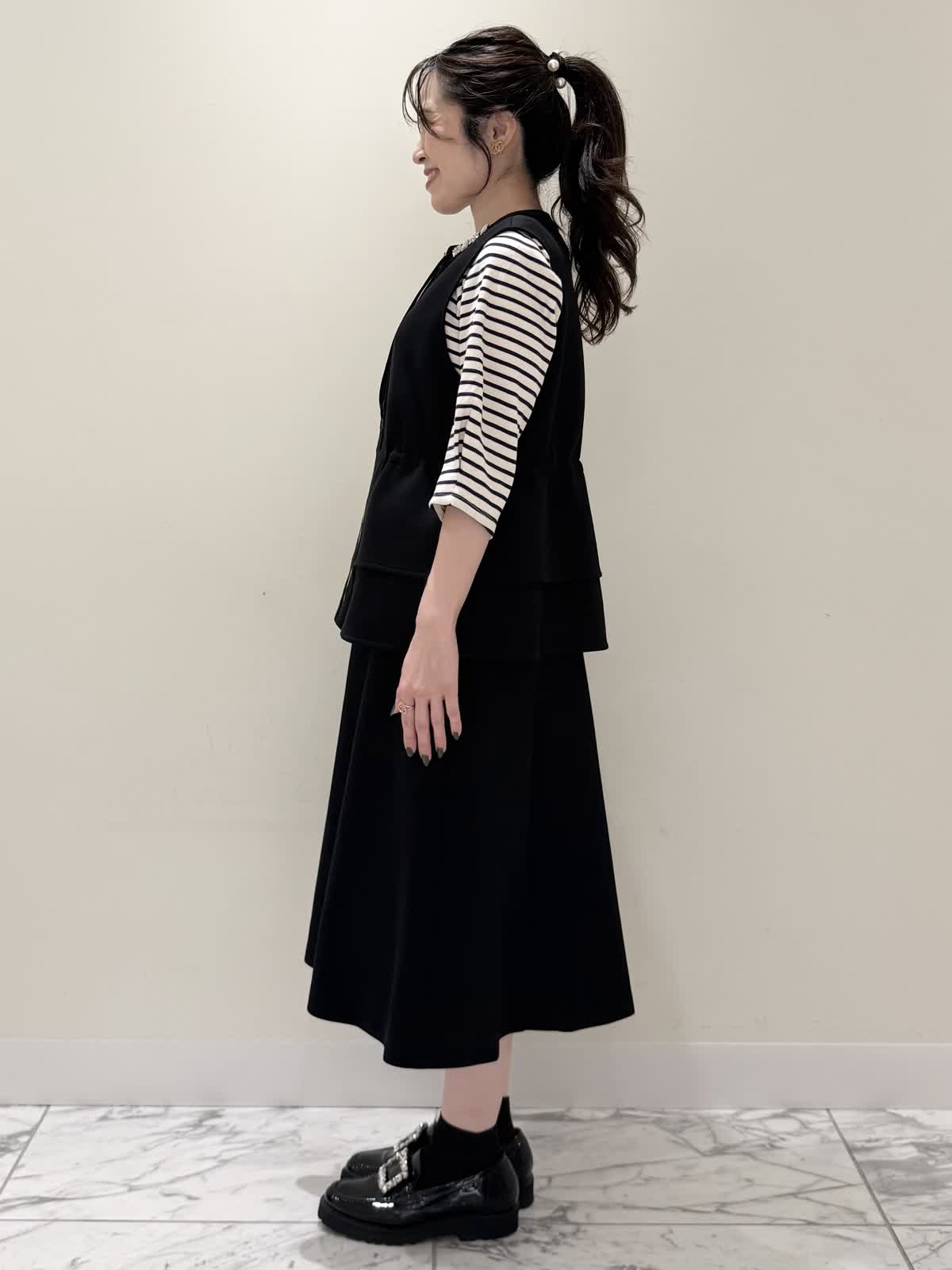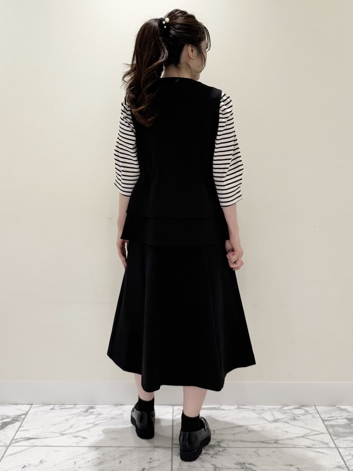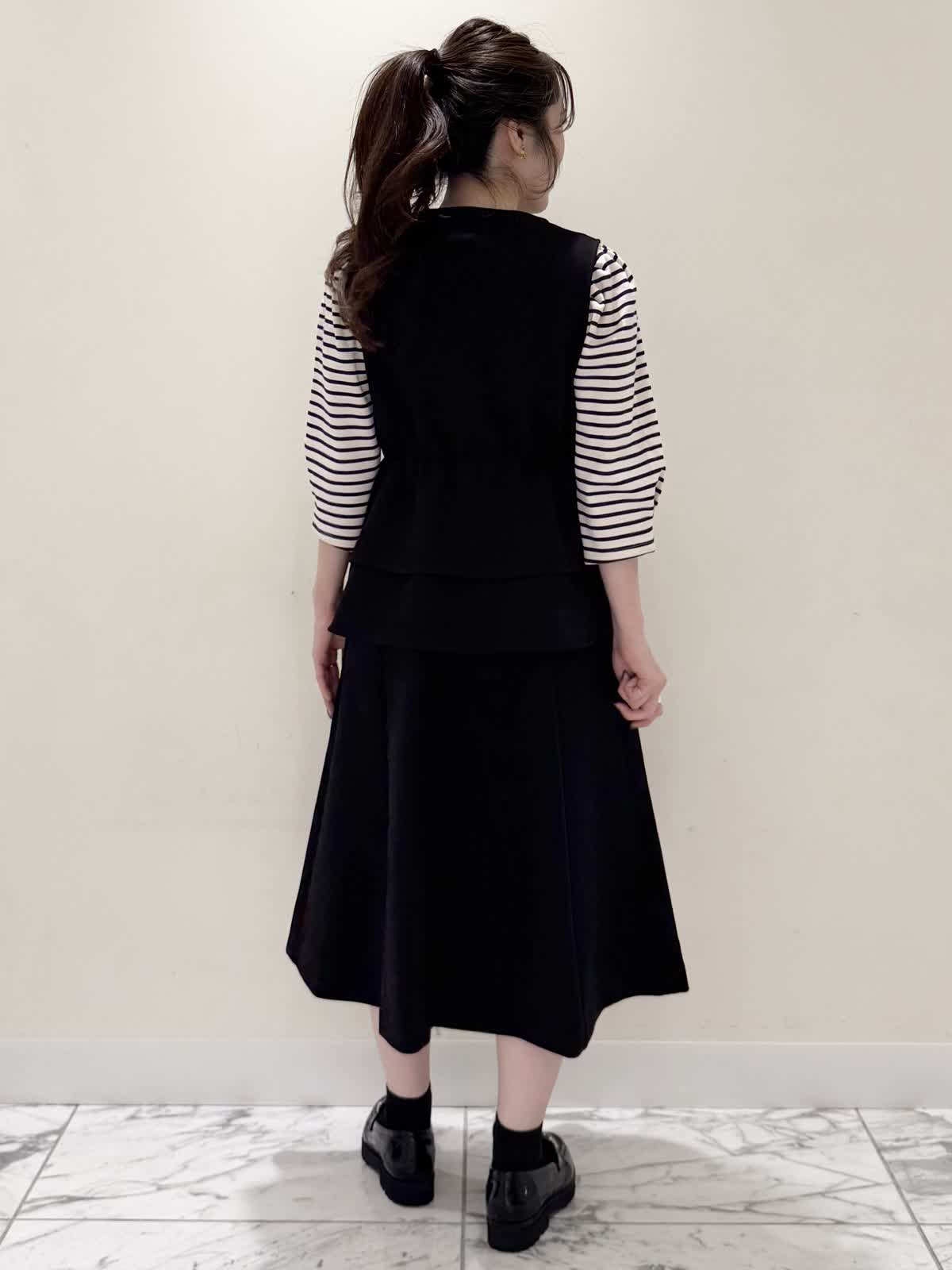 【着用サイズ/カラー】カットソー:7号/アイボリー ジレ?スカート:7号/ブラック ボーダーカットソーを合わせた大人可愛いカジュアルコーディネート♪肩のふわっとしたのが可愛いカットソー。肌あたりが良いコットン生地でアームホールはゆったりしているので着心地◎ジレは内側でウエストを絞れるので前を閉じた時にキュッとウエストマークが入りポイントになります。アームホールがゆったりしているのでレイヤードしやすいです。いつものサイズで大丈夫です。スッキリ着たい方は1サイズ小さめでも◯スカートの後ろゴムは伸び感があり着心地◎履く位置がやや高めなのでコンパクトに感じるかもしれません。腰回りが気になる、程よいゆとりが欲しい方はいつもより1サイズ大きめでも良いかと思います。ツーピースはシワになりにくく、ダンボール生地なので着心地◎綺麗め見えする艶感があるのできちんと感もあるのでインナー次第で雰囲気が変わります。