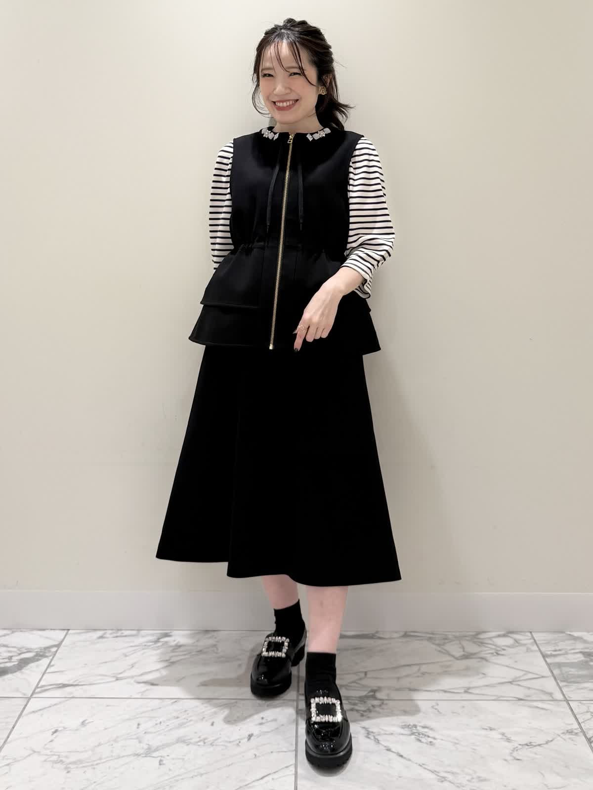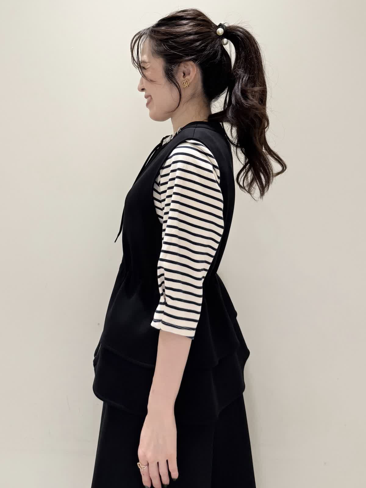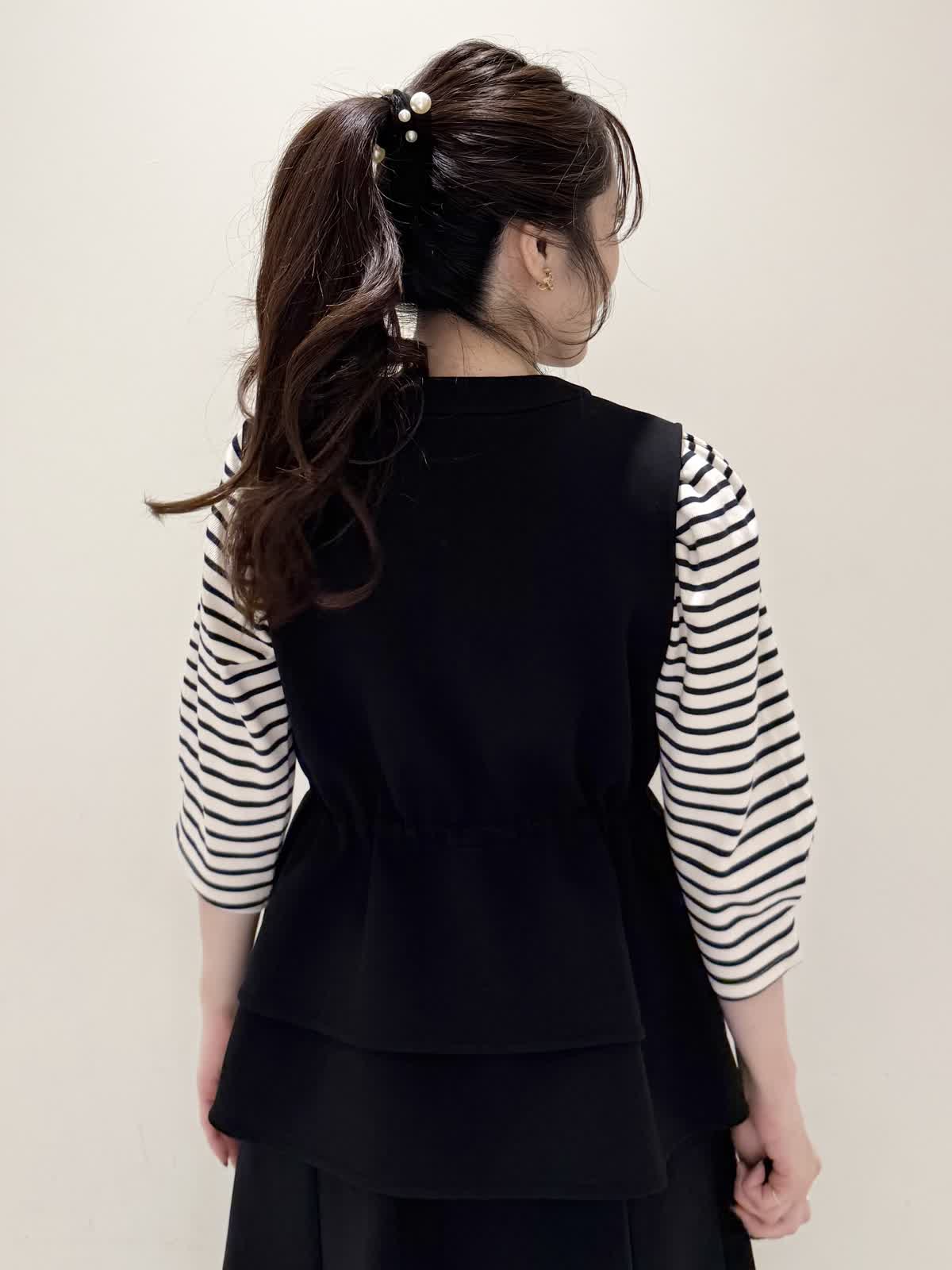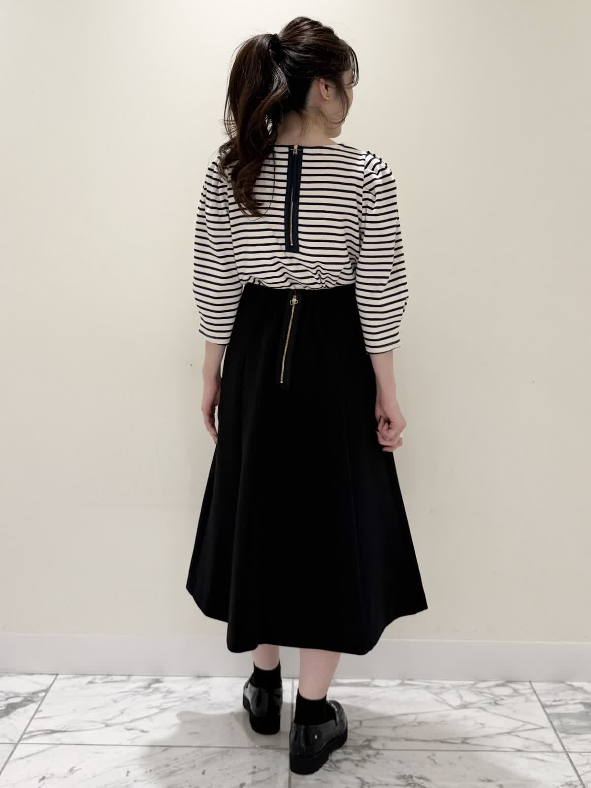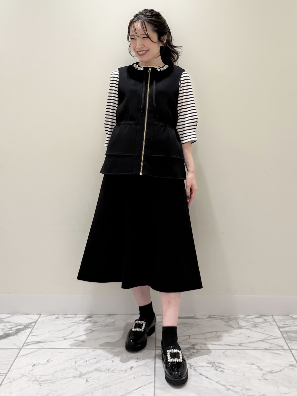 【着用サイズ/カラー】カットソー:7号/アイボリー ジレ?スカート:7号/ブラック ボーダーカットソーを合わせた大人可愛いカジュアルコーディネート♪肩のふわっとしたのが可愛いカットソー。肌あたりが良いコットン生地でアームホールはゆったりしているので着心地◎ジレは内側でウエストを絞れるので前を閉じた時にキュッとウエストマークが入りポイントになります。アームホールがゆったりしているのでレイヤードしやすいです。いつものサイズで大丈夫です。スッキリ着たい方は1サイズ小さめでも◯スカートの後ろゴムは伸び感があり着心地◎履く位置がやや高めなのでコンパクトに感じるかもしれません。腰回りが気になる、程よいゆとりが欲しい方はいつもより1サイズ大きめでも良いかと思います。ツーピースはシワになりにくく、ダンボール生地なので着心地◎綺麗め見えする艶感があるのできちんと感もあるのでインナー次第で雰囲気が変わります。