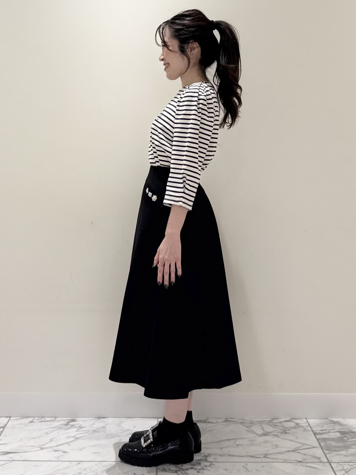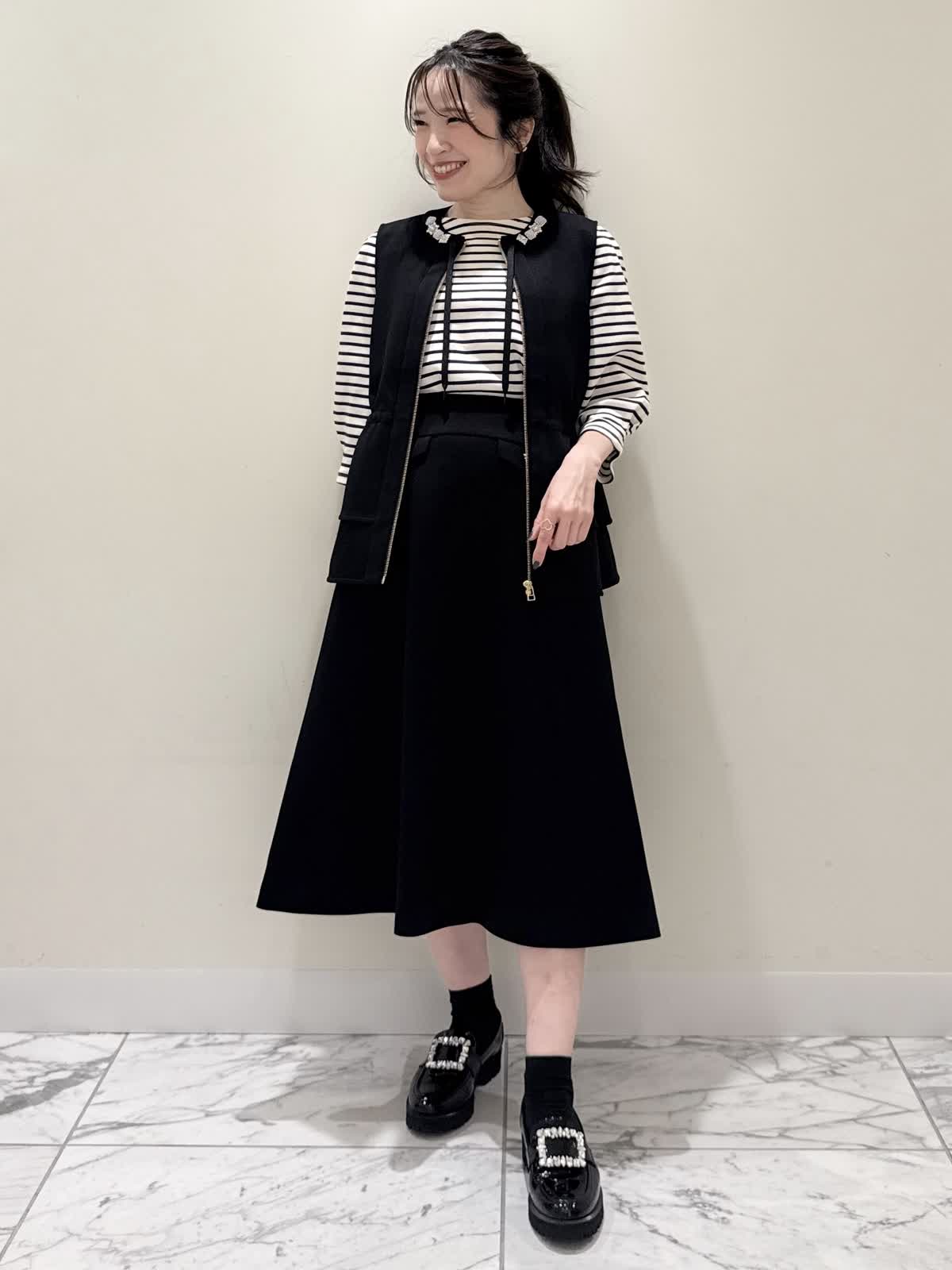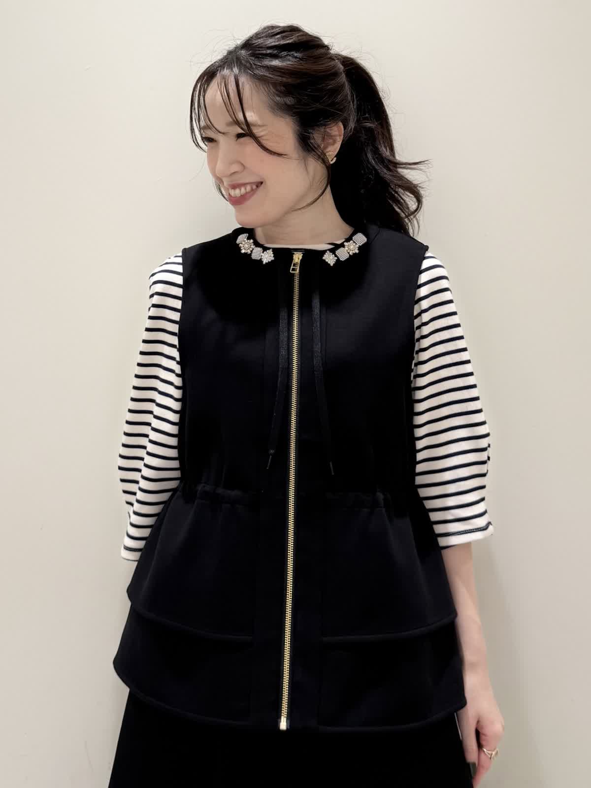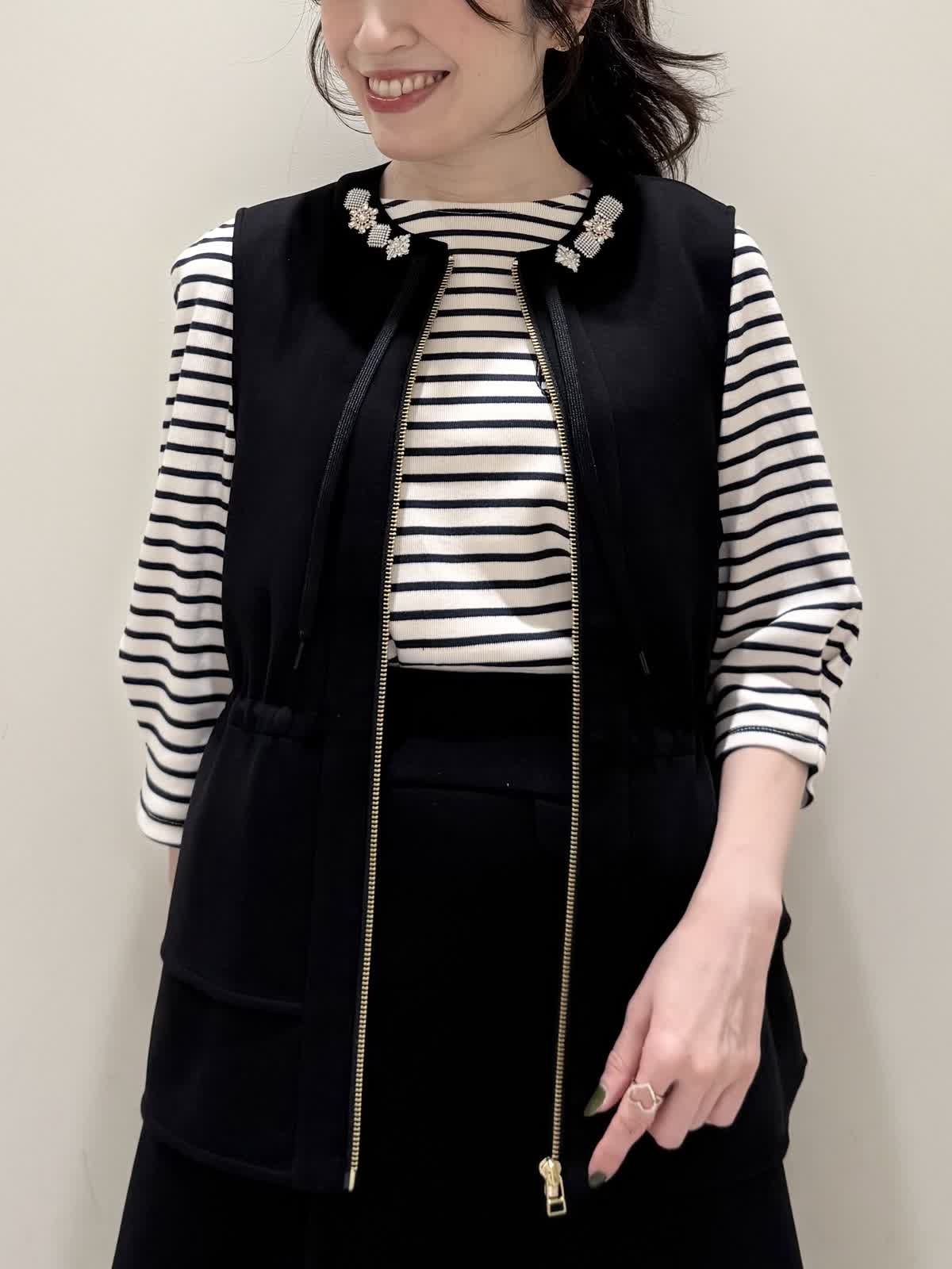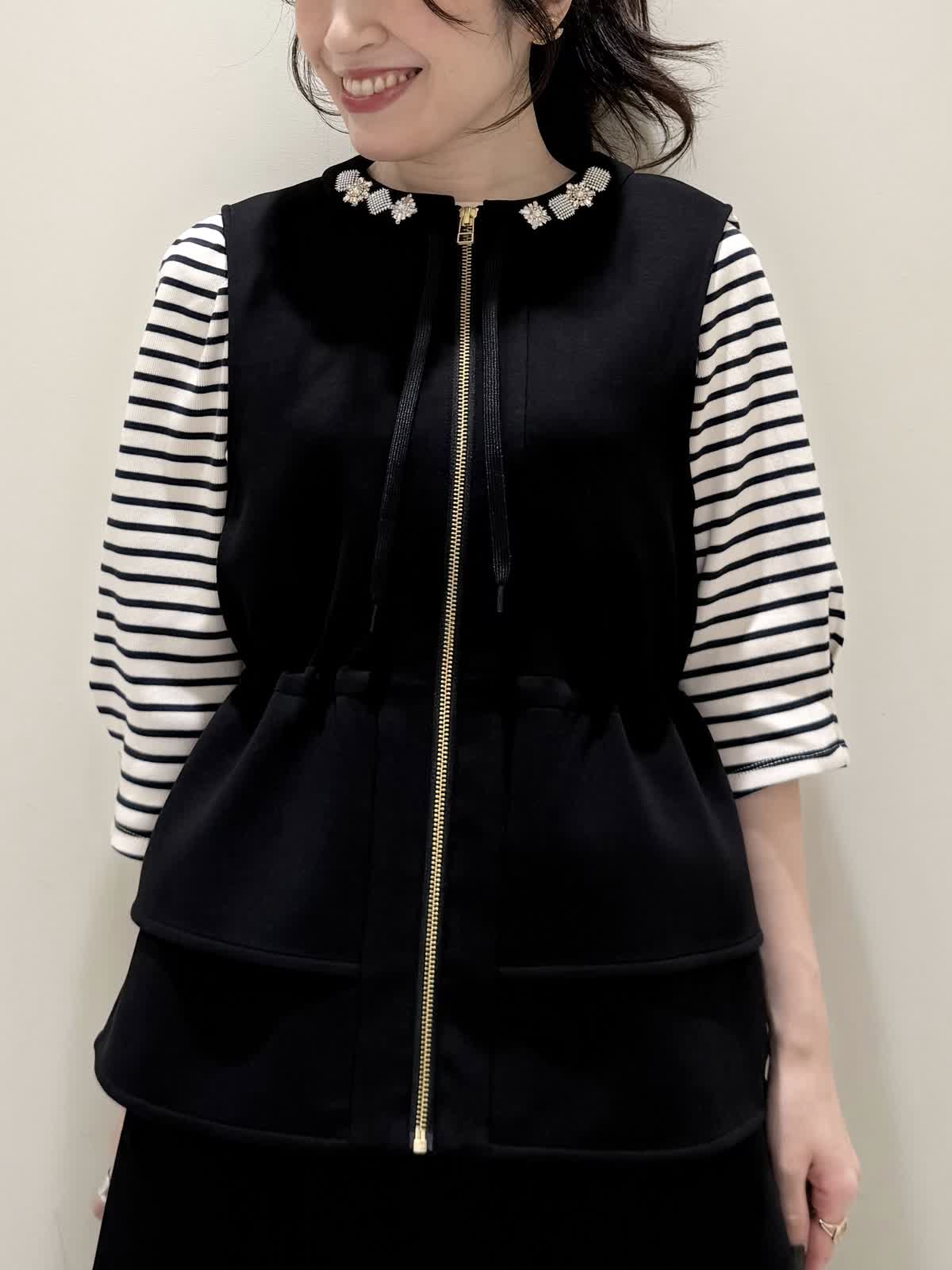 【着用サイズ/カラー】カットソー:7号/アイボリー ジレ?スカート:7号/ブラック ボーダーカットソーを合わせた大人可愛いカジュアルコーディネート♪肩のふわっとしたのが可愛いカットソー。肌あたりが良いコットン生地でアームホールはゆったりしているので着心地◎ジレは内側でウエストを絞れるので前を閉じた時にキュッとウエストマークが入りポイントになります。アームホールがゆったりしているのでレイヤードしやすいです。いつものサイズで大丈夫です。スッキリ着たい方は1サイズ小さめでも◯スカートの後ろゴムは伸び感があり着心地◎履く位置がやや高めなのでコンパクトに感じるかもしれません。腰回りが気になる、程よいゆとりが欲しい方はいつもより1サイズ大きめでも良いかと思います。ツーピースはシワになりにくく、ダンボール生地なので着心地◎綺麗め見えする艶感があるのできちんと感もあるのでインナー次第で雰囲気が変わります。