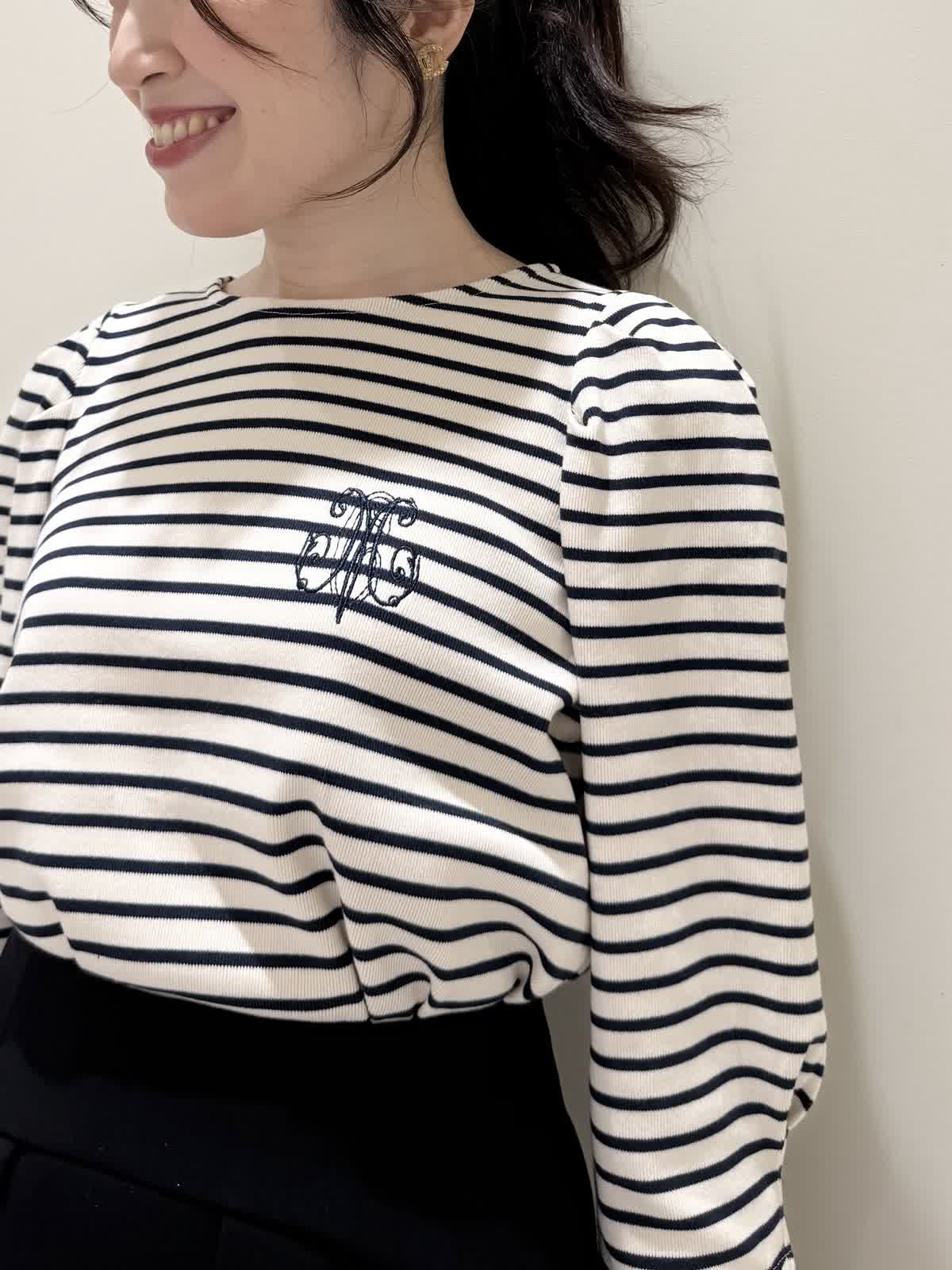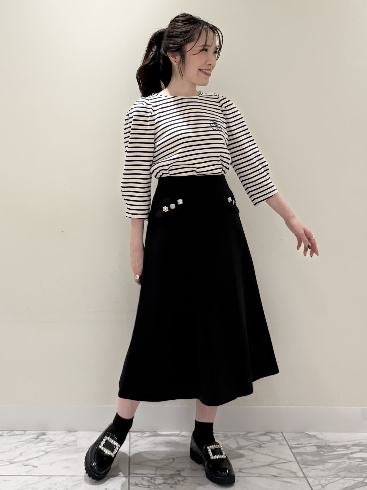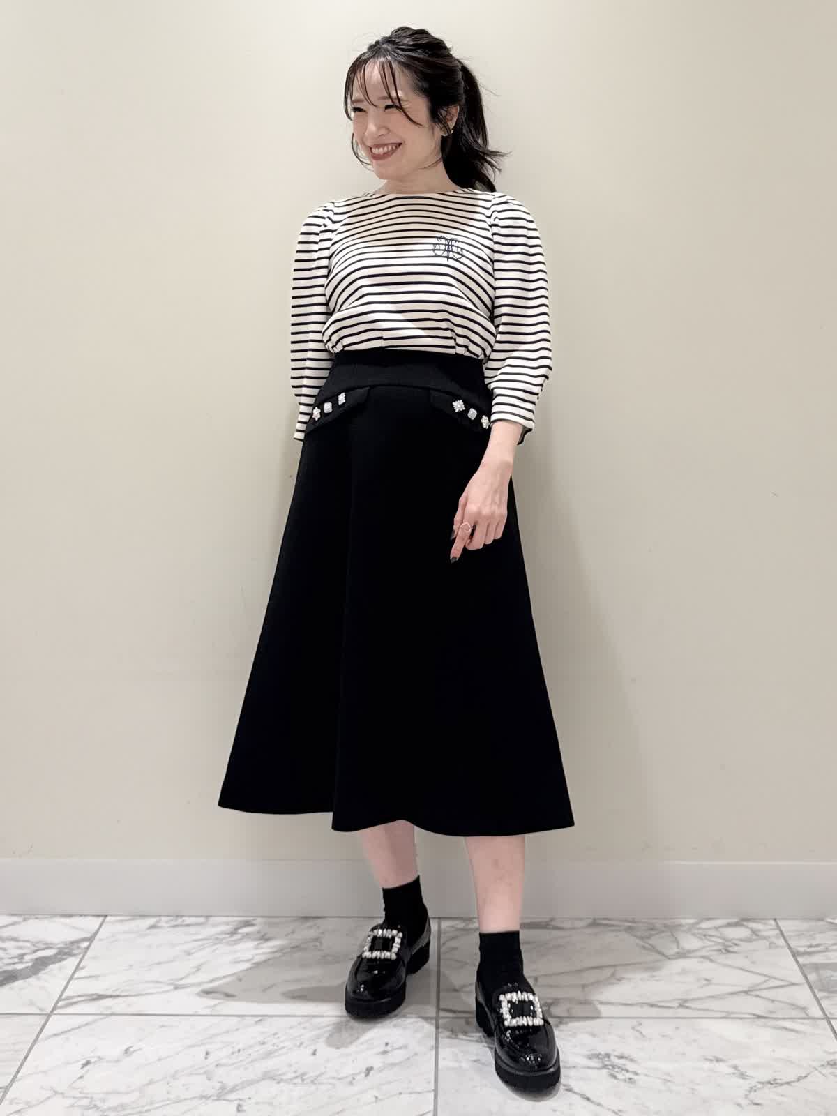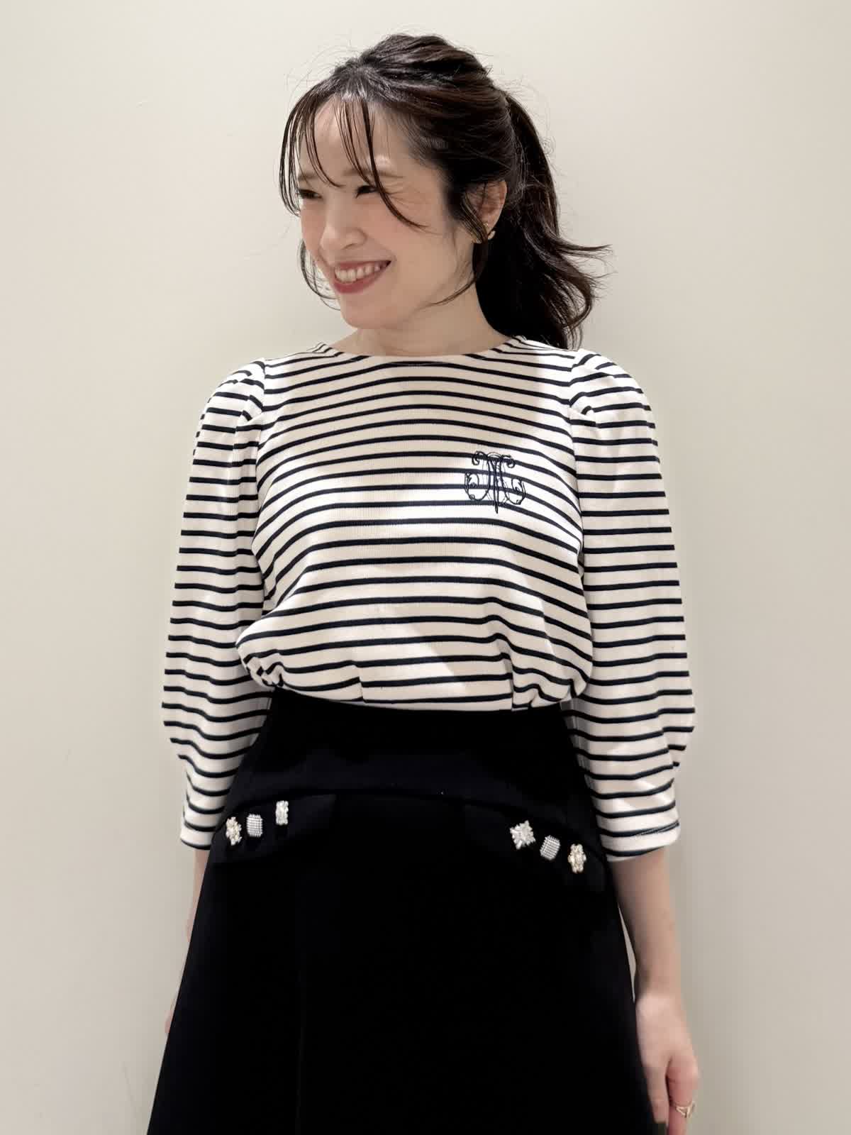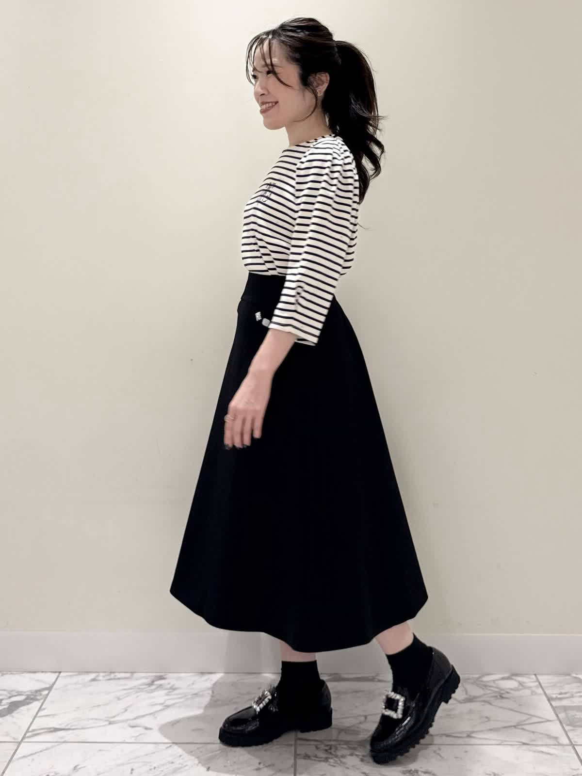 【着用サイズ/カラー】カットソー:7号/アイボリー ジレ?スカート:7号/ブラック ボーダーカットソーを合わせた大人可愛いカジュアルコーディネート♪肩のふわっとしたのが可愛いカットソー。肌あたりが良いコットン生地でアームホールはゆったりしているので着心地◎ジレは内側でウエストを絞れるので前を閉じた時にキュッとウエストマークが入りポイントになります。アームホールがゆったりしているのでレイヤードしやすいです。いつものサイズで大丈夫です。スッキリ着たい方は1サイズ小さめでも◯スカートの後ろゴムは伸び感があり着心地◎履く位置がやや高めなのでコンパクトに感じるかもしれません。腰回りが気になる、程よいゆとりが欲しい方はいつもより1サイズ大きめでも良いかと思います。ツーピースはシワになりにくく、ダンボール生地なので着心地◎綺麗め見えする艶感があるのできちんと感もあるのでインナー次第で雰囲気が変わります。