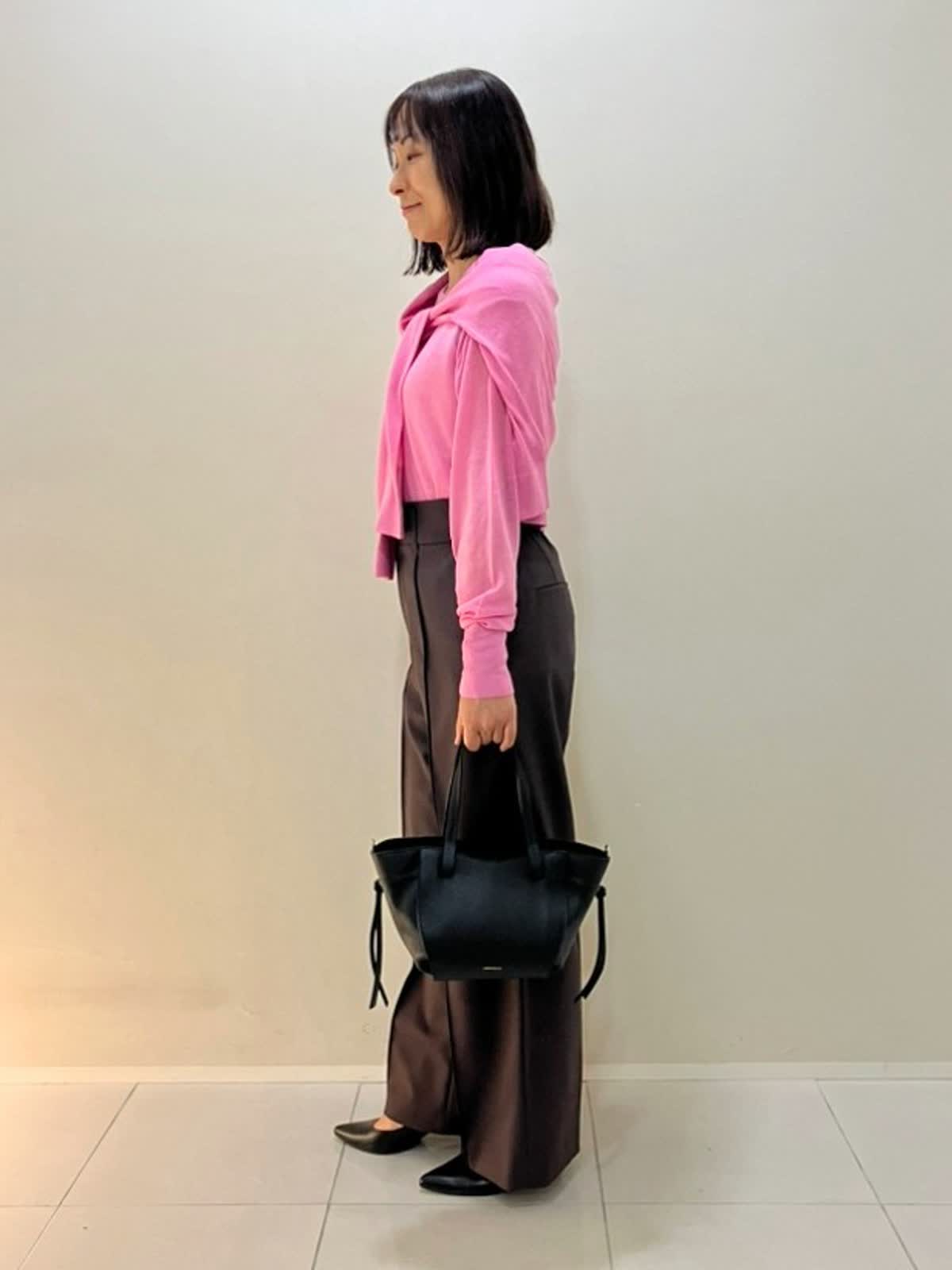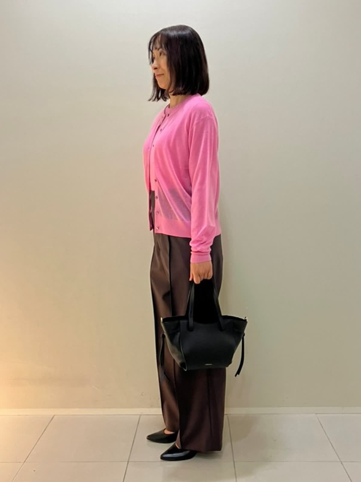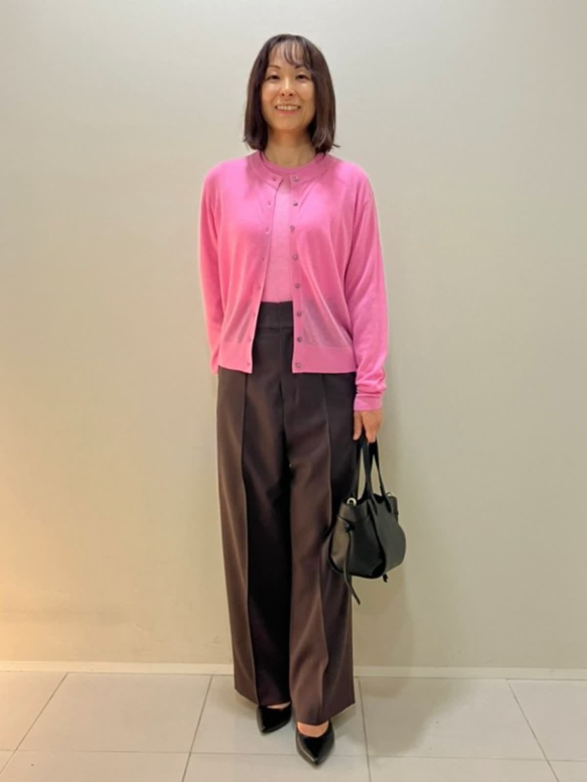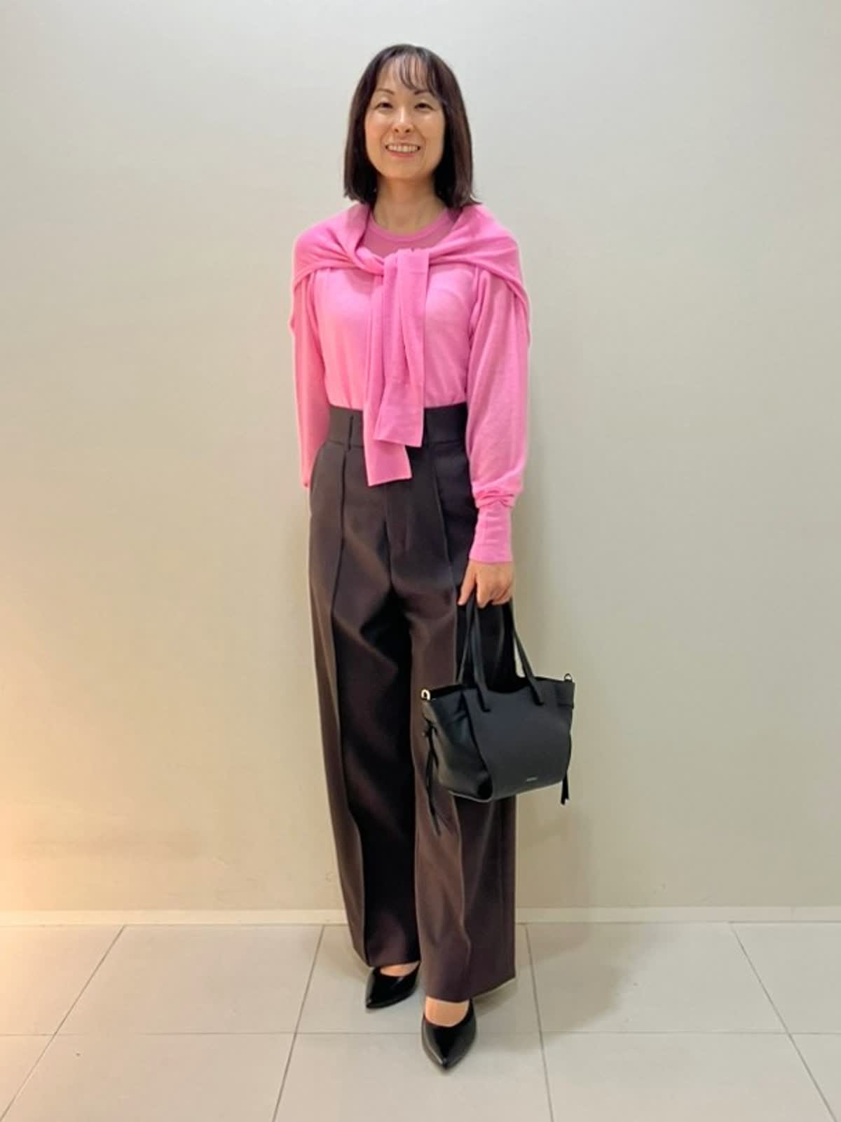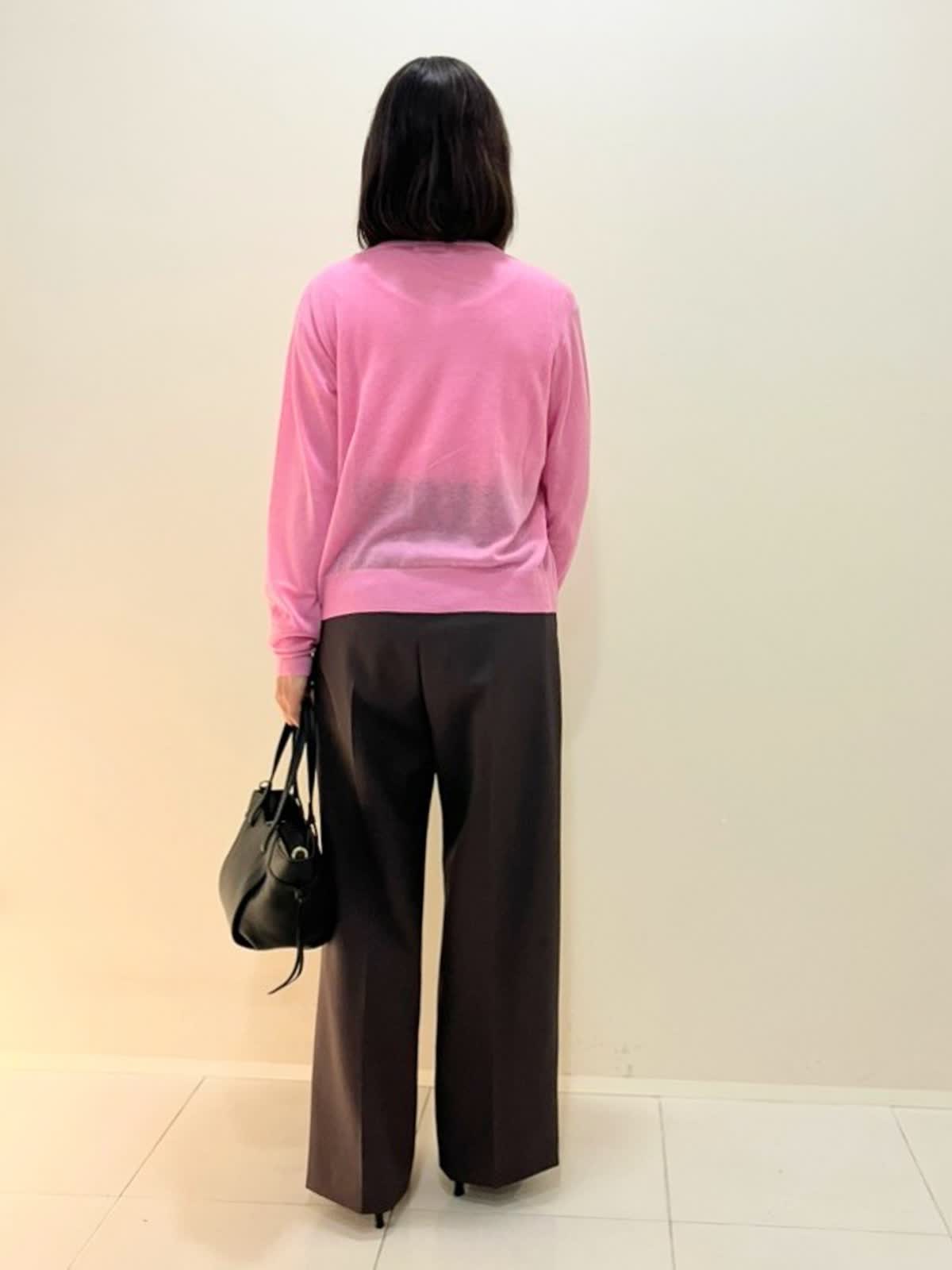 【着用サイズ】カーディガン:フリー ニット:フリー パンツ:9号【着用カラー】カーディガン:ピンク ニット:ピンク パンツ:ブラウン 休日のお買い物スタイル 鮮やかなピンクのシアーニットは、肌触りが良く軽い着心地。適度な透け感が上品なアイテムです。ハイウエストのキレイめワイドパンツは、ウエストゴム仕様なので見た目よりも楽に着ていただけます。