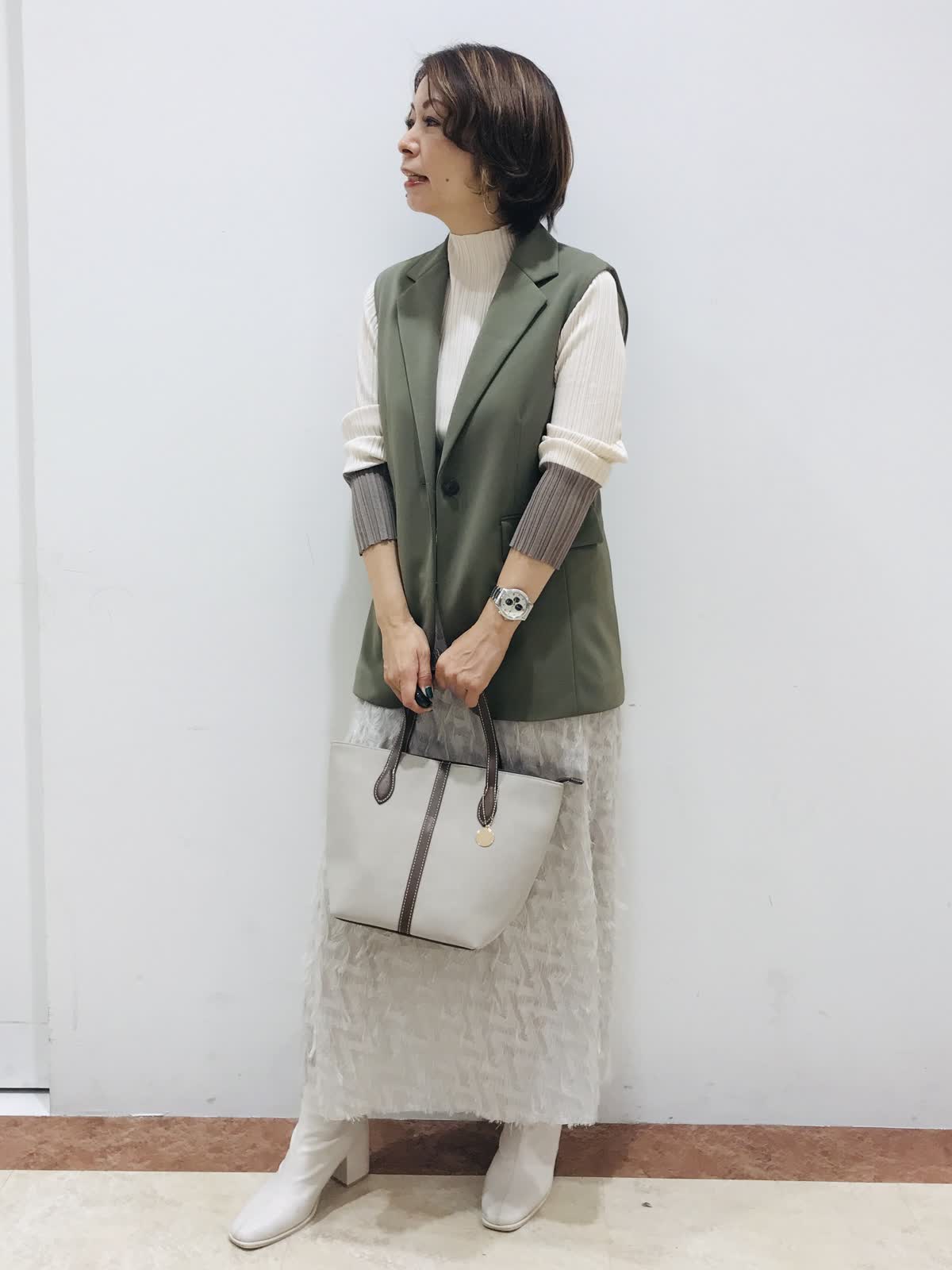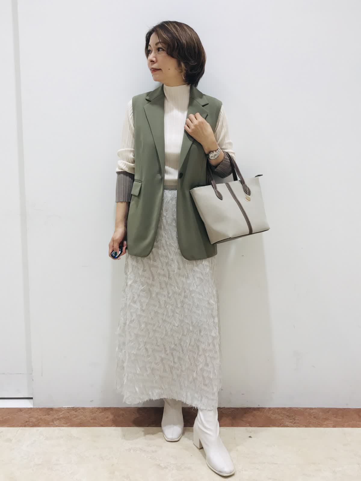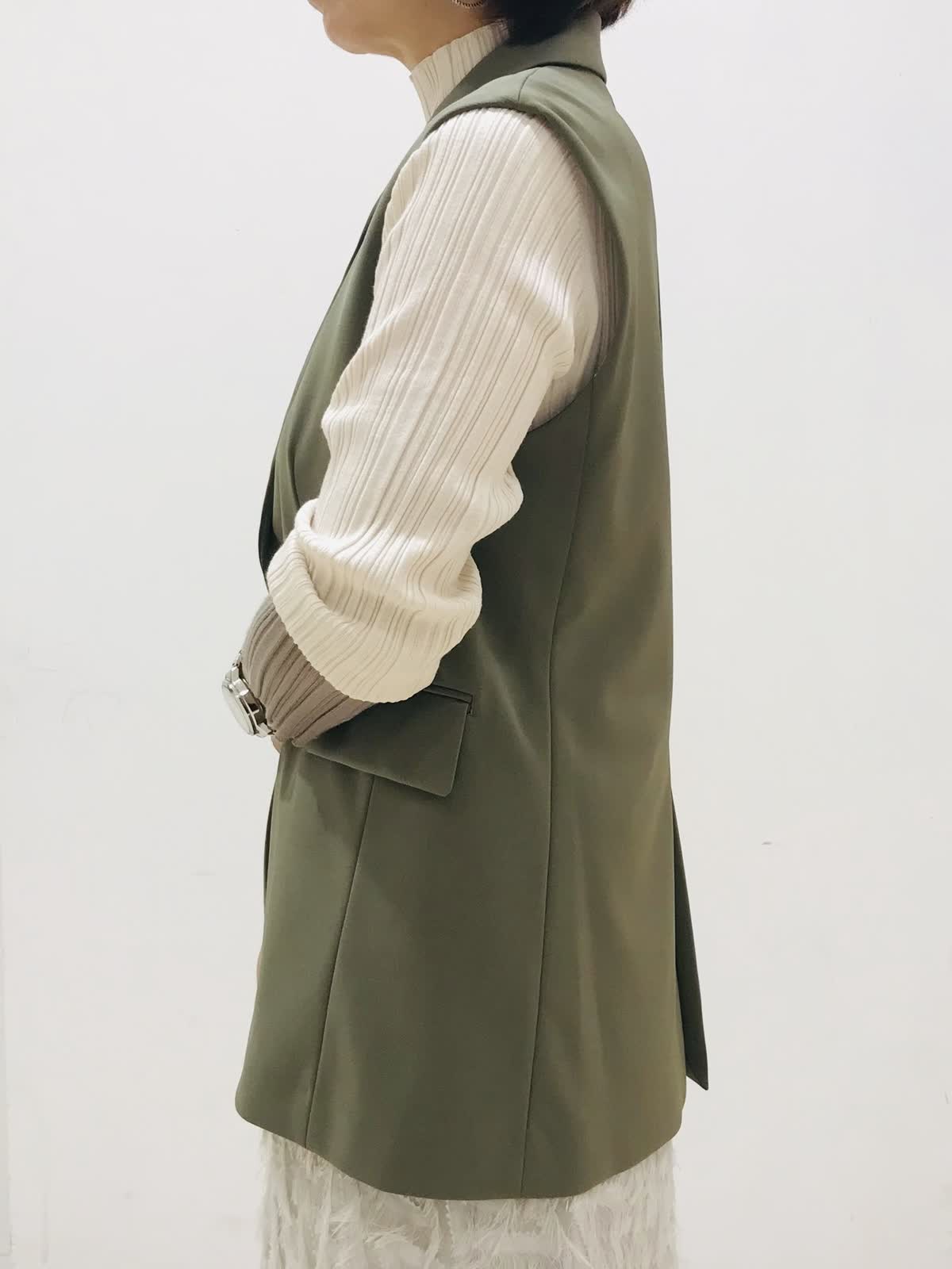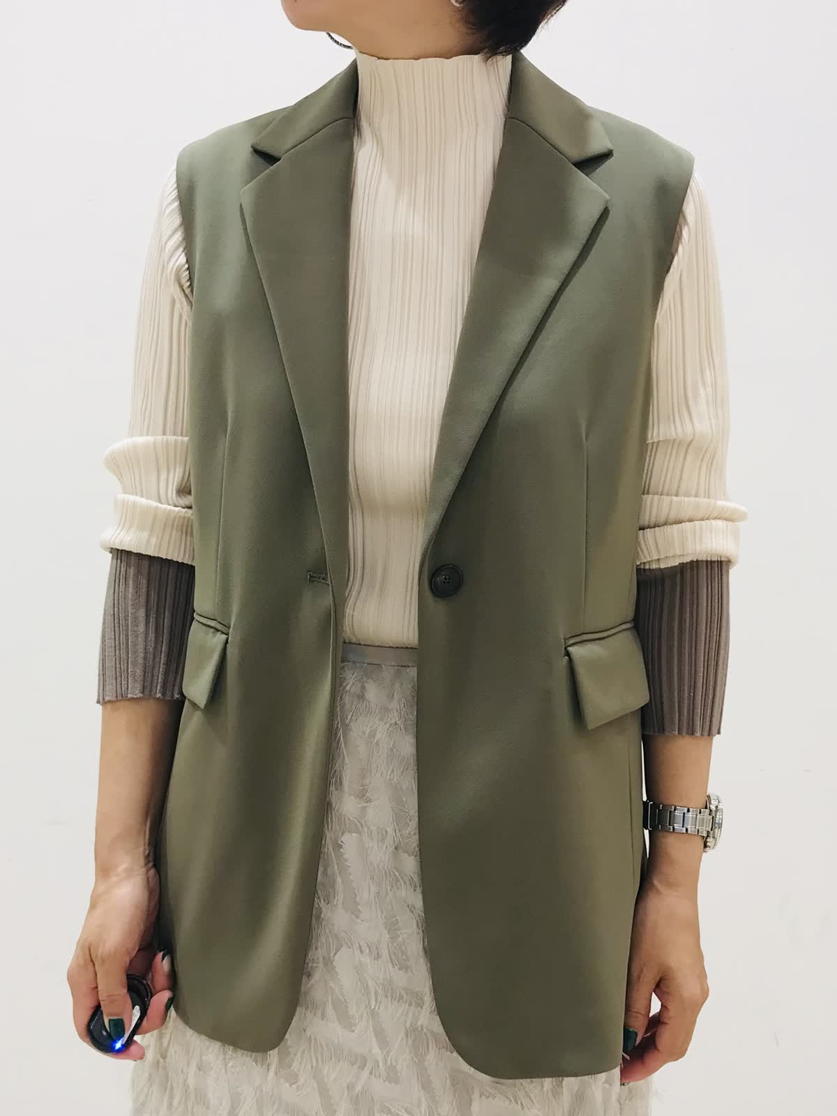 【着用カラー】ジレ:カーキ ニット:アイボリー スカート:グレー 秋のジレスタイリング オールシーズン着られるテーラードジレ。高級感のある光沢感とストレッチ性に優れた素材が嬉しい旬のジレですよ。インナーに程よいフィット感のあるリブニットを合わせロングスカートでコーディネートしました。