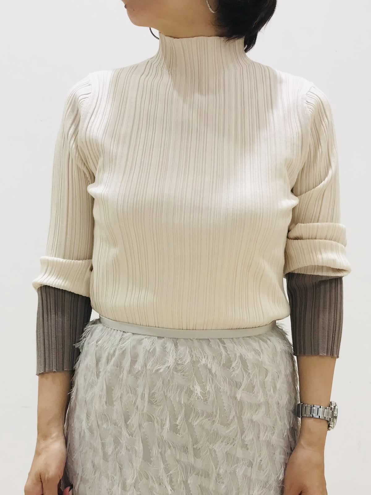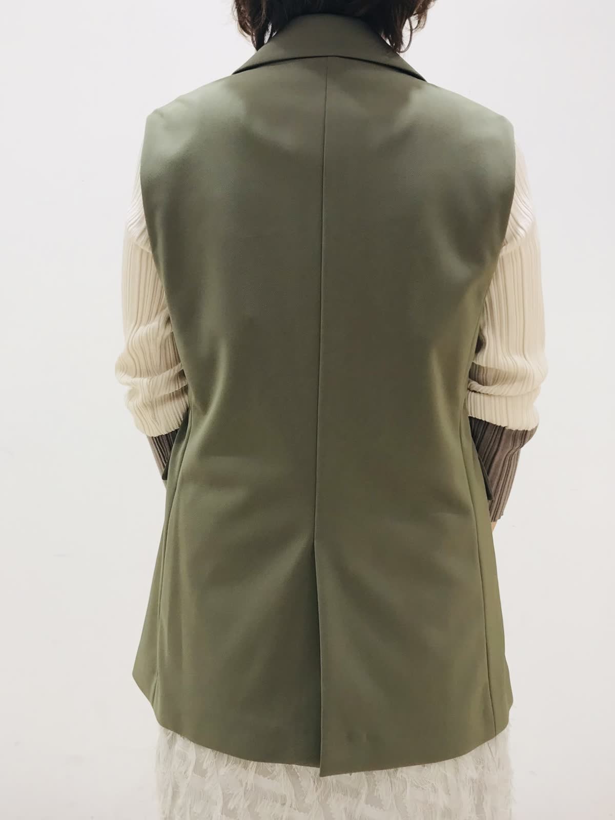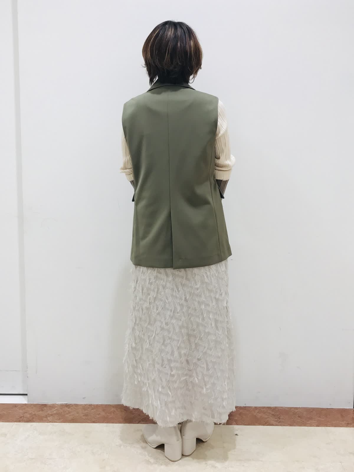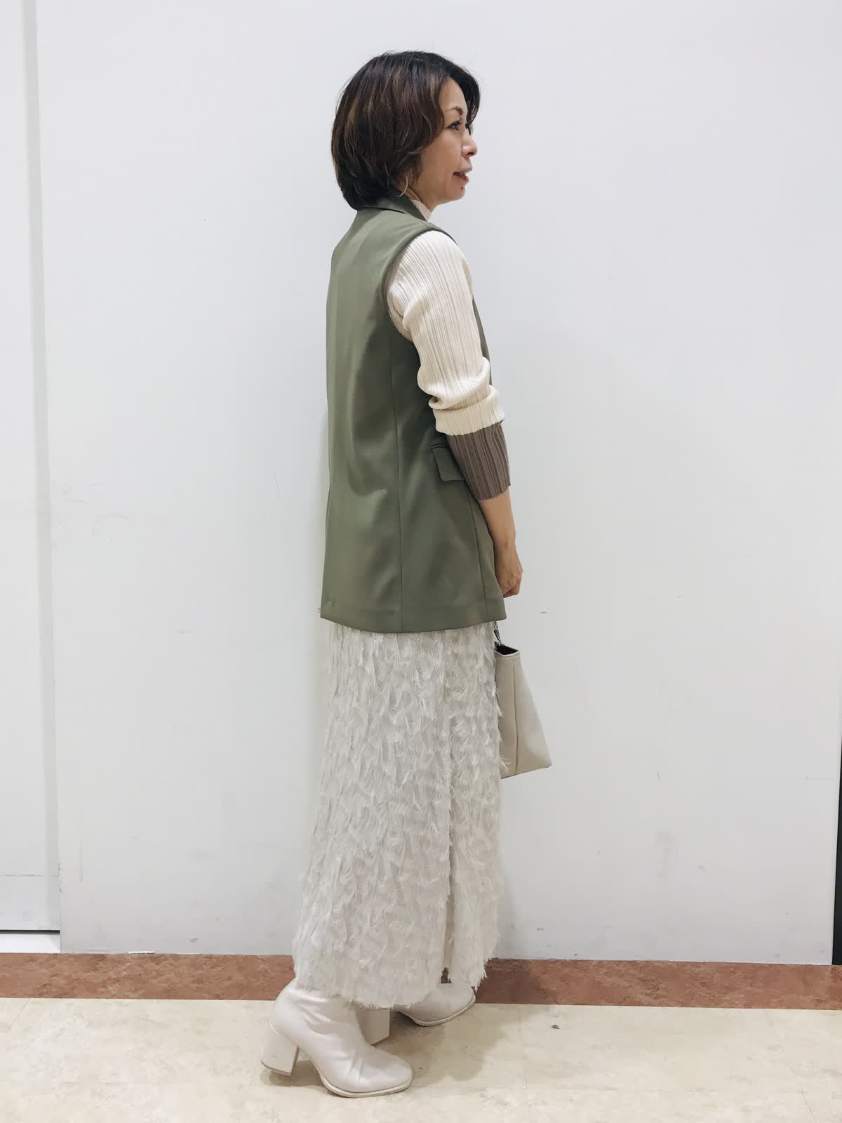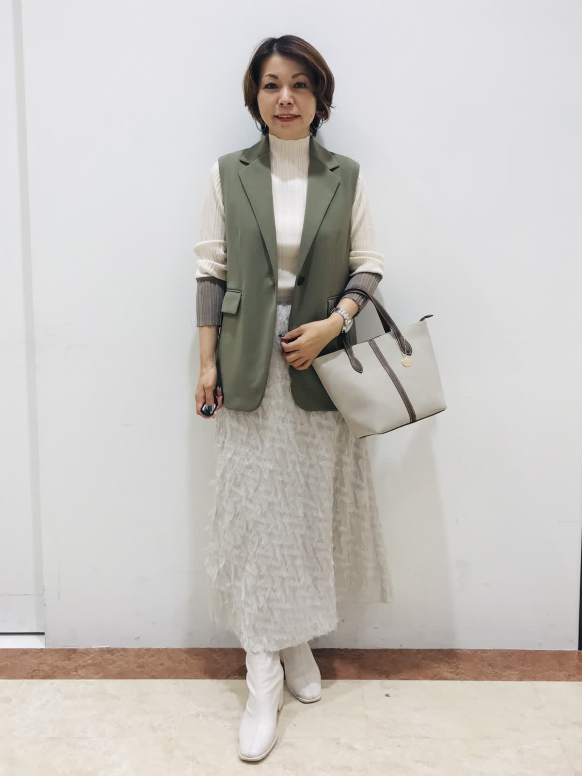 【着用カラー】ジレ:カーキ ニット:アイボリー スカート:グレー 秋のジレスタイリング オールシーズン着られるテーラードジレ。高級感のある光沢感とストレッチ性に優れた素材が嬉しい旬のジレですよ。インナーに程よいフィット感のあるリブニットを合わせロングスカートでコーディネートしました。