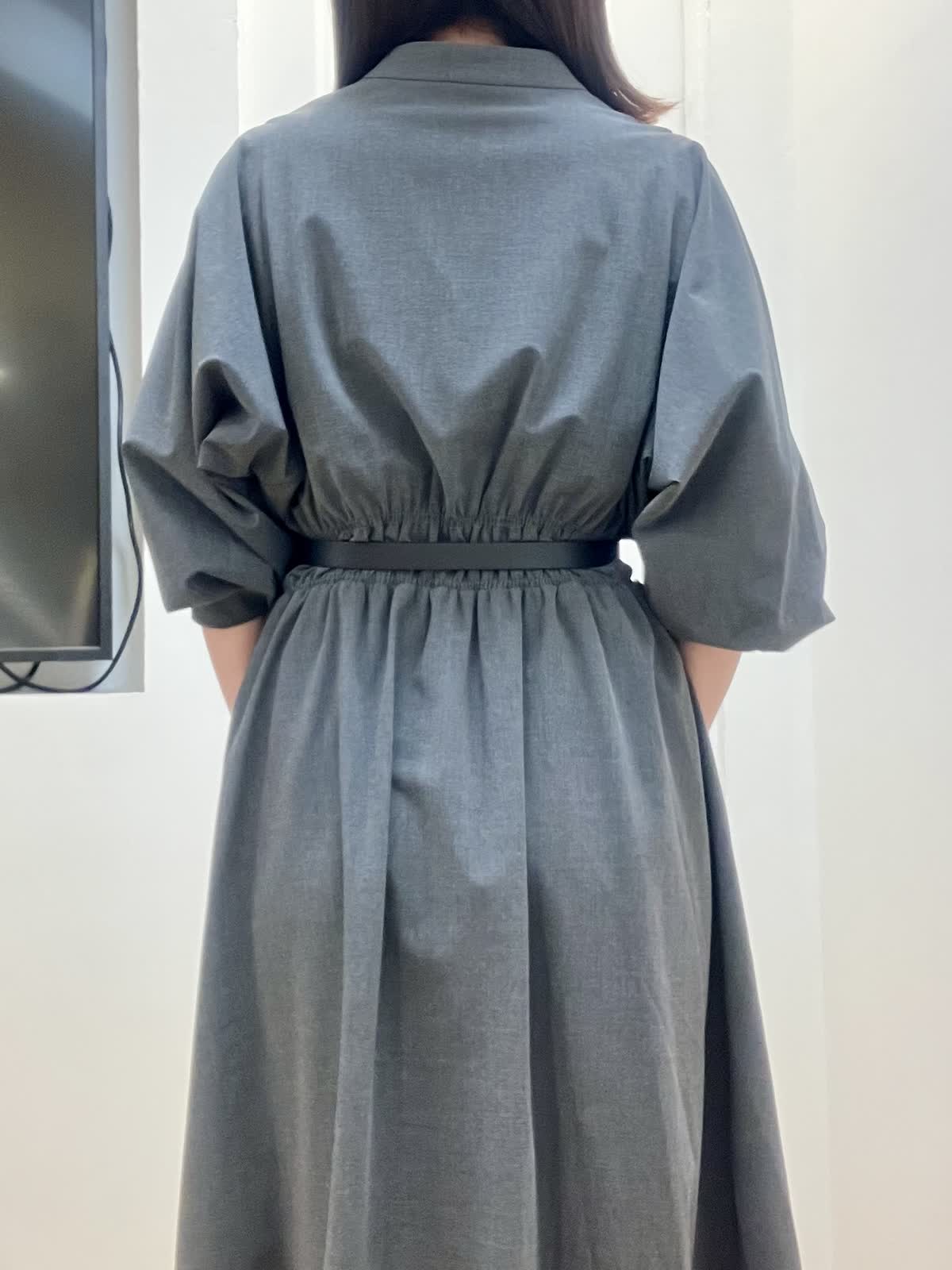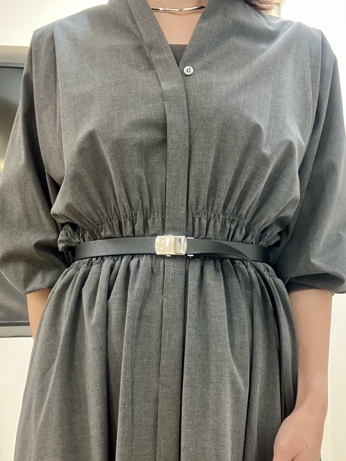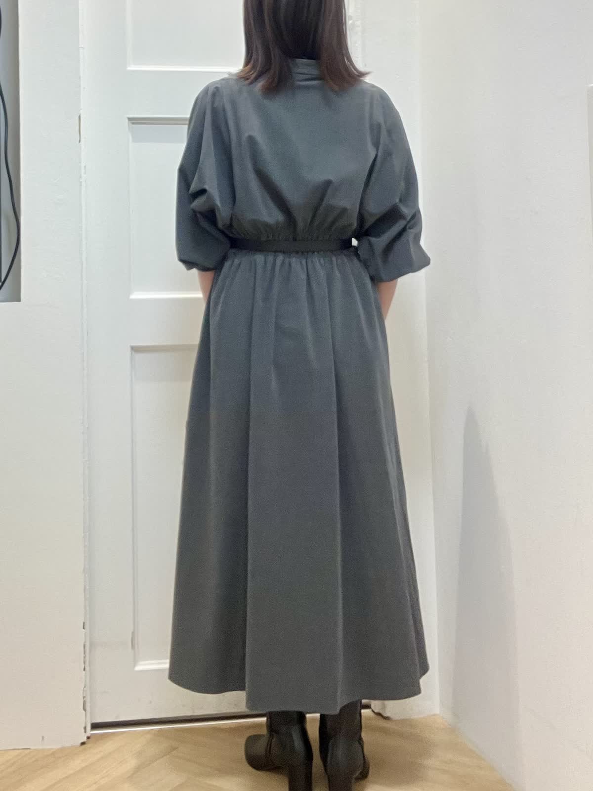【着用サイズ】全て9号 【着用カラー】ワンピース:グレー ウエストギャザーがポイントのワンピース。 腰位置が高く見えてスタイルアップ! サラッとした着心地で、インナーにニット合わせも可愛いので、秋?春まで長いシーズン着回して頂けます。裾まで前開きなのでパンツ合わせ等のレイヤードも楽しめます。 黒のベルトとブーツでシックにまとめました。