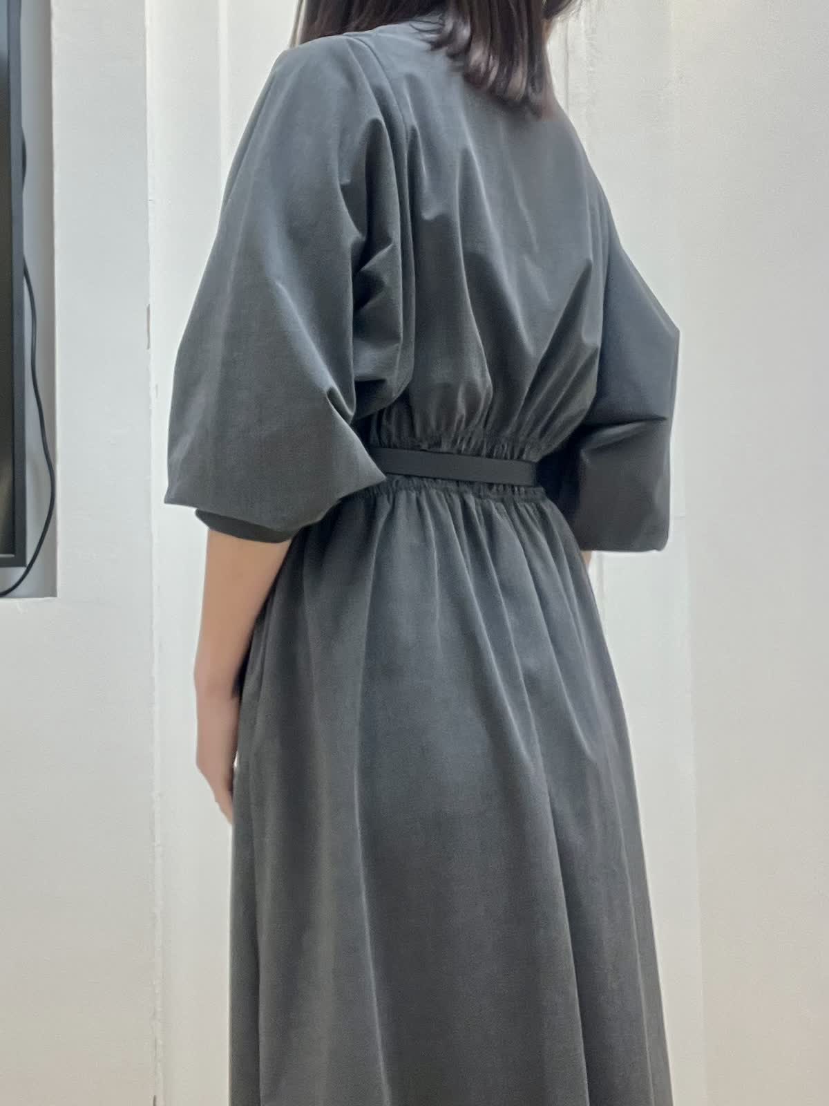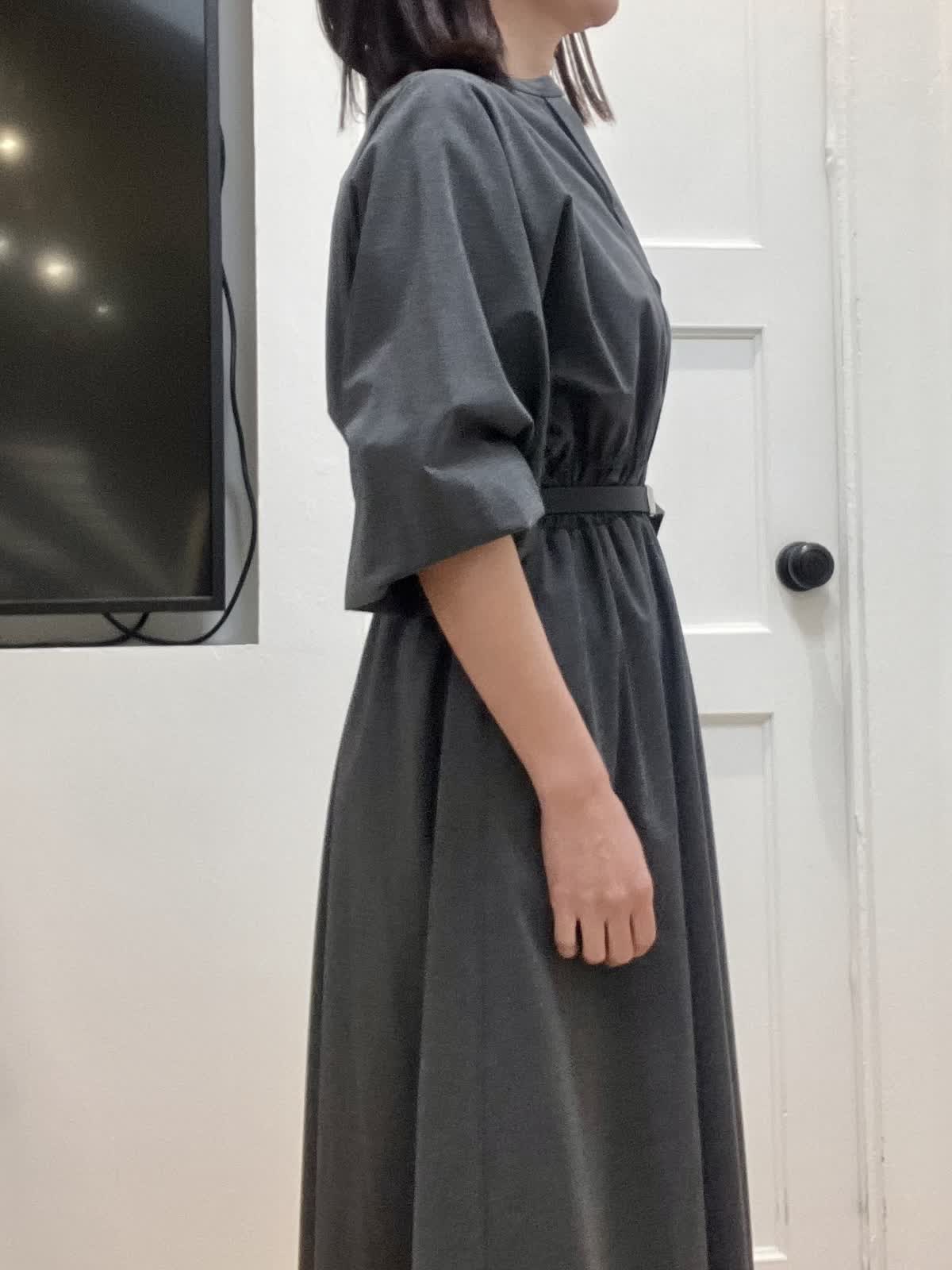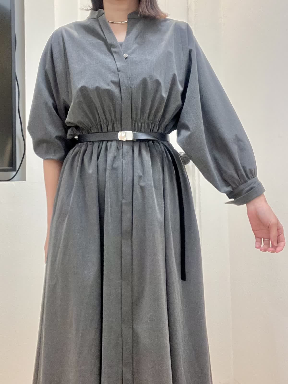 【着用サイズ】全て9号 【着用カラー】ワンピース:グレー ウエストギャザーがポイントのワンピース。 腰位置が高く見えてスタイルアップ! サラッとした着心地で、インナーにニット合わせも可愛いので、秋?春まで長いシーズン着回して頂けます。裾まで前開きなのでパンツ合わせ等のレイヤードも楽しめます。 黒のベルトとブーツでシックにまとめました。