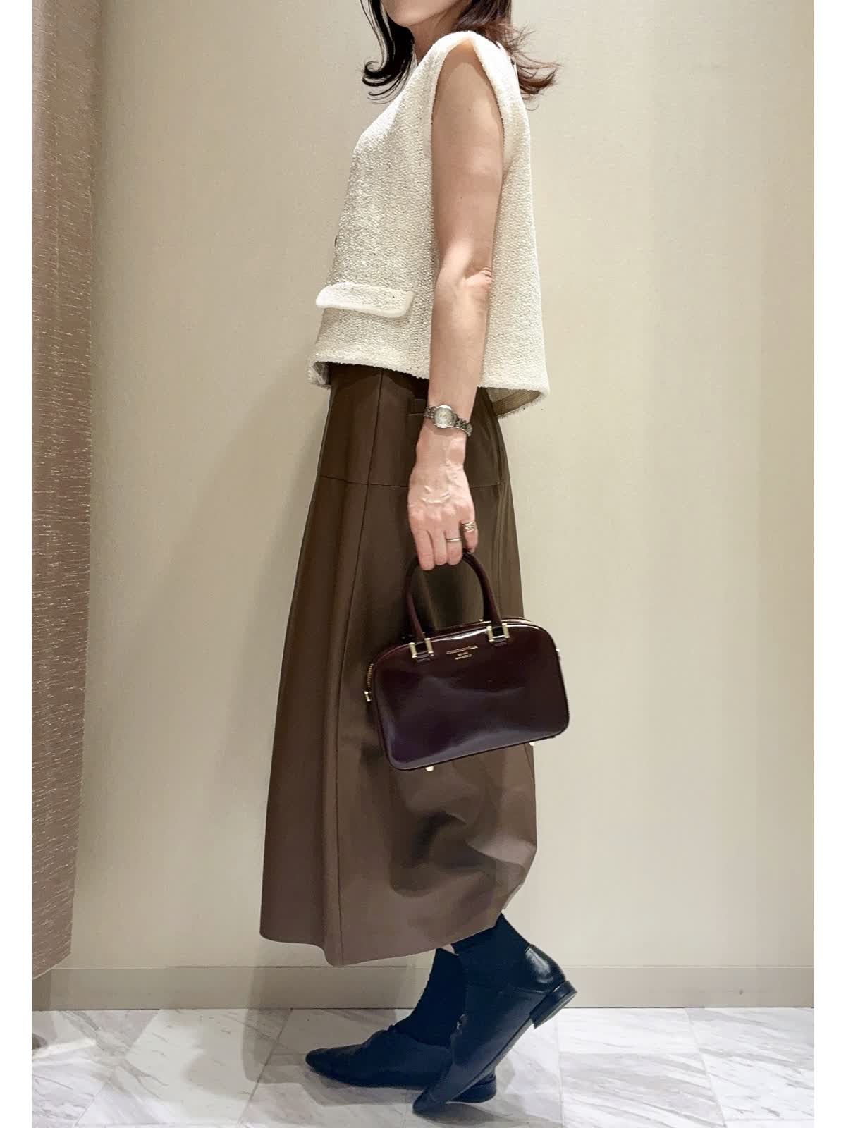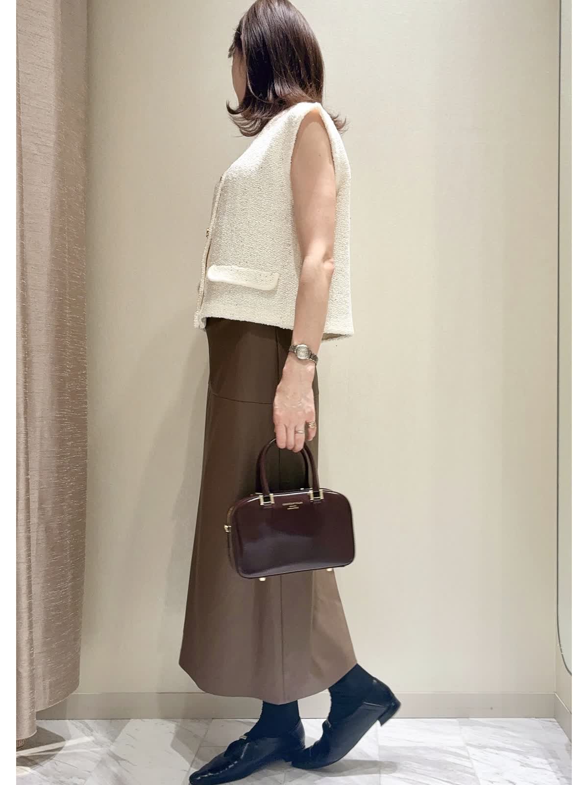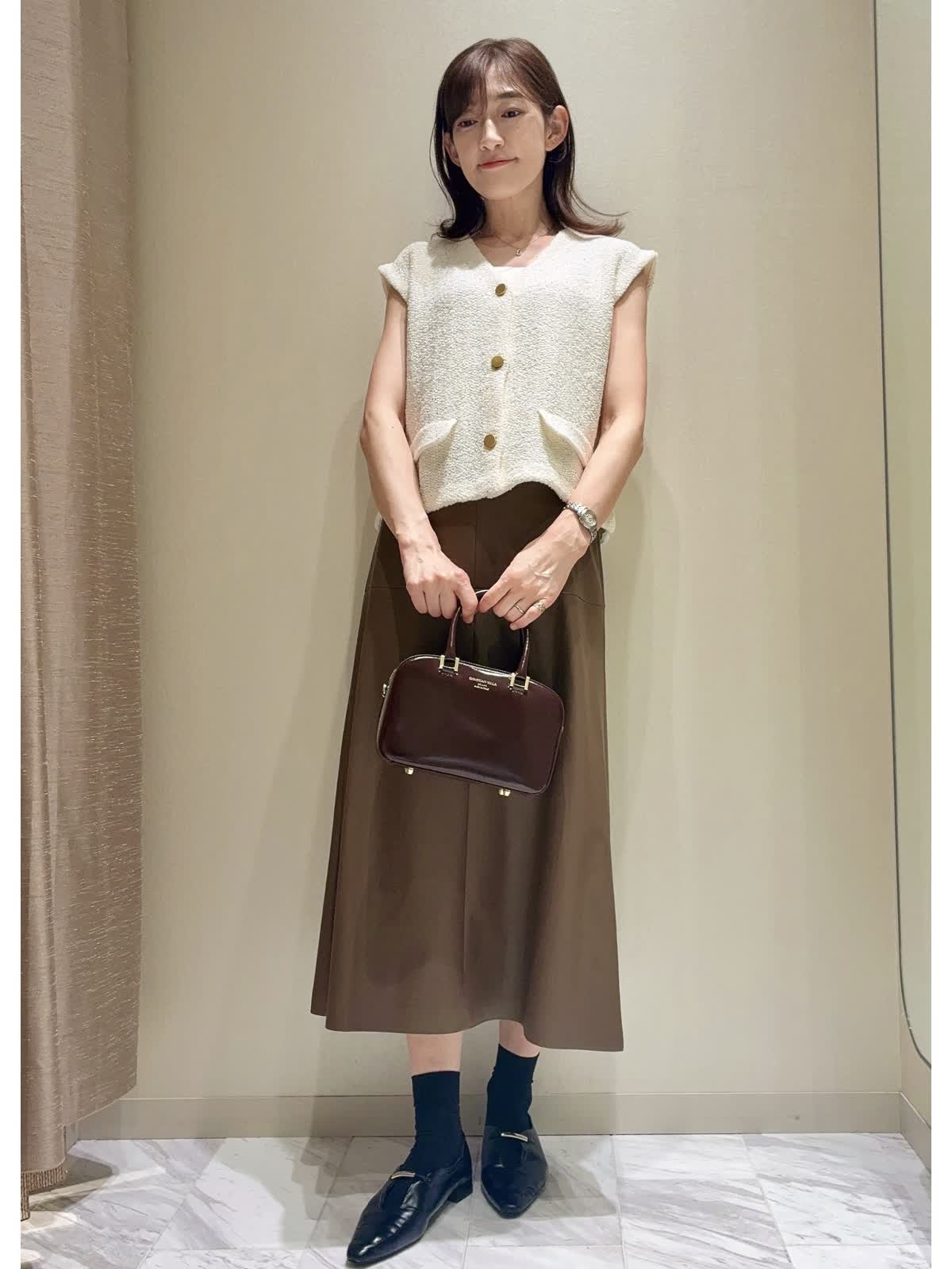 【着用サイズ】9号 【着用カラー】ニットジレ:オフホワイト スカート:ブラウン バッグ:ワイン ジレは小さなスパンコールがあしらわれた、華やかな雰囲気です。 サイズ感はゆったりめで、ワイドパンツとのコーディネートもバランスが合わせ易いです。 ツイード風なので、これから寒くなる季節にも活躍するアイテムです。