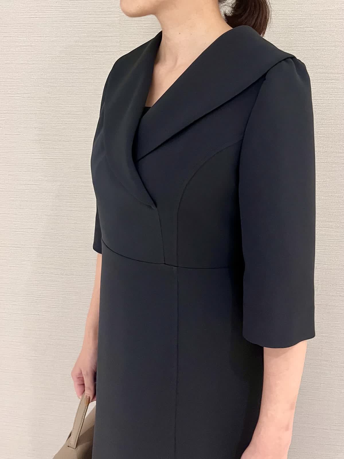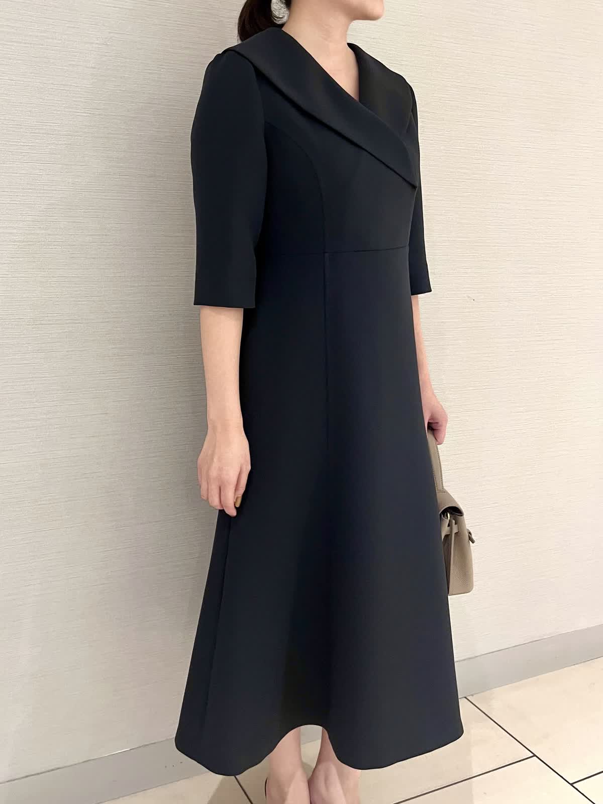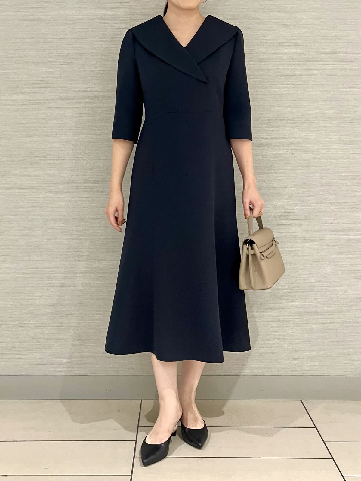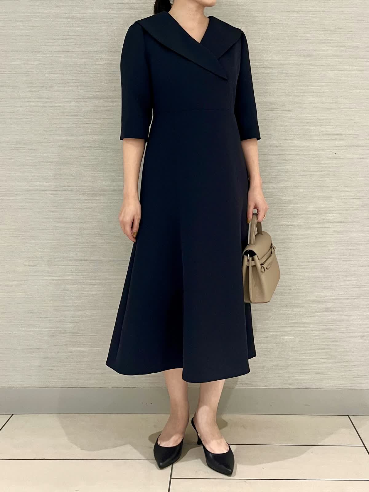 【着用サイズ】ワンピース:9号【着用カラー】ワンピース:ネイビー 女性らしいショールカラーのワンピース。着るだけで美しいシルエットが生まれ、身体のラインを綺麗に魅せてくれます。お呼ばれやお食事会などのフォーマルなシーンにもおすすめ。肘まで隠れる袖丈で長いシーズンご着用いただけます。