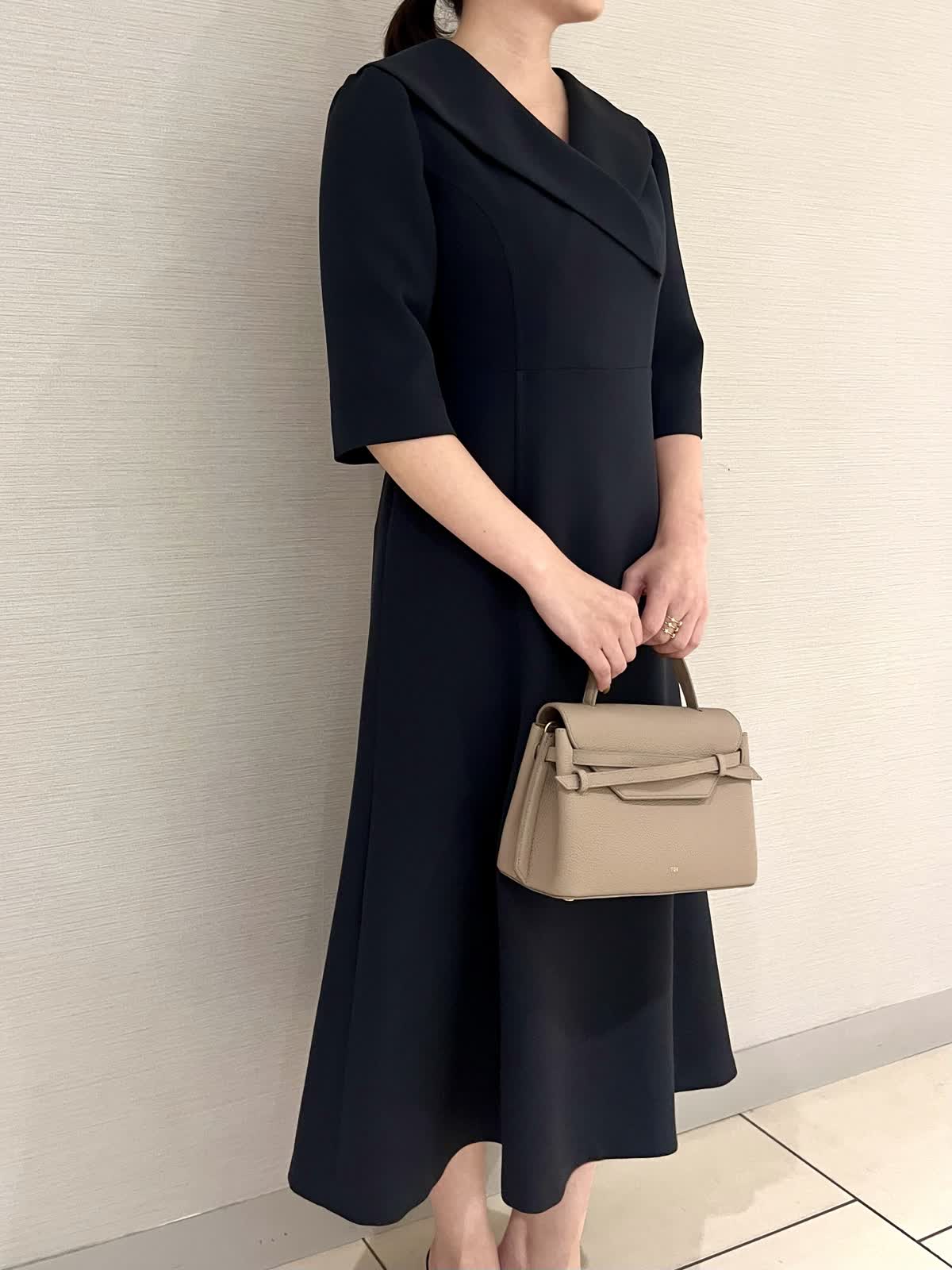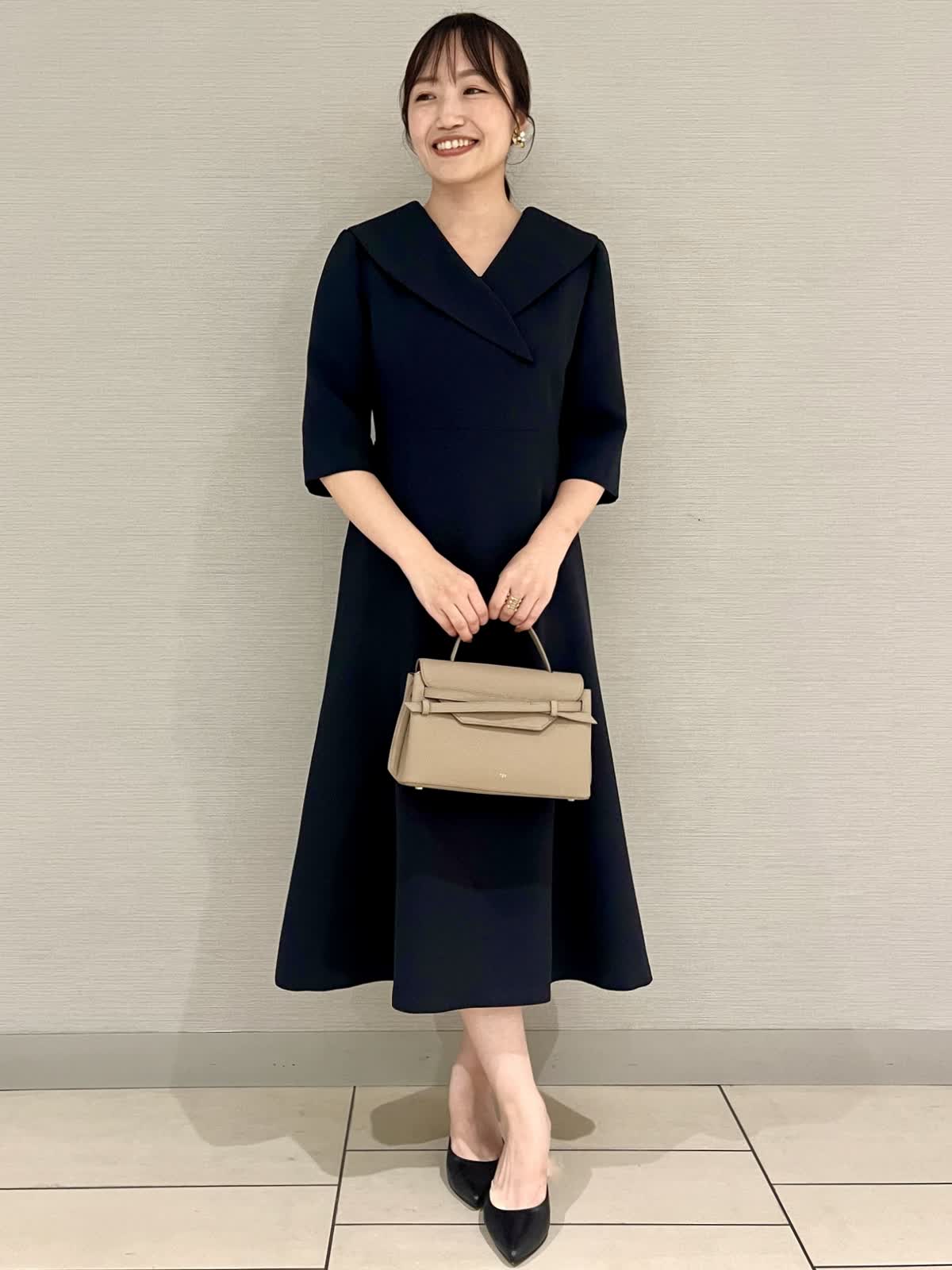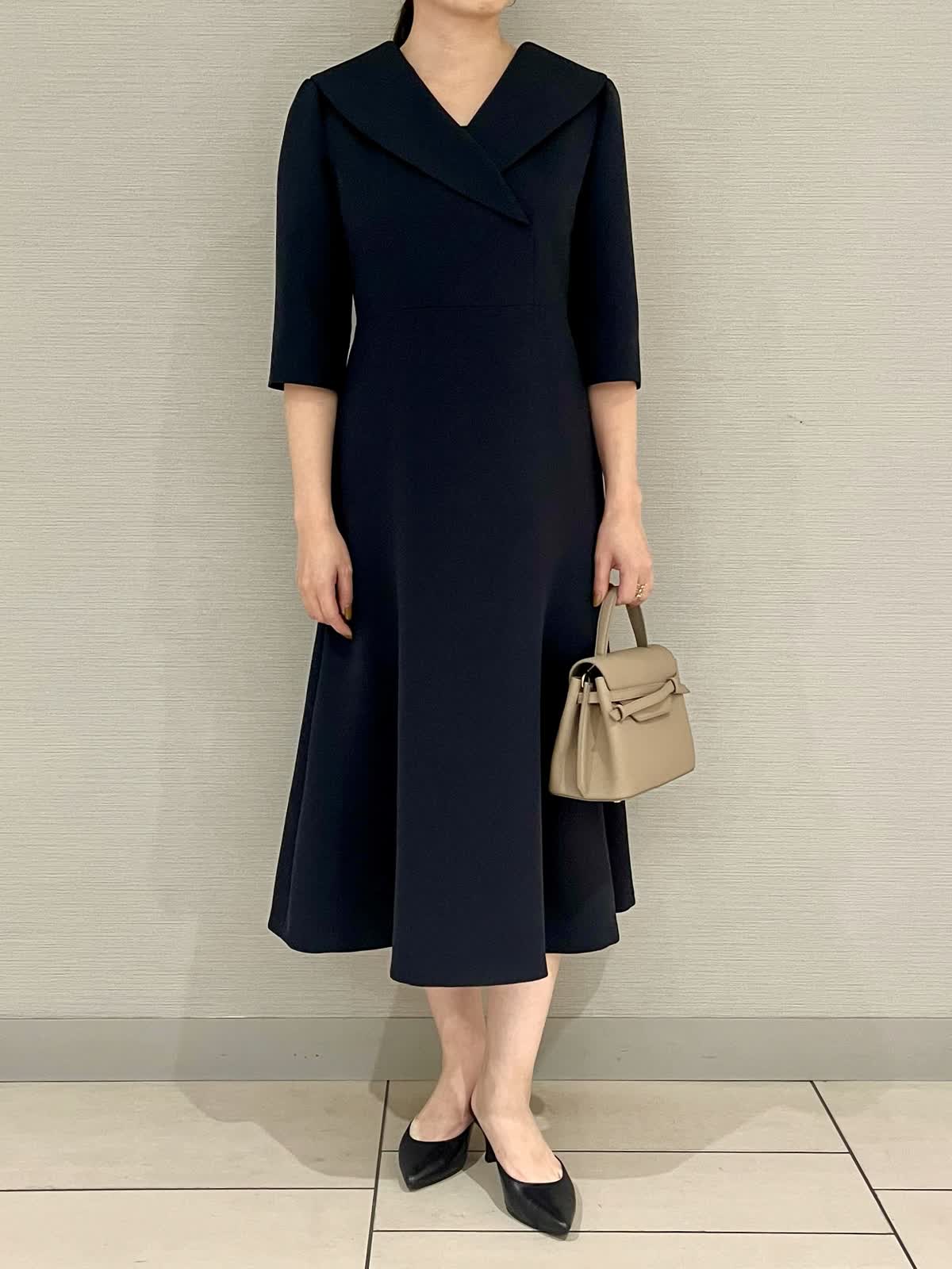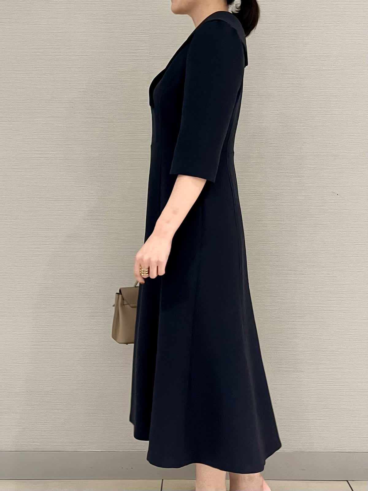 【着用サイズ】ワンピース:9号【着用カラー】ワンピース:ネイビー 女性らしいショールカラーのワンピース。着るだけで美しいシルエットが生まれ、身体のラインを綺麗に魅せてくれます。お呼ばれやお食事会などのフォーマルなシーンにもおすすめ。肘まで隠れる袖丈で長いシーズンご着用いただけます。
