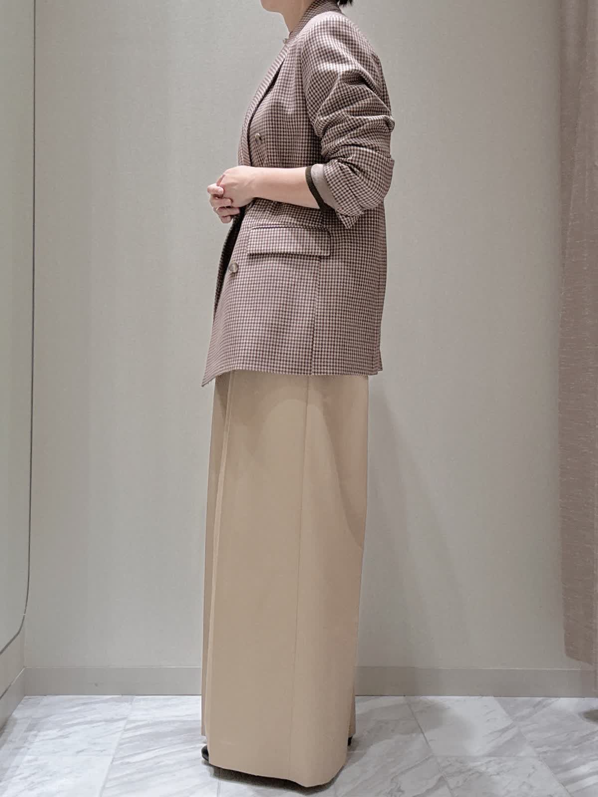 【着用サイズ】全て:9号 【着用カラー】ジャケット:チェック ニット: ブラウン パンツ: ベージュ 秋冬シーズンにぴったりのダブルブレストジャケット。仕立てはメンズライクなボックスシルエット。肩パッド入りでマニッシュな印象を演出しつつも、襟は細身のピークドラペルデザインで仕上げ、こだわりのあるシルエットです。裏地にはキュプラを使用し、滑りも良く着心地のよさも兼ね備えた逸品です。