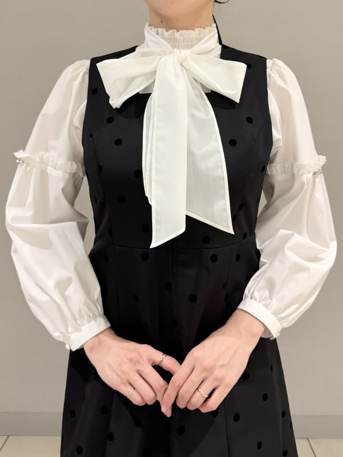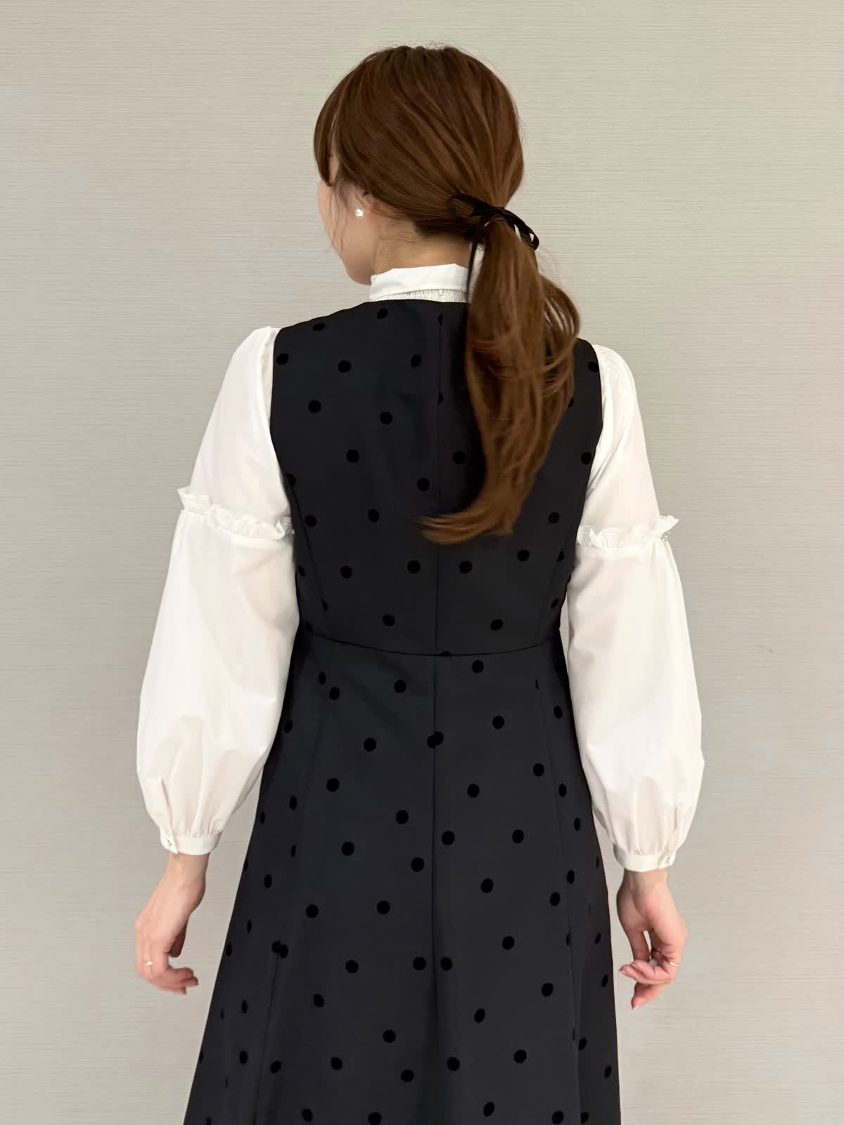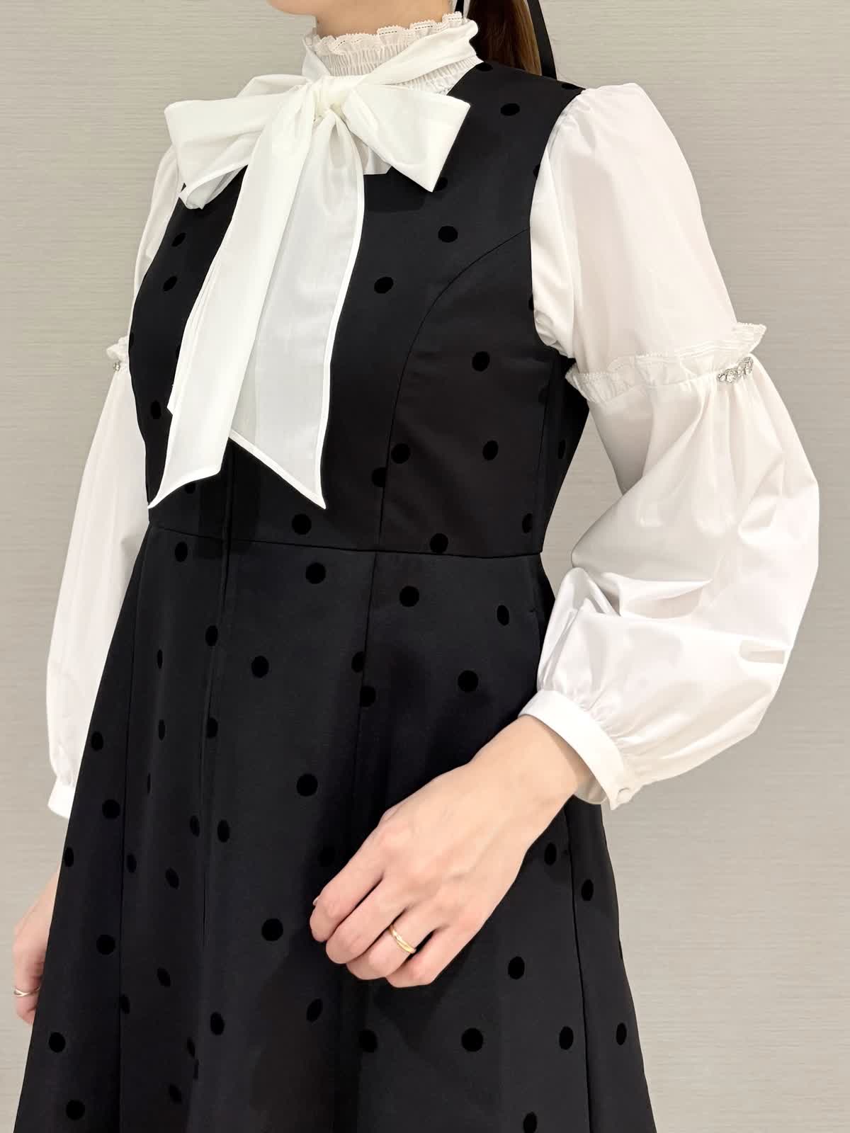 【着用サイズ/カラー】ワンピース:9号/ブラックブラウス:9号/オフホワイト大人気のドットフロッキーの生地を使ったワンピース♪ デイリーから通勤まで◎ハイウエストの切り替えがスタイルアップ!ボウタイブラウスを合わせてフェミニンなコーディネートにしました!インナーにはブラウスやニットなどと合わせて春までコーディネートをお楽しみいただけます。【サイズ感】どちらもいつものサイズ感でちょうどよかったです。ワンピースのインナーに薄いニットやブラウスであれば重ねてお召しいただけます。