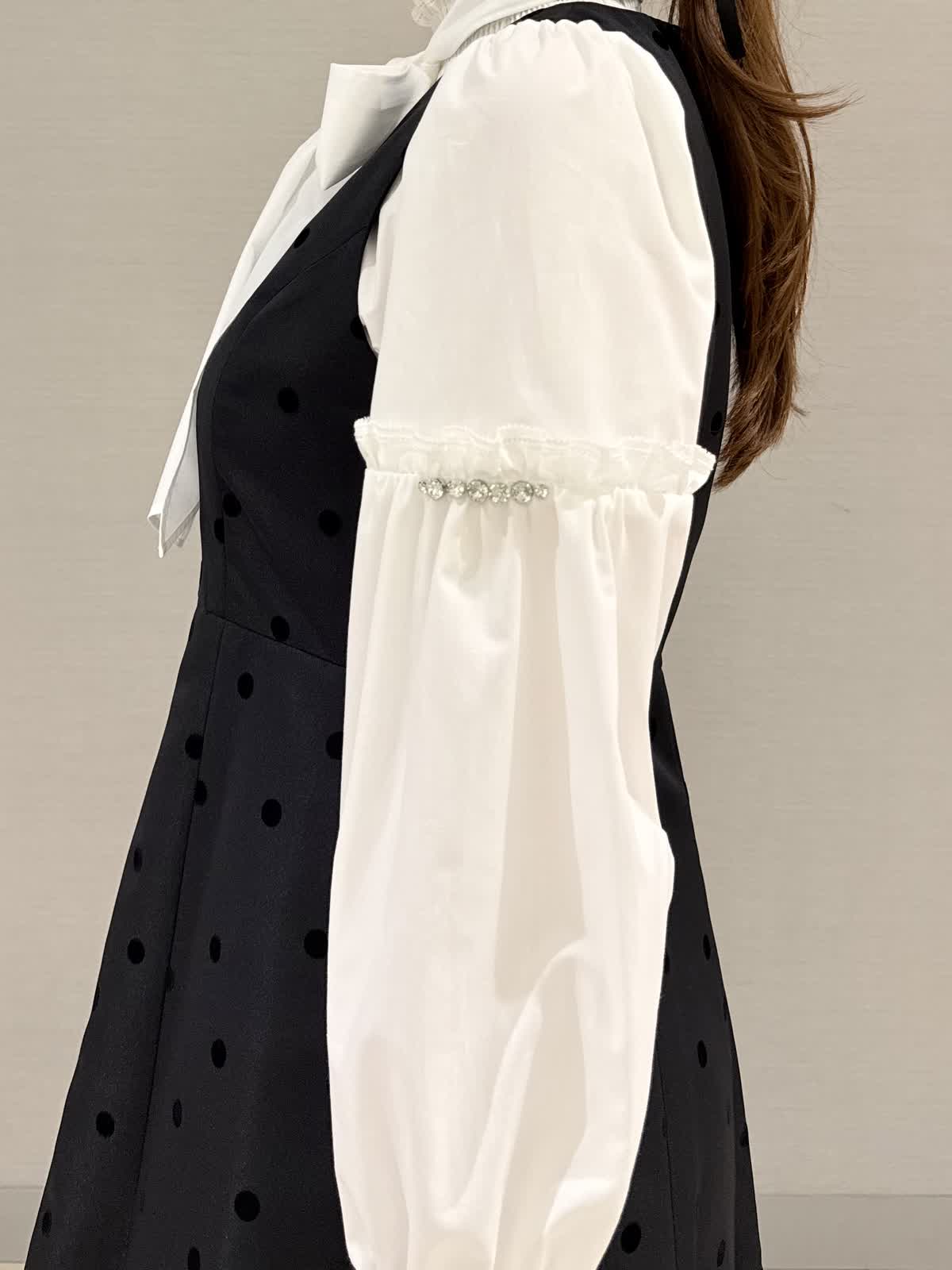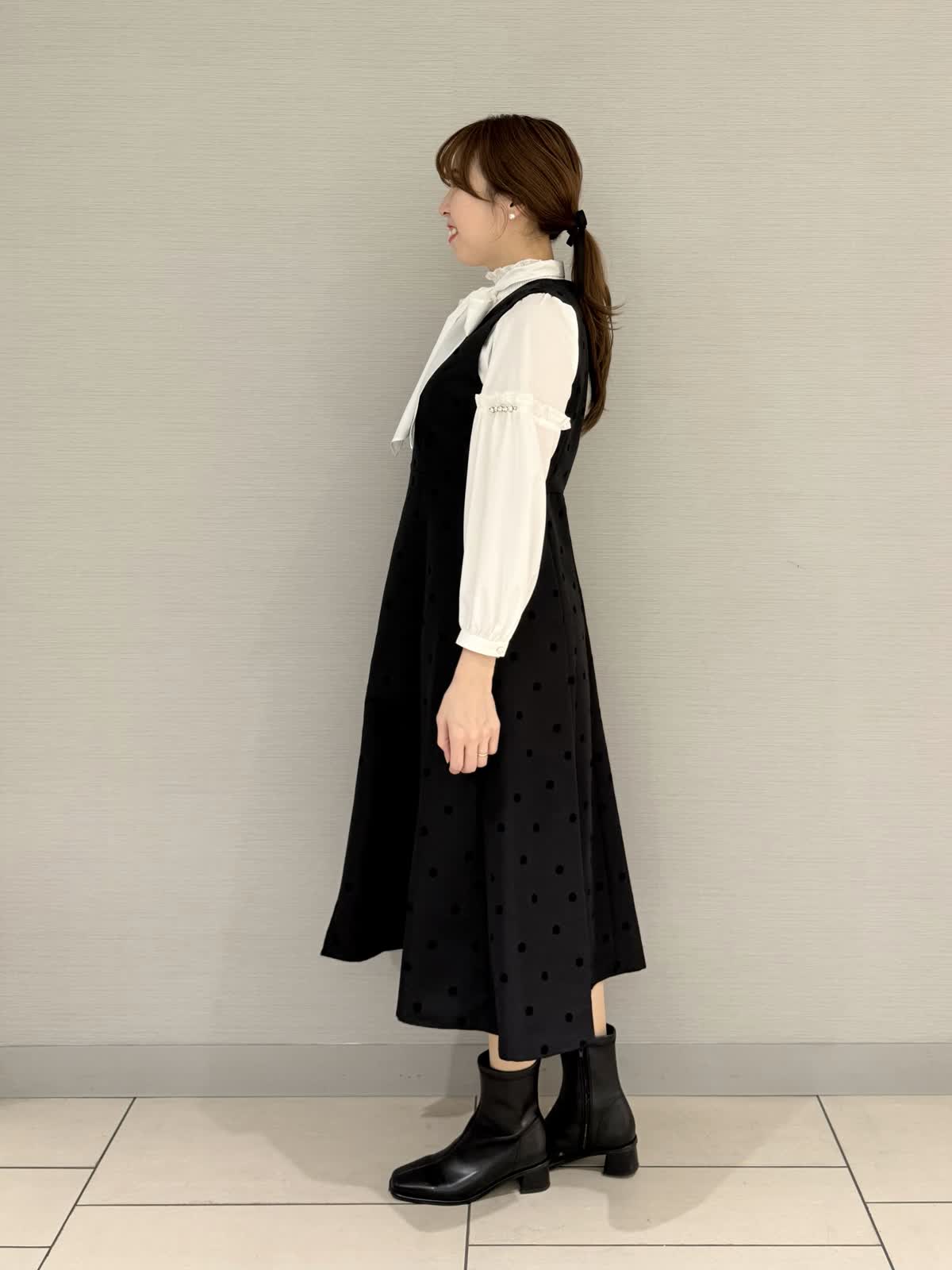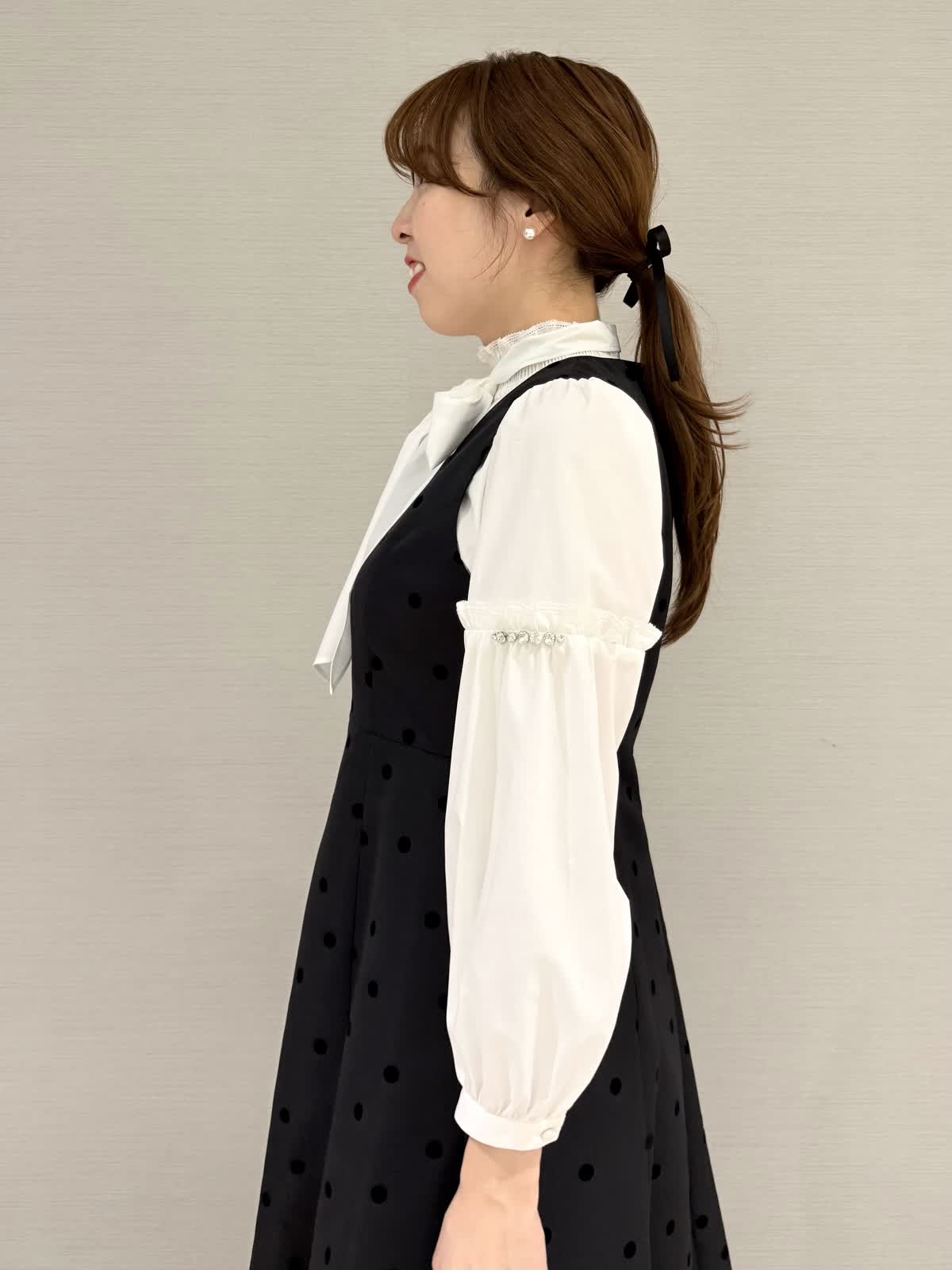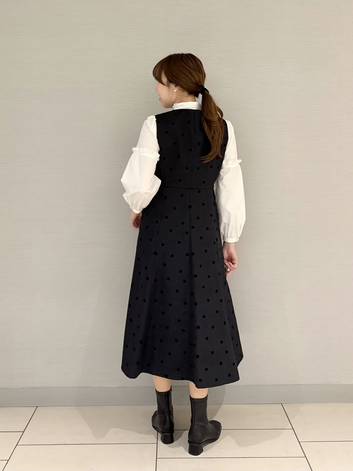【着用サイズ/カラー】ワンピース:9号/ブラックブラウス:9号/オフホワイト大人気のドットフロッキーの生地を使ったワンピース♪ デイリーから通勤まで◎ハイウエストの切り替えがスタイルアップ!ボウタイブラウスを合わせてフェミニンなコーディネートにしました!インナーにはブラウスやニットなどと合わせて春までコーディネートをお楽しみいただけます。【サイズ感】どちらもいつものサイズ感でちょうどよかったです。ワンピースのインナーに薄いニットやブラウスであれば重ねてお召しいただけます。