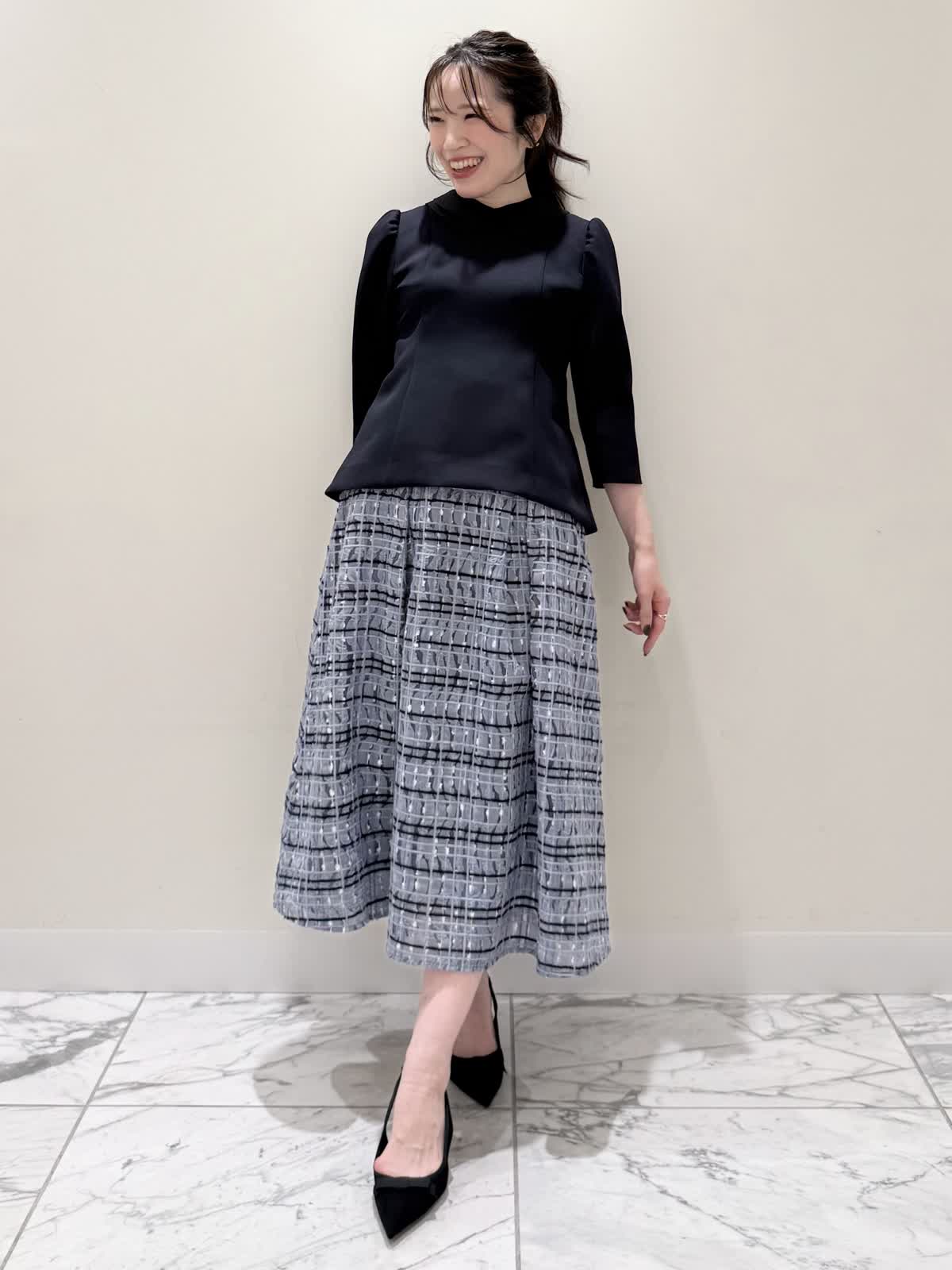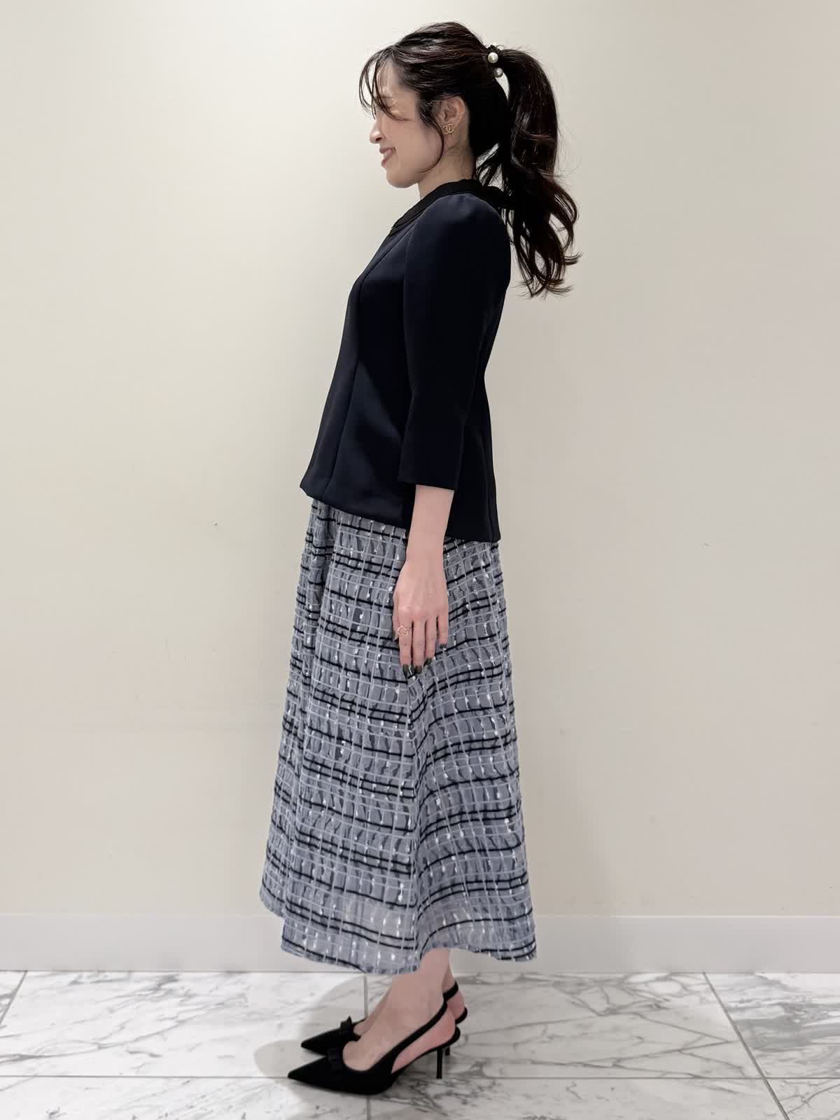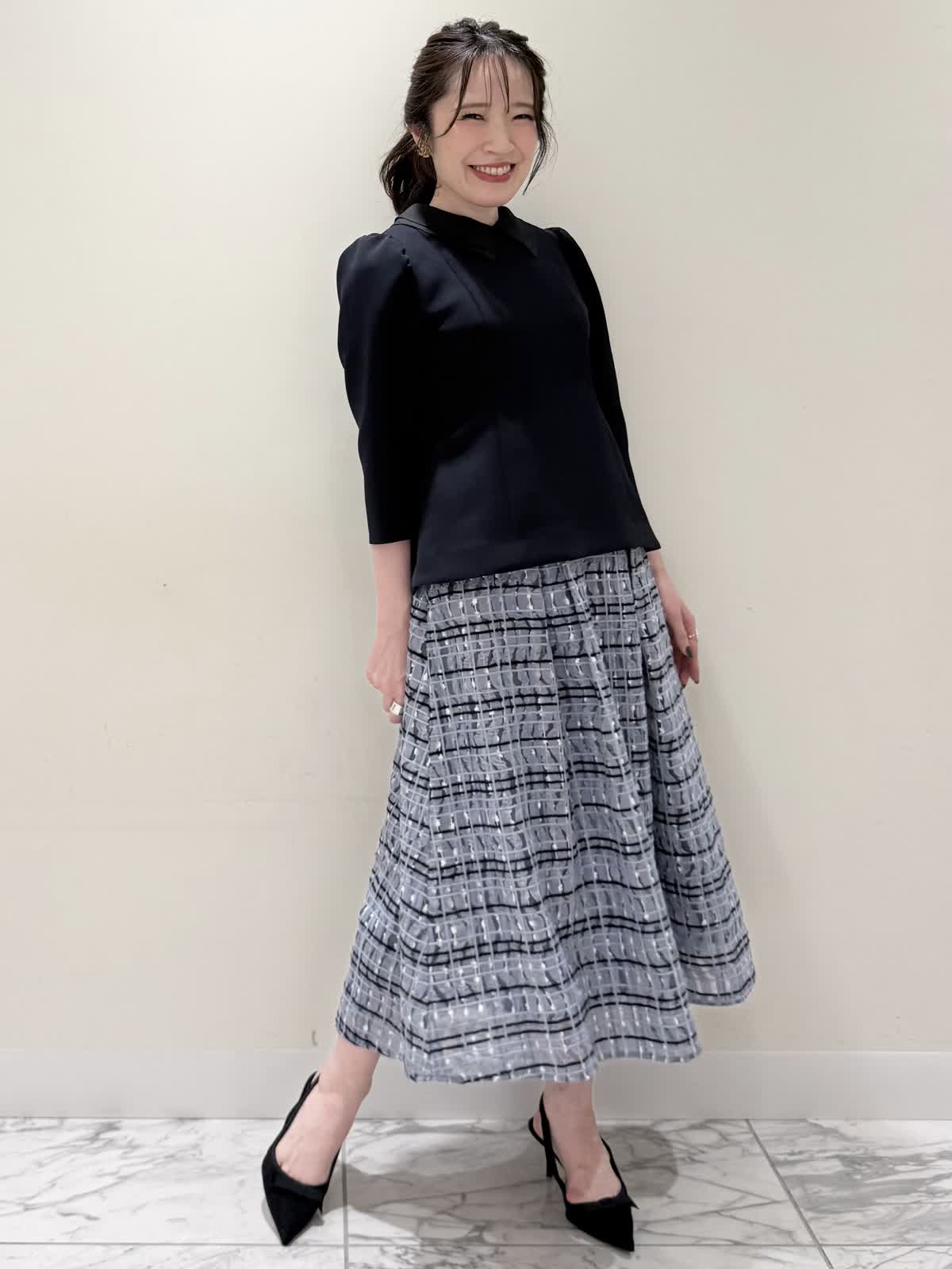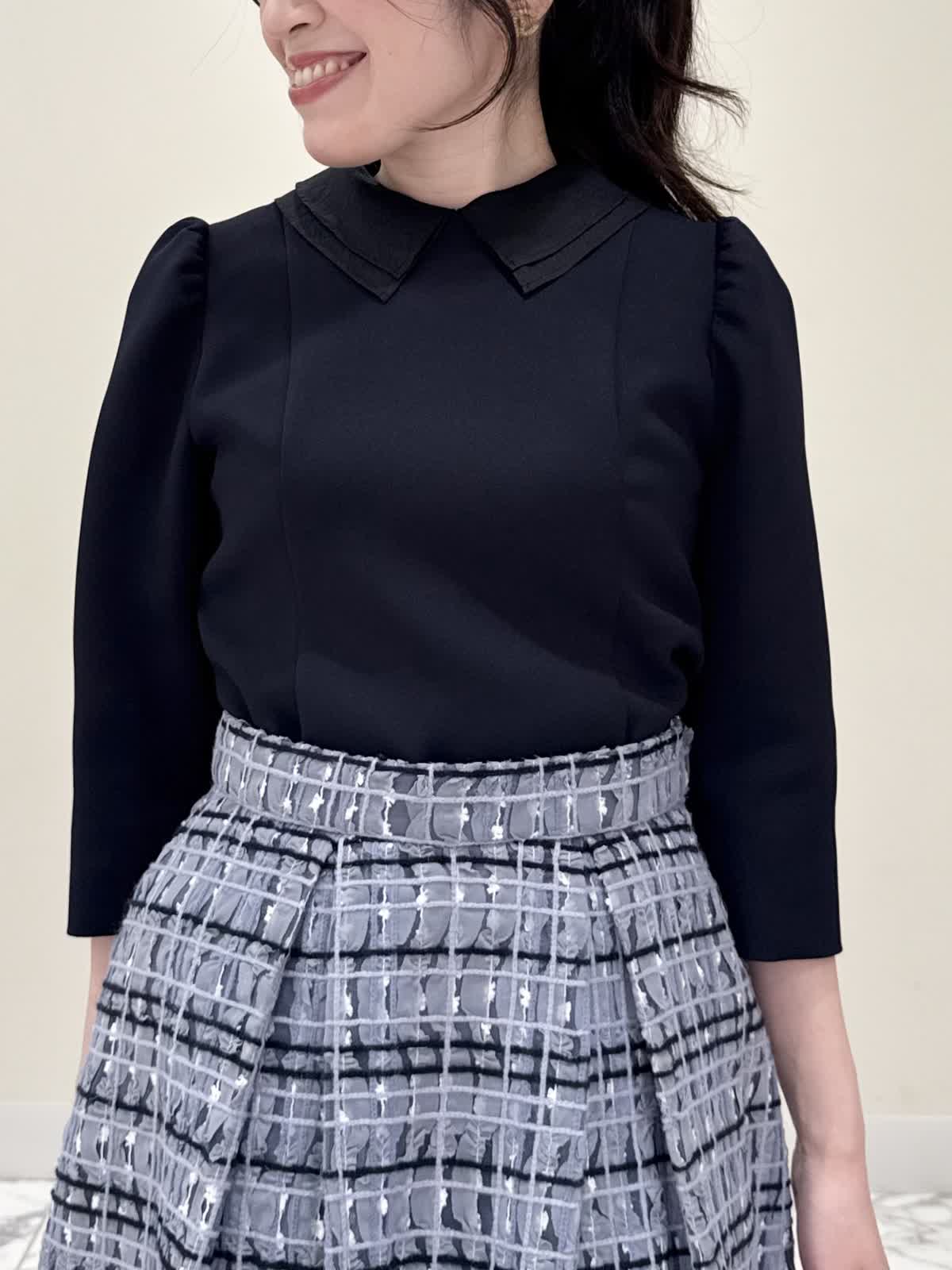 【着用サイズ/カラー】ブラウス:7号/ネイビー スカート:9号/サックス(チェック柄) スカート:7号/ネイビーお出かけにはもちろん、お食事会やお呼ばれにも着やすいおすすめコーディネート。程よいハリ感としなやかさの生地での可愛いツーピース。ブラウスはシアーの黒衿がポイントの8分袖丈。ウエストがキュッと絞られているのでインせずアウトで着られるのが良いです。裏地なしでサラッとした袖通りです。合わせは今までにないチュール生地にネイビーとサックスの糸やリボンテープでツイードの様な特別な生地のチェック柄スカートです。後ろは柔らかいゴム仕様なのでいつものサイズで大丈夫です。着用は9号ですが、色違いで7号を着用しいつもの7号サイズだったので購入する際は5号にします。裾に抜け感が出るように裏地は表地より少し短めなので小柄な方にも着やすいです。ブラウスとのツーピースはマーメイドラインが綺麗なスカート。裾はオーガンジー生地を2枚重ねたフレアシルエットで脚を綺麗に見せてくれます。ヒップがスッキリしているのでジャストサイズがお好きな方はいつものサイズ、ヒップにゆとりが欲しい方は1サイズ大きめで良いかと思います。足元をローファーにすると休日のおでかけコーディネートになります。