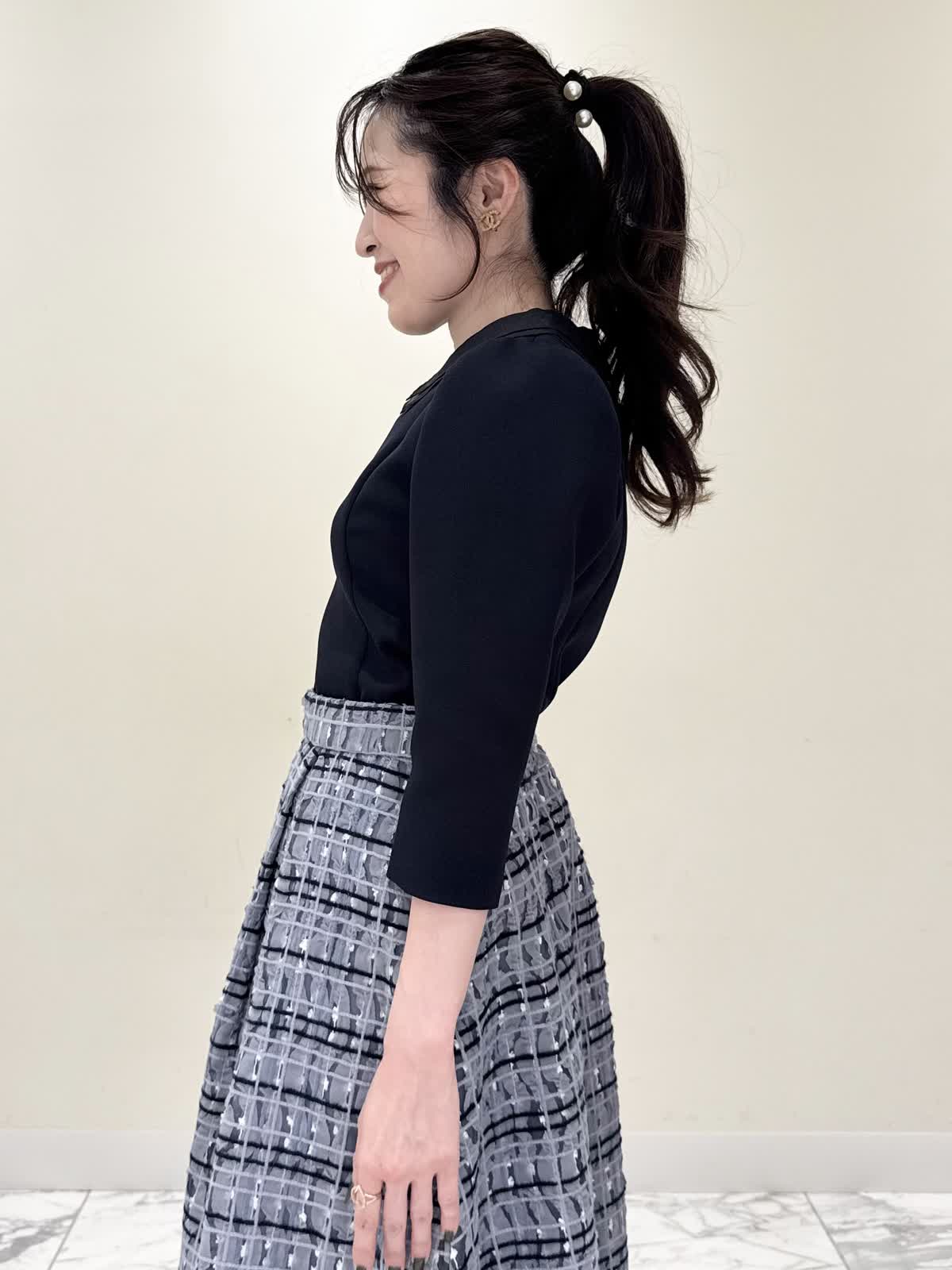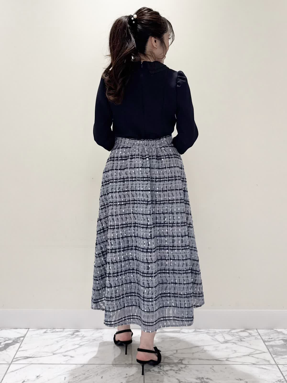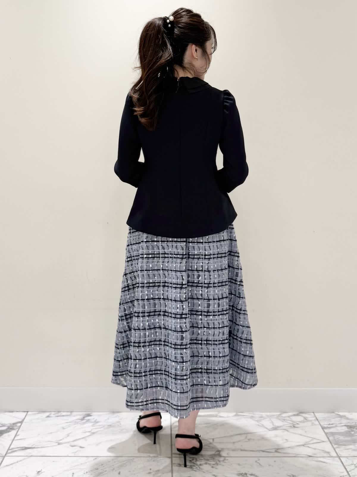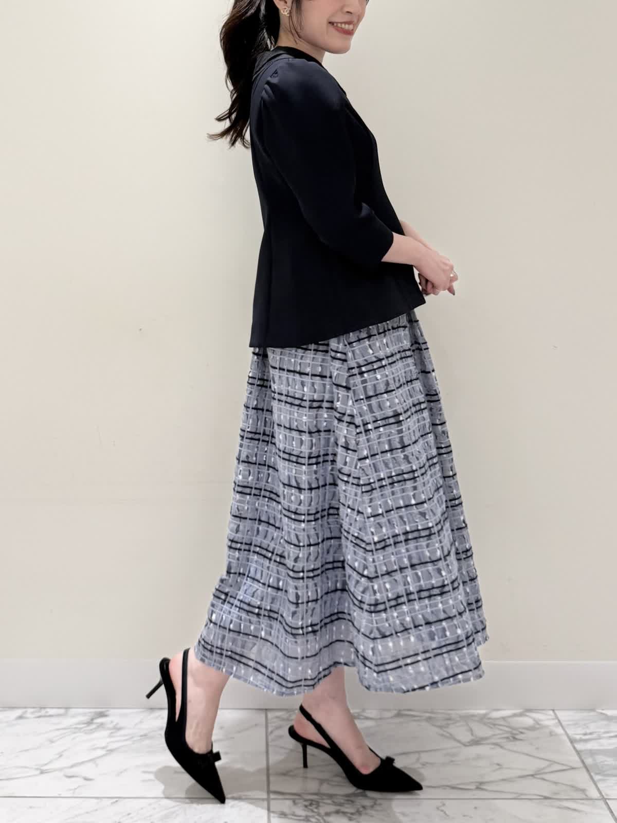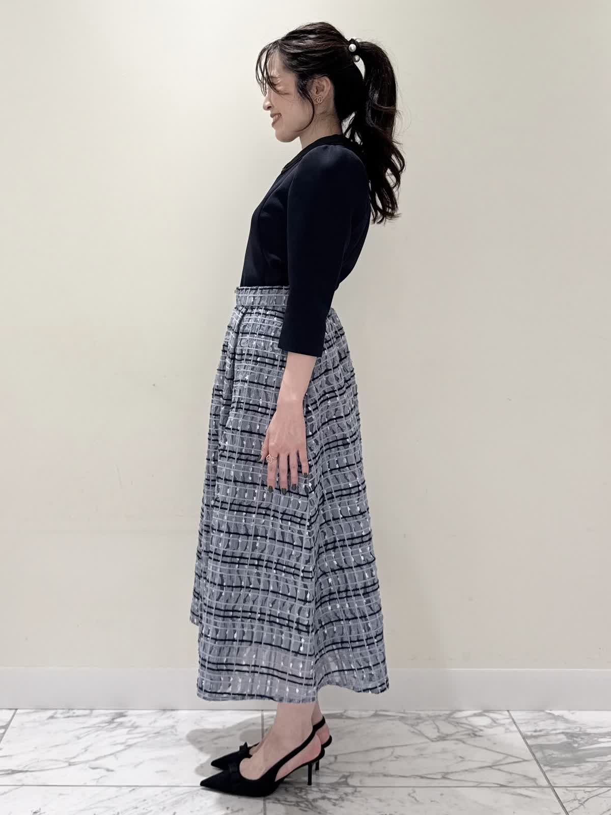 【着用サイズ/カラー】ブラウス:7号/ネイビー スカート:9号/サックス(チェック柄) スカート:7号/ネイビーお出かけにはもちろん、お食事会やお呼ばれにも着やすいおすすめコーディネート。程よいハリ感としなやかさの生地での可愛いツーピース。ブラウスはシアーの黒衿がポイントの8分袖丈。ウエストがキュッと絞られているのでインせずアウトで着られるのが良いです。裏地なしでサラッとした袖通りです。合わせは今までにないチュール生地にネイビーとサックスの糸やリボンテープでツイードの様な特別な生地のチェック柄スカートです。後ろは柔らかいゴム仕様なのでいつものサイズで大丈夫です。着用は9号ですが、色違いで7号を着用しいつもの7号サイズだったので購入する際は5号にします。裾に抜け感が出るように裏地は表地より少し短めなので小柄な方にも着やすいです。ブラウスとのツーピースはマーメイドラインが綺麗なスカート。裾はオーガンジー生地を2枚重ねたフレアシルエットで脚を綺麗に見せてくれます。ヒップがスッキリしているのでジャストサイズがお好きな方はいつものサイズ、ヒップにゆとりが欲しい方は1サイズ大きめで良いかと思います。足元をローファーにすると休日のおでかけコーディネートになります。