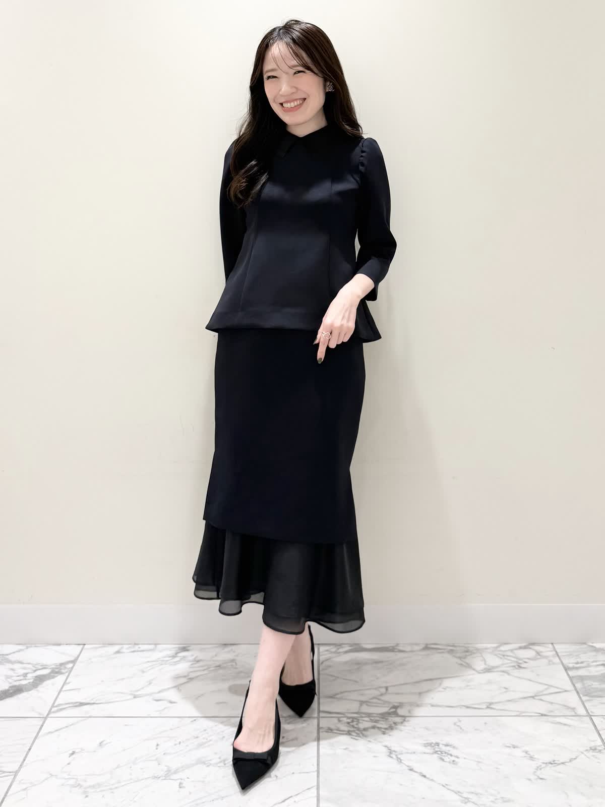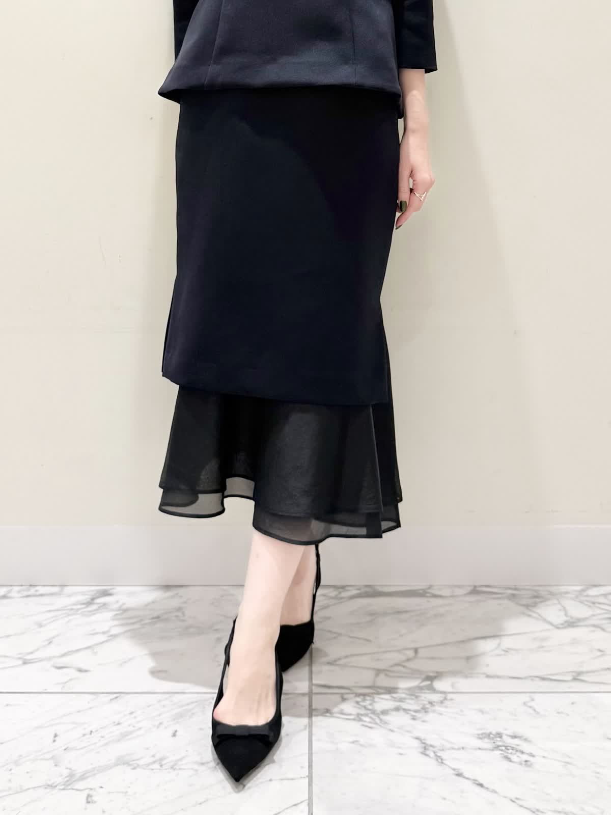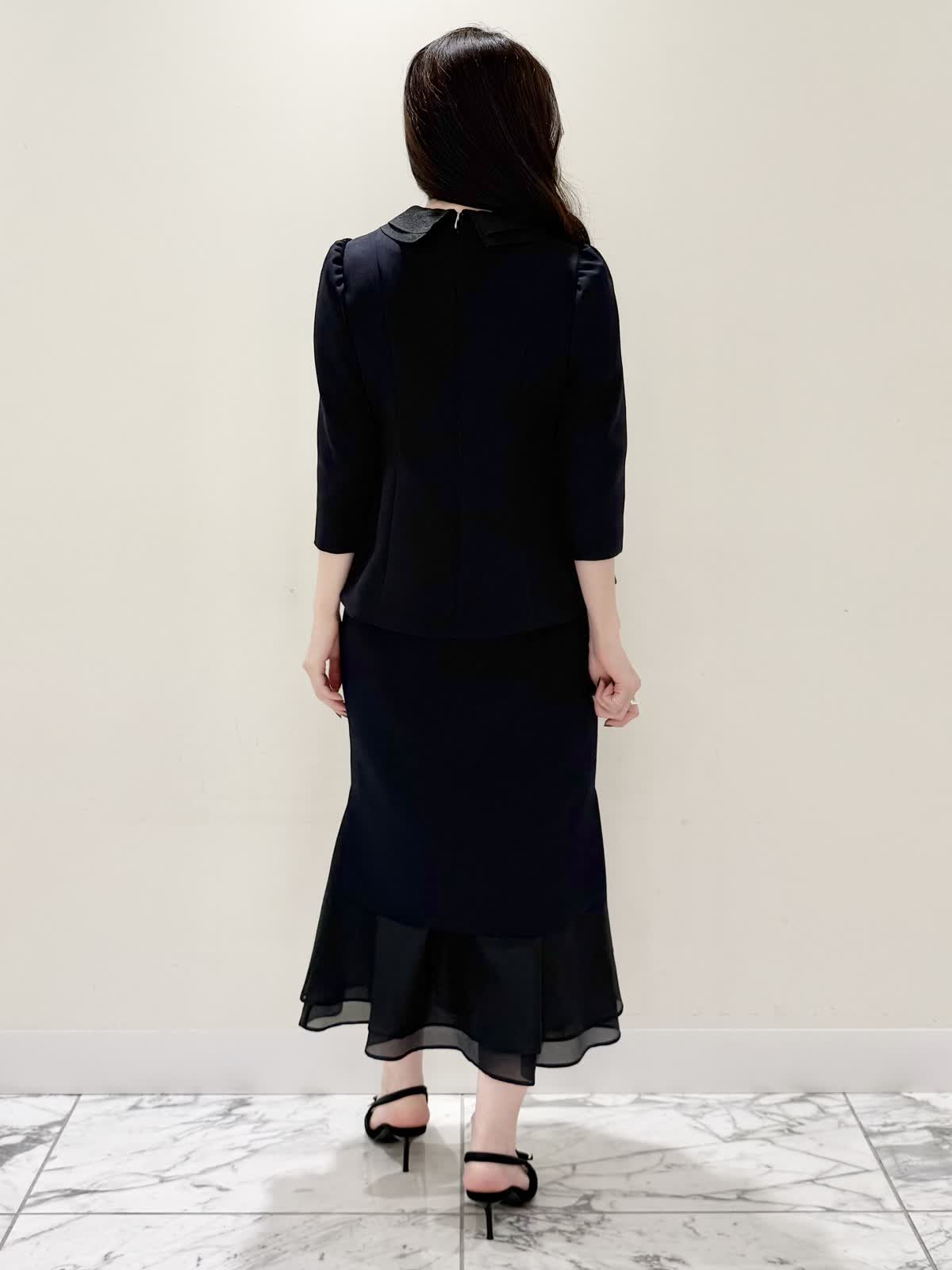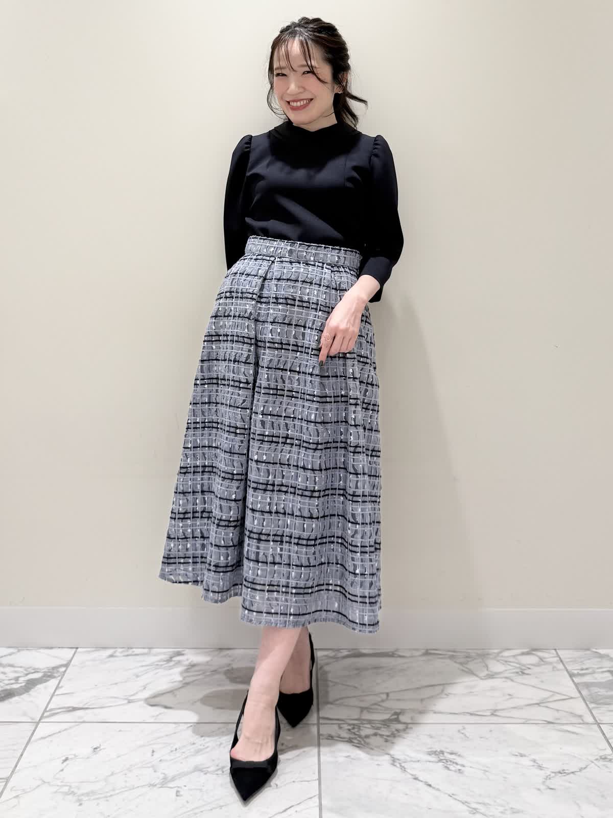 【着用サイズ/カラー】ブラウス:7号/ネイビー スカート:9号/サックス(チェック柄) スカート:7号/ネイビーお出かけにはもちろん、お食事会やお呼ばれにも着やすいおすすめコーディネート。程よいハリ感としなやかさの生地での可愛いツーピース。ブラウスはシアーの黒衿がポイントの8分袖丈。ウエストがキュッと絞られているのでインせずアウトで着られるのが良いです。裏地なしでサラッとした袖通りです。合わせは今までにないチュール生地にネイビーとサックスの糸やリボンテープでツイードの様な特別な生地のチェック柄スカートです。後ろは柔らかいゴム仕様なのでいつものサイズで大丈夫です。着用は9号ですが、色違いで7号を着用しいつもの7号サイズだったので購入する際は5号にします。裾に抜け感が出るように裏地は表地より少し短めなので小柄な方にも着やすいです。ブラウスとのツーピースはマーメイドラインが綺麗なスカート。裾はオーガンジー生地を2枚重ねたフレアシルエットで脚を綺麗に見せてくれます。ヒップがスッキリしているのでジャストサイズがお好きな方はいつものサイズ、ヒップにゆとりが欲しい方は1サイズ大きめで良いかと思います。足元をローファーにすると休日のおでかけコーディネートになります。