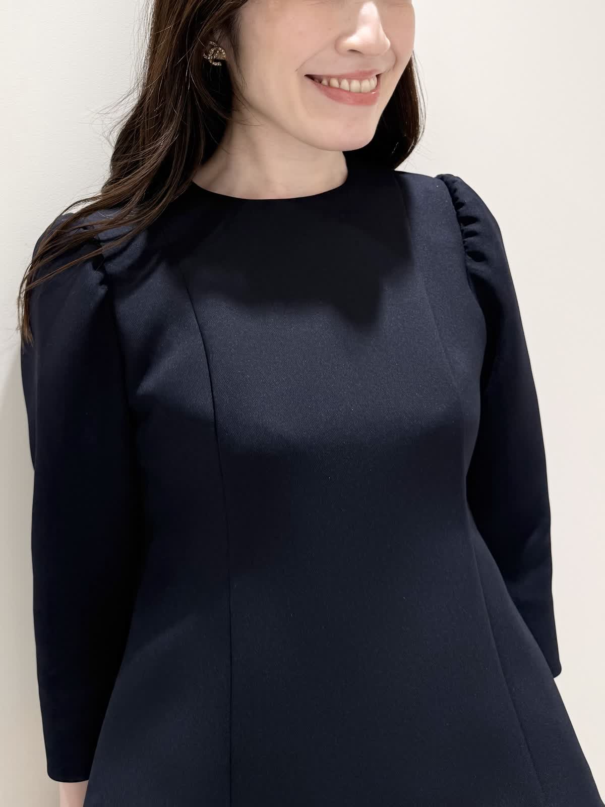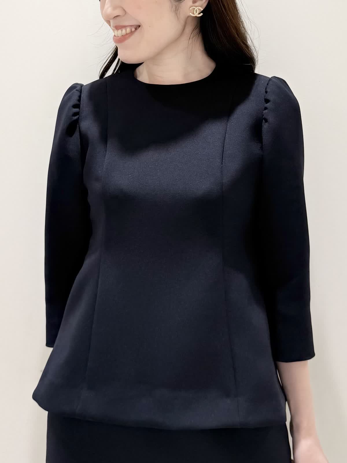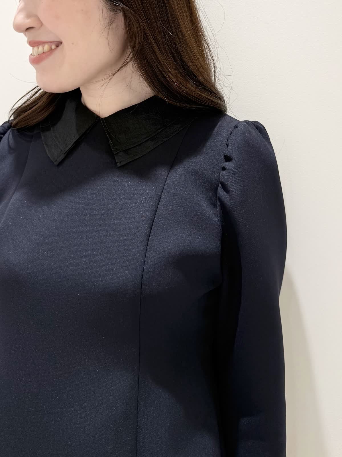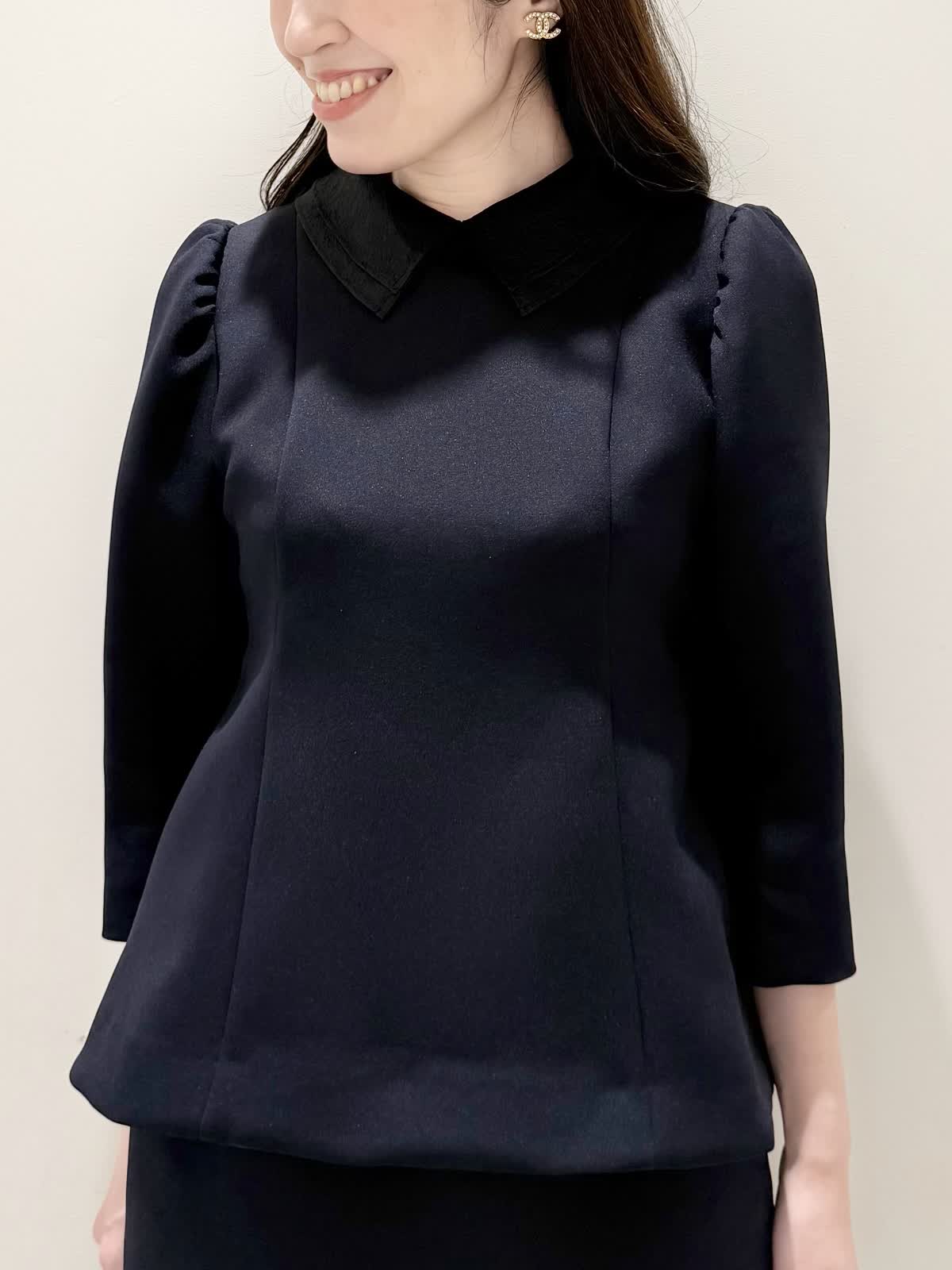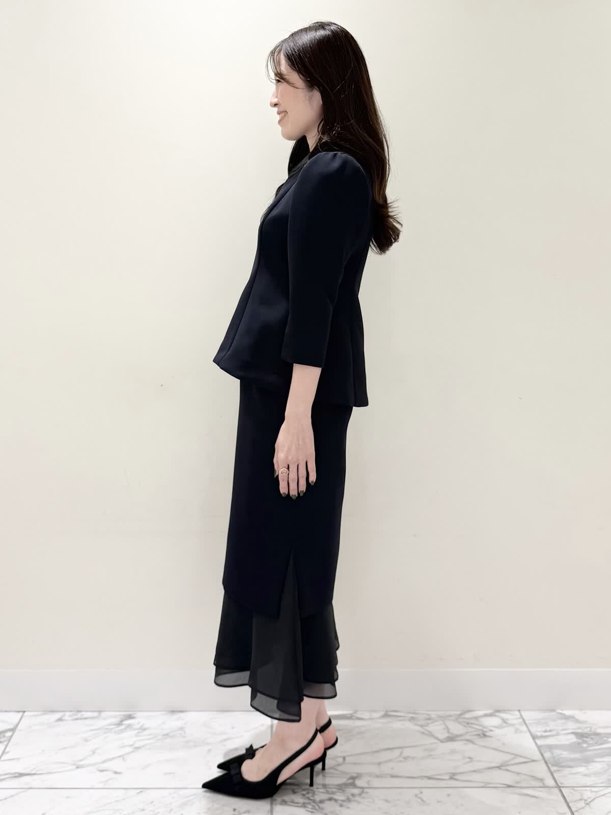 【着用サイズ/カラー】ブラウス:7号/ネイビー スカート:9号/サックス(チェック柄) スカート:7号/ネイビーお出かけにはもちろん、お食事会やお呼ばれにも着やすいおすすめコーディネート。程よいハリ感としなやかさの生地での可愛いツーピース。ブラウスはシアーの黒衿がポイントの8分袖丈。ウエストがキュッと絞られているのでインせずアウトで着られるのが良いです。裏地なしでサラッとした袖通りです。合わせは今までにないチュール生地にネイビーとサックスの糸やリボンテープでツイードの様な特別な生地のチェック柄スカートです。後ろは柔らかいゴム仕様なのでいつものサイズで大丈夫です。着用は9号ですが、色違いで7号を着用しいつもの7号サイズだったので購入する際は5号にします。裾に抜け感が出るように裏地は表地より少し短めなので小柄な方にも着やすいです。ブラウスとのツーピースはマーメイドラインが綺麗なスカート。裾はオーガンジー生地を2枚重ねたフレアシルエットで脚を綺麗に見せてくれます。ヒップがスッキリしているのでジャストサイズがお好きな方はいつものサイズ、ヒップにゆとりが欲しい方は1サイズ大きめで良いかと思います。足元をローファーにすると休日のおでかけコーディネートになります。