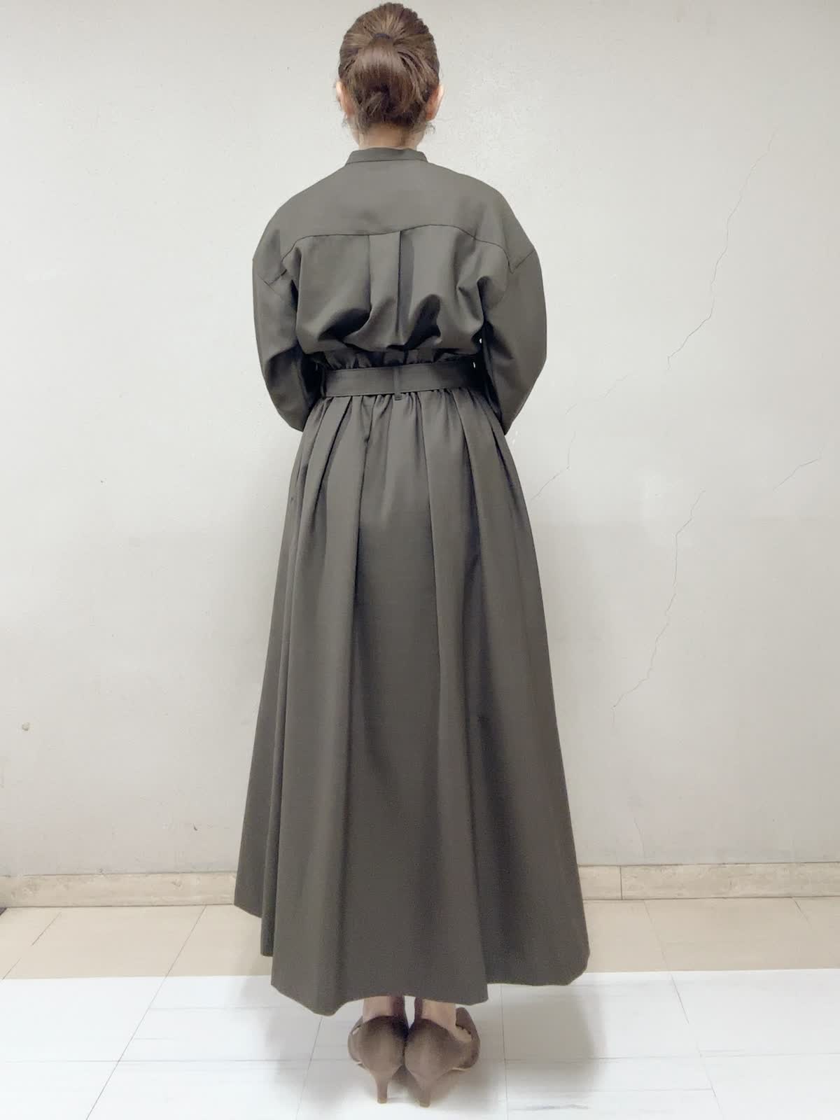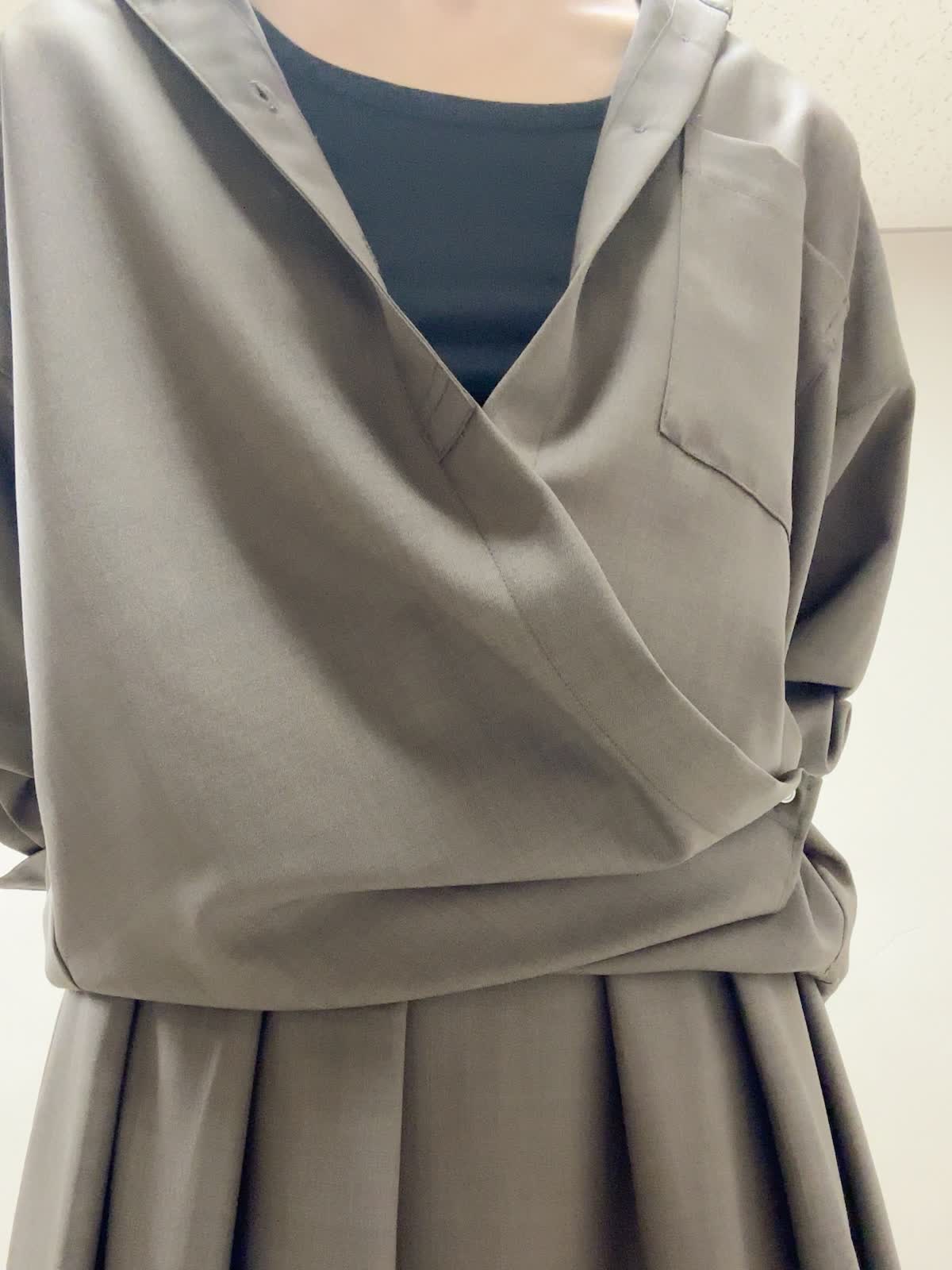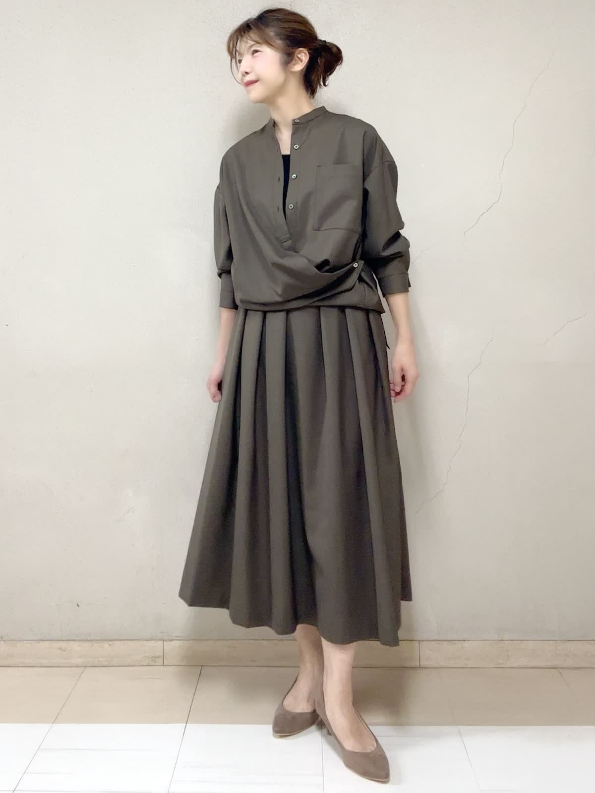 【着用サイズ】ブラウス:フリー タンクトップ:9号 ベルト付きタックスカート:フリー 【着用カラー】ブラウス:ブラウン タンクトップ:ブラック ベルト付きタックスカート:ブラウン お出掛けスタイル STORYコラボのセットアップ。秋らしいカラーバリエーション。スカートの着丈もレギュラーとロング丈があります。バランスの良い貴方好みの着丈で。ブラウスは、カシュクールのスタイルにも出来るので,羽織りとしても便利。