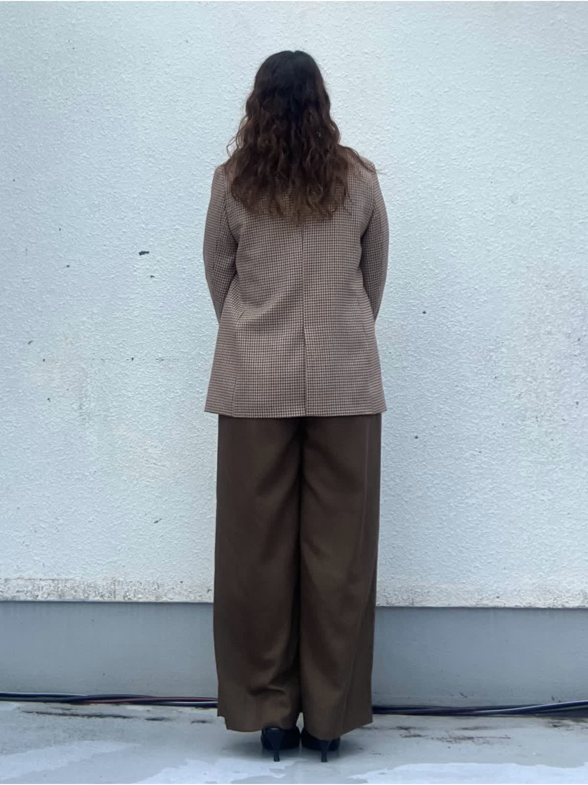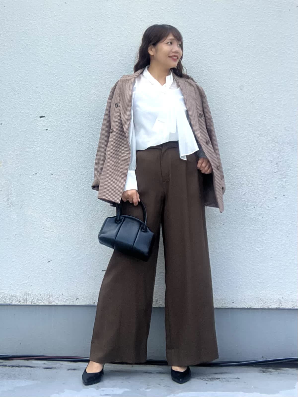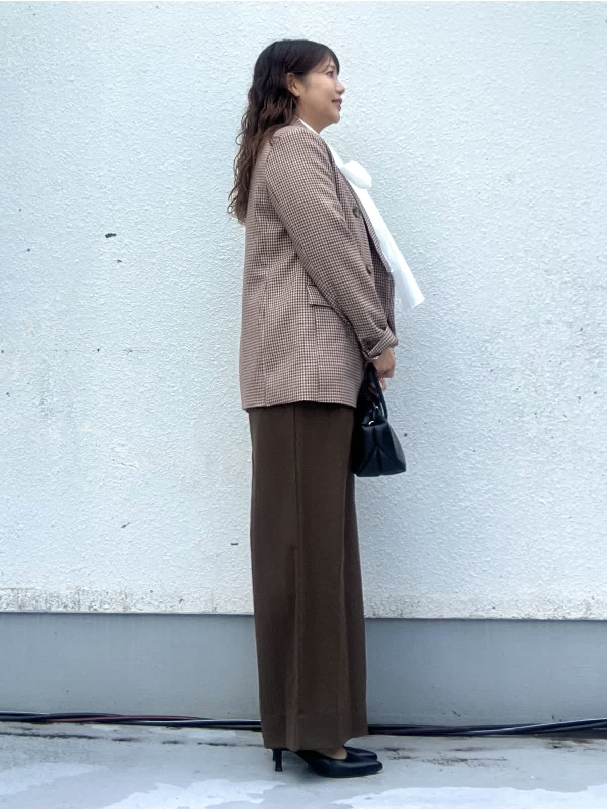 【着用アイテム:カラー/サイズ】 ジャケット:柄小/7号 ブラウス:ホワイト/フリー パンツ:ブラウン/11号 チェック柄がとてもオシャレなこちらのジャケットはメンズライクなボックスシルエットでとても着心地が良いです。オーバーサイズで丈もヒップが隠れるのでパンツとの相性抜群です。