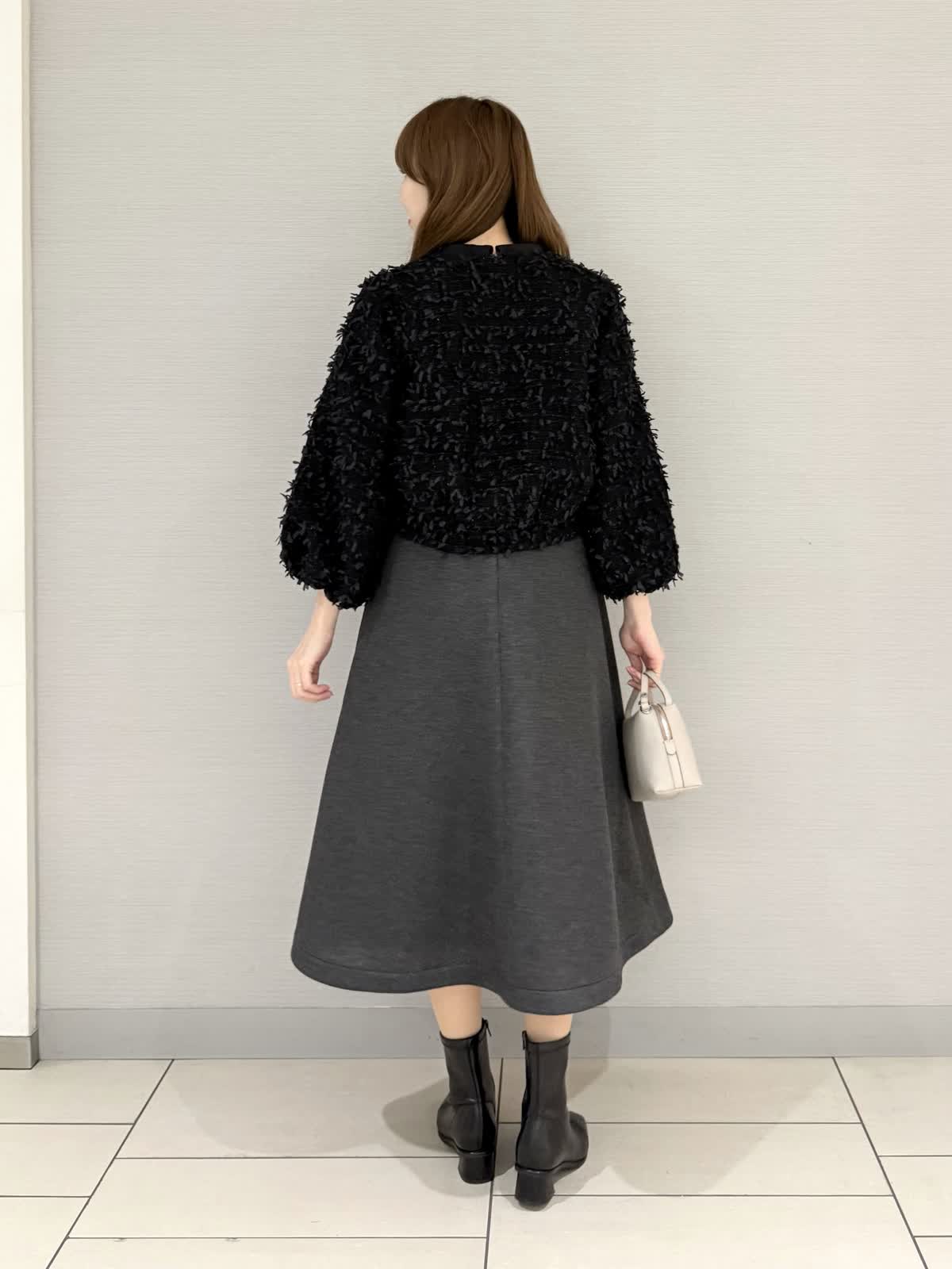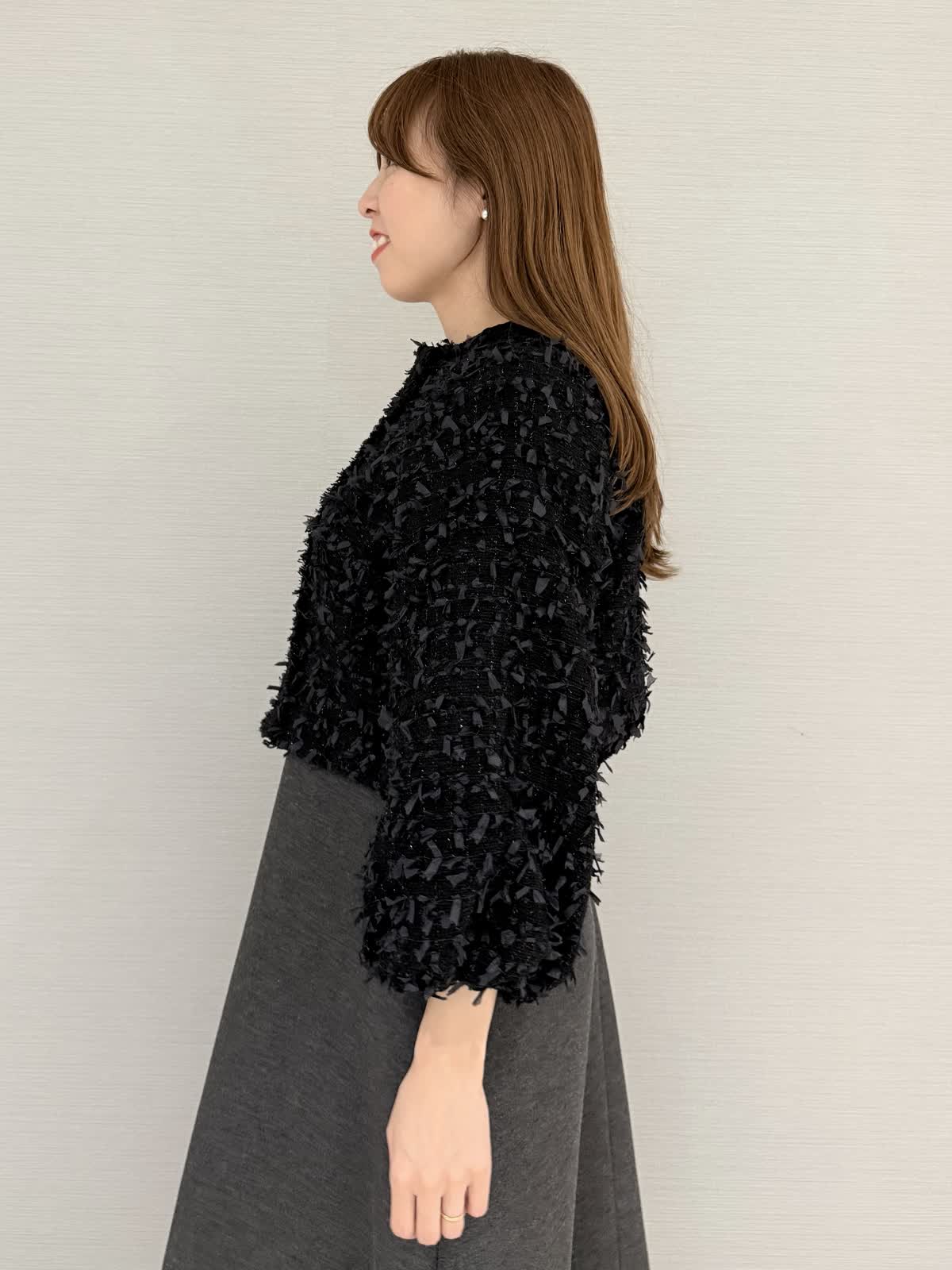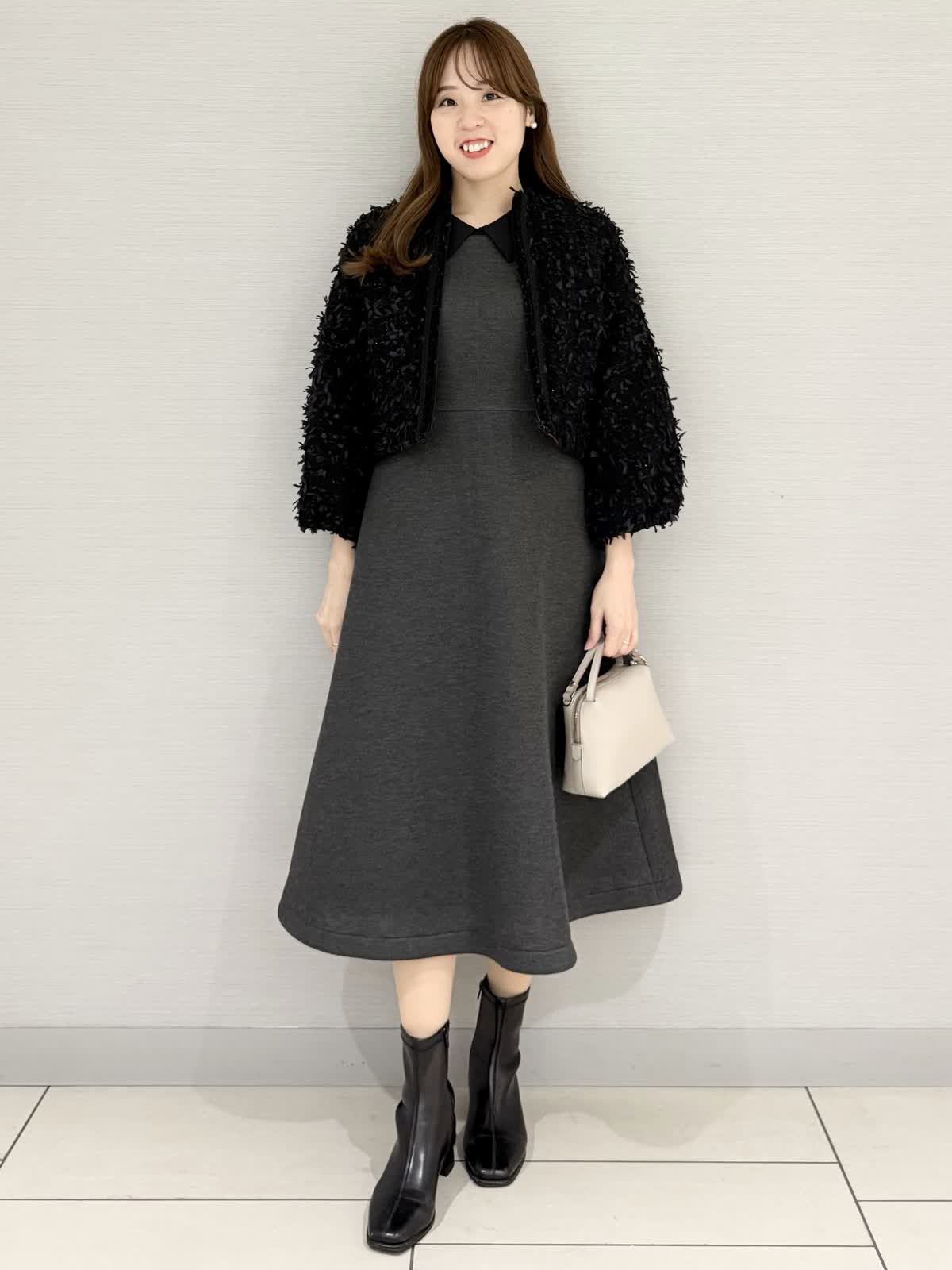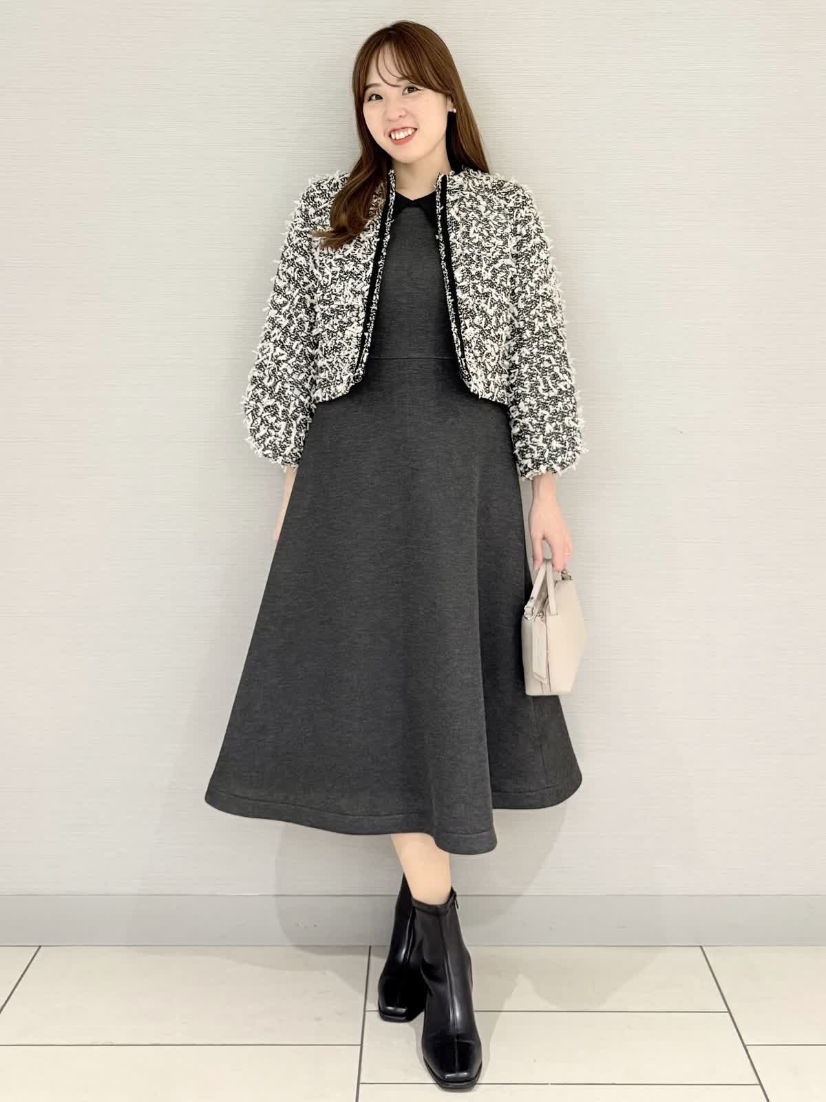 【着用サイズ/カラー】ブルゾン:7号/ブラックワンピース:9号/グレー冨張愛さんコラボアイテム♪ブルゾンはツイード×ラメが華やかで秋冬のおでかけにぴったりです。ワンピースは襟とお袖に拘りフェミニンにモード感がプラス。グレーは襟が黒なので落ち着いた雰囲気でお召しいただけます。【サイズ感】どちらもいつものサイズでよろしいかと思います。普段9号ですがブルゾンは7号を着用したところ前を閉めるとゆとりがあまりなく、袖も短く感じました!ワンピースはいつものサイズで少しゆとりがあったので、普段サイズを迷う方でピッタリ目に着たい方は下のサイズをお選びいただいてよろしいかと思います。