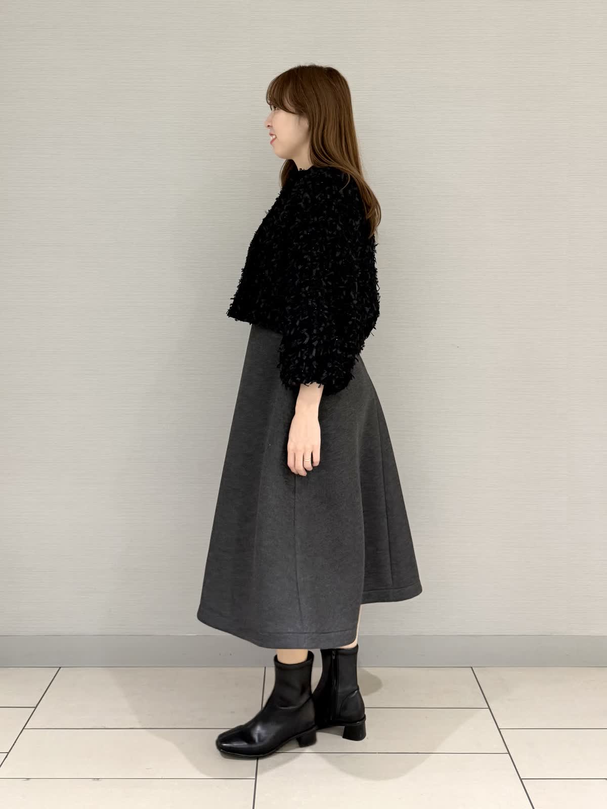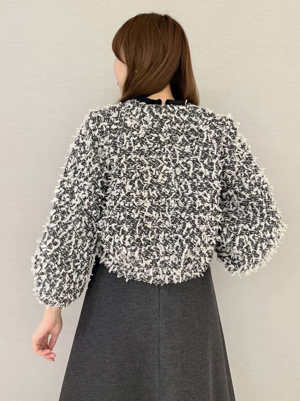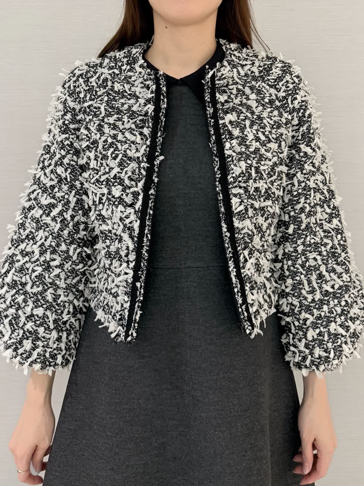【着用サイズ/カラー】ブルゾン:7号/ブラックワンピース:9号/グレー冨張愛さんコラボアイテム♪ブルゾンはツイード×ラメが華やかで秋冬のおでかけにぴったりです。ワンピースは襟とお袖に拘りフェミニンにモード感がプラス。グレーは襟が黒なので落ち着いた雰囲気でお召しいただけます。【サイズ感】どちらもいつものサイズでよろしいかと思います。普段9号ですがブルゾンは7号を着用したところ前を閉めるとゆとりがあまりなく、袖も短く感じました!ワンピースはいつものサイズで少しゆとりがあったので、普段サイズを迷う方でピッタリ目に着たい方は下のサイズをお選びいただいてよろしいかと思います。