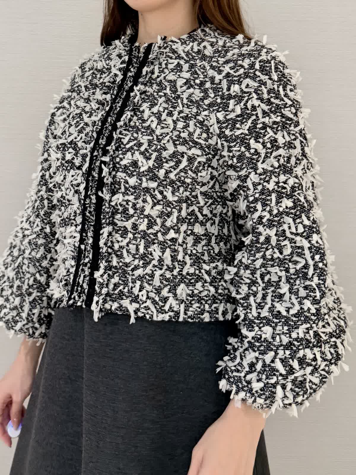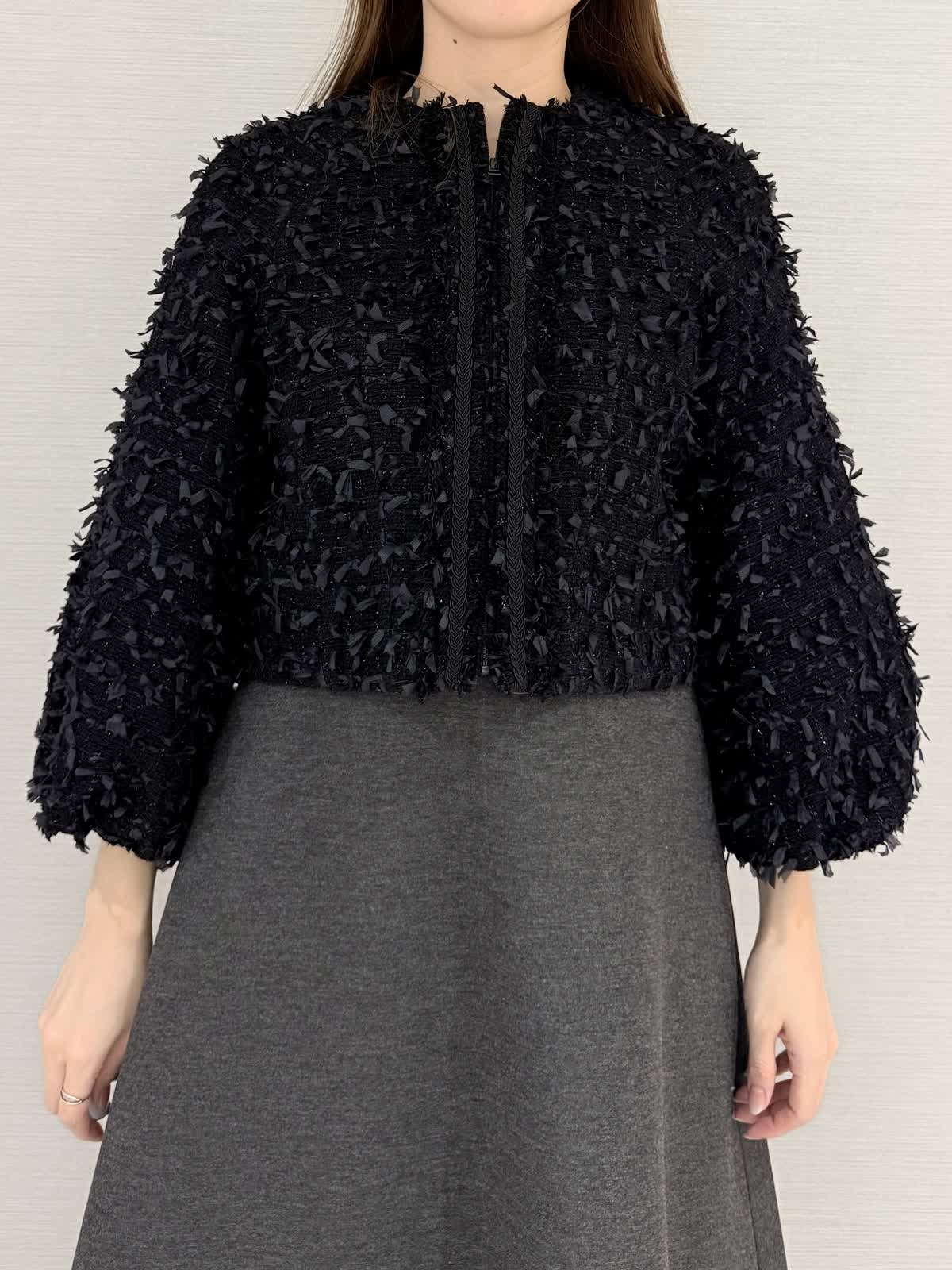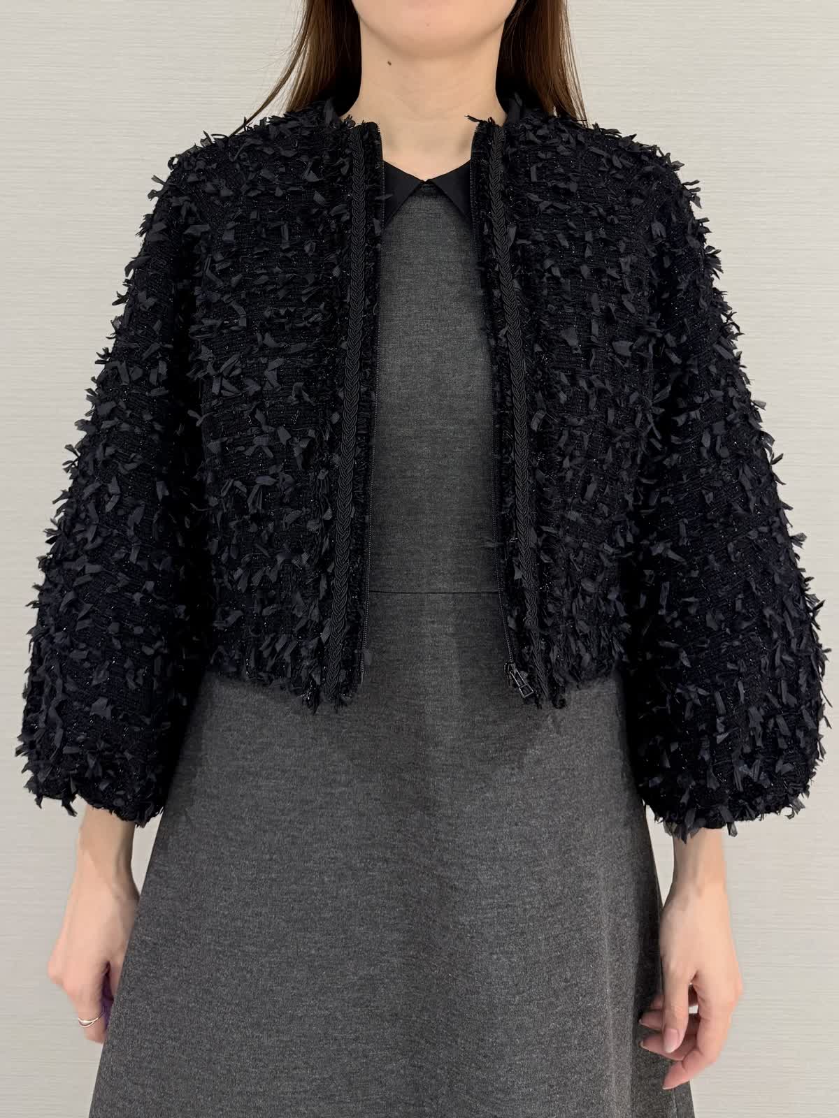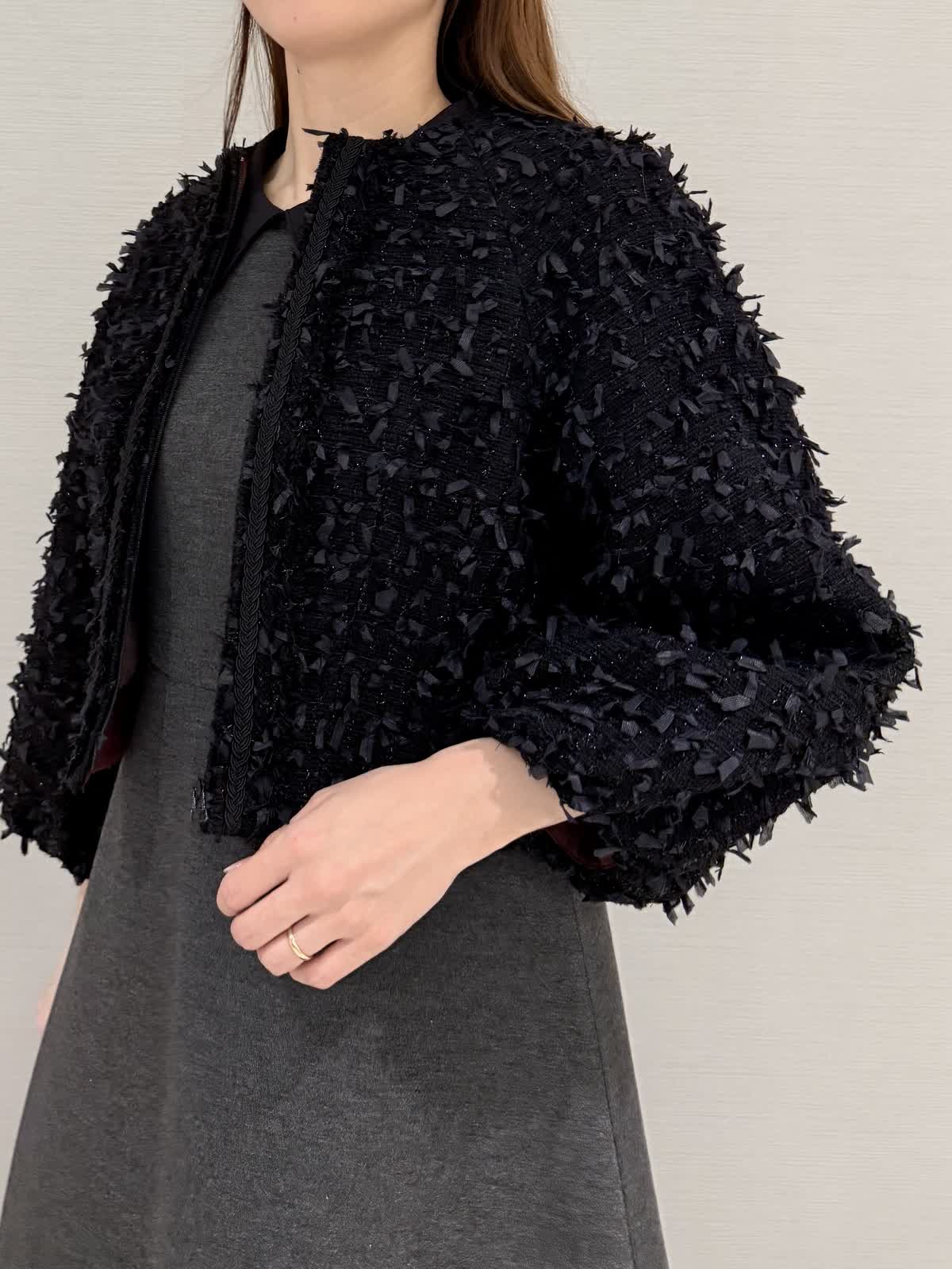 【着用サイズ/カラー】ブルゾン:7号/ブラックワンピース:9号/グレー冨張愛さんコラボアイテム♪ブルゾンはツイード×ラメが華やかで秋冬のおでかけにぴったりです。ワンピースは襟とお袖に拘りフェミニンにモード感がプラス。グレーは襟が黒なので落ち着いた雰囲気でお召しいただけます。【サイズ感】どちらもいつものサイズでよろしいかと思います。普段9号ですがブルゾンは7号を着用したところ前を閉めるとゆとりがあまりなく、袖も短く感じました!ワンピースはいつものサイズで少しゆとりがあったので、普段サイズを迷う方でピッタリ目に着たい方は下のサイズをお選びいただいてよろしいかと思います。