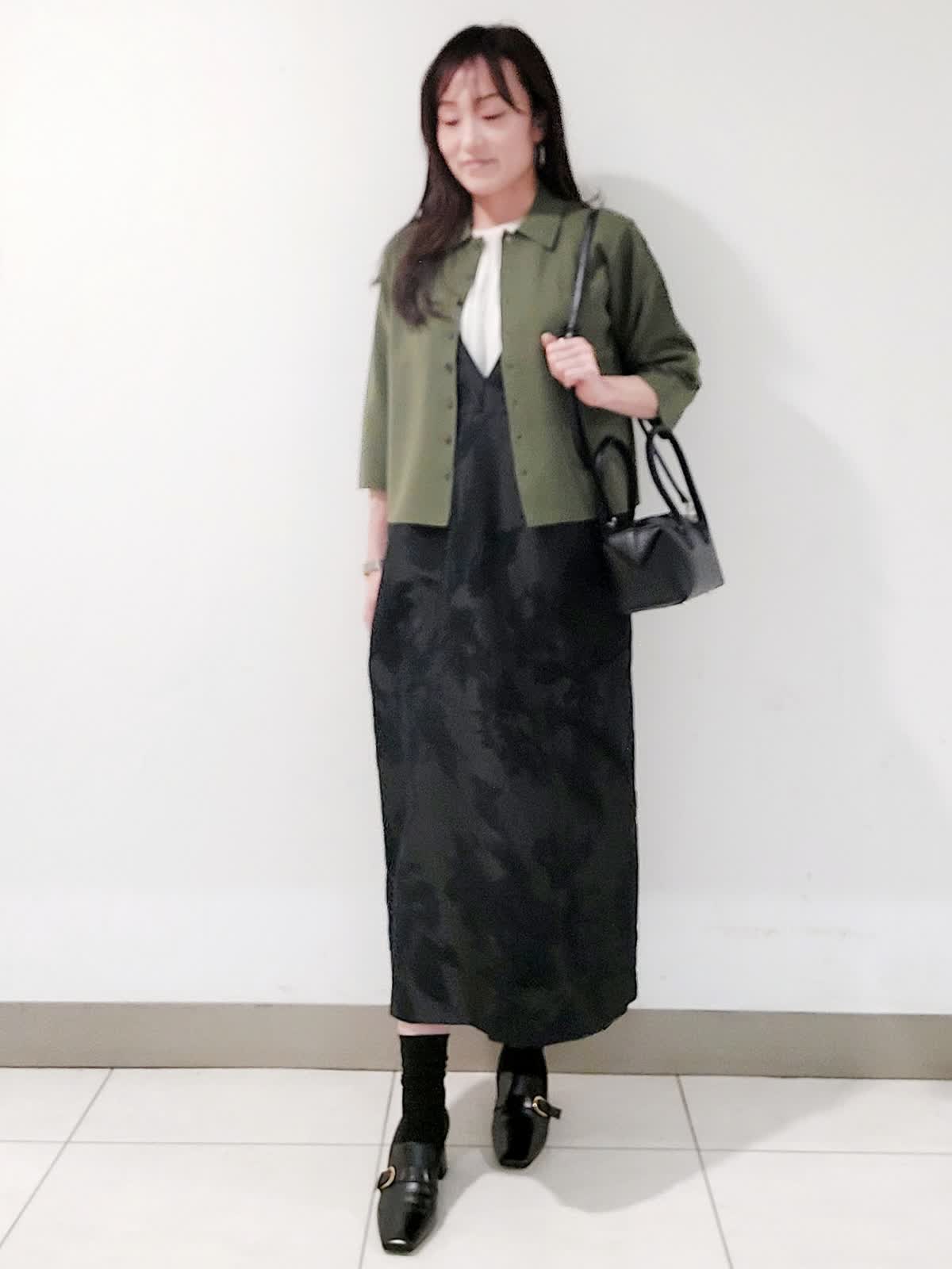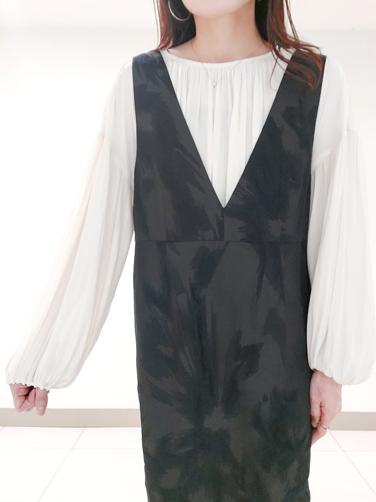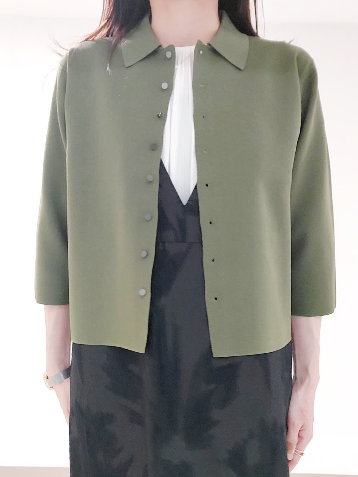 【着用サイズ】カーディガン:フリー ブラウス:フリー ワンピース:9号 上品な小さめの襟とすっきりとしたきれいめなサイズにこだわった5分袖カーディガンは、メタルがポイントです。モードな柄感が印象的な先染めのジャガード素材のジャンパースカートは、高級感がありながら軽くシワになりにくく着心地が良いです。体のラインを拾わないストレートシルエットで細見えします。インナーのブラウスは、贅沢なギャザーと後ろのメタル釦がポイントで羽織りやジャンスカとの合わせで旬なレイヤードスタイルに。