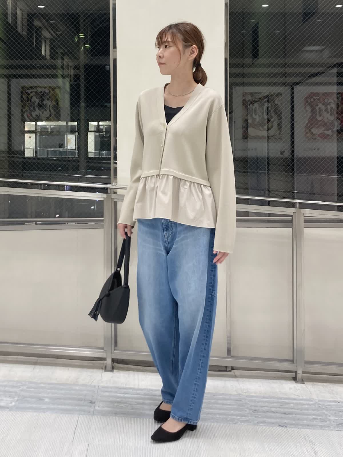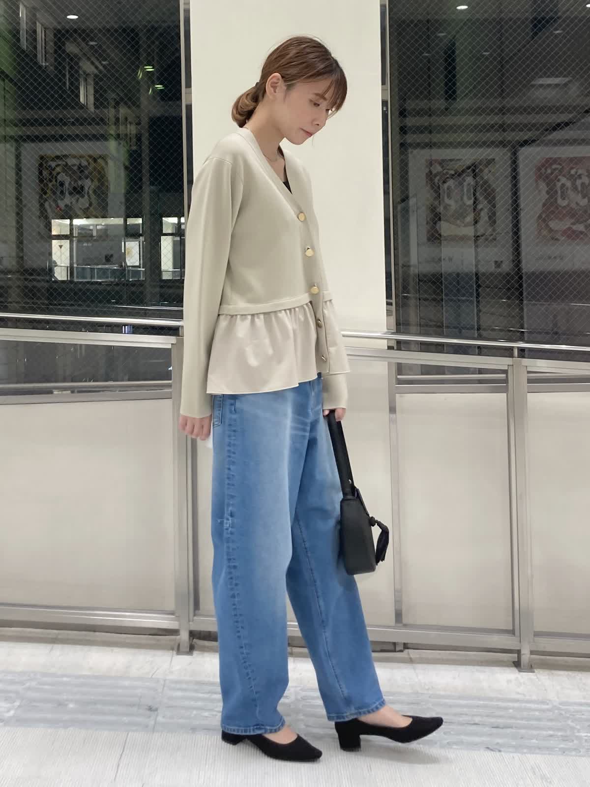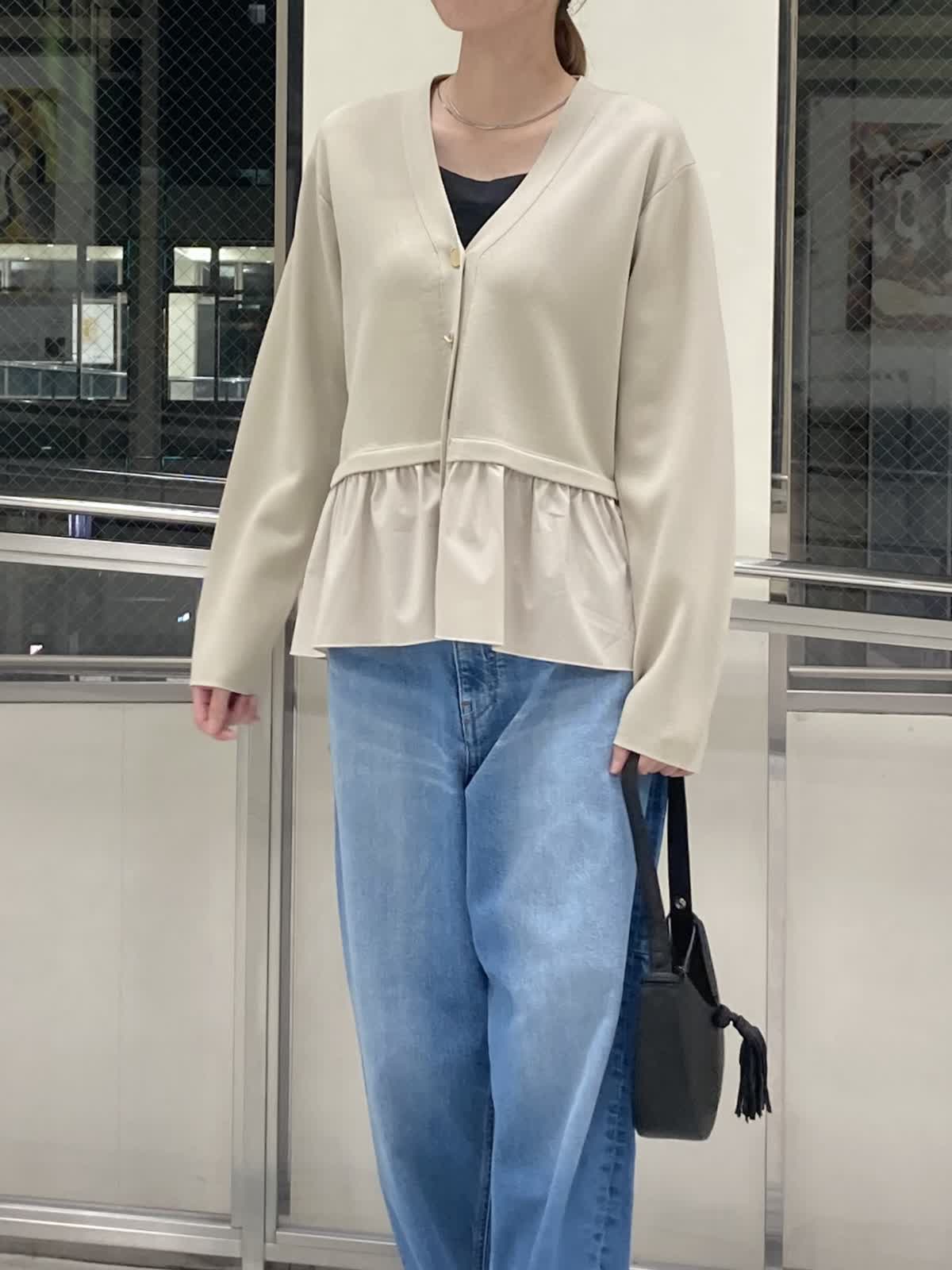 【着用サイズ】カーディガン : フリー パンツ : 9号 【着用カラー】カーディガン : ベージュ パンツ : ブルー 異素材のフリルがポイントのカーディガンをメインに今っぽくバレルデニムを合わせ、大人の綺麗めカジュアルコーデにしました。ストレッチ性があり、柔らかい肌触りで着ていてとても着心地が良いです。Vネックが首元をすっきりさせてくれます。