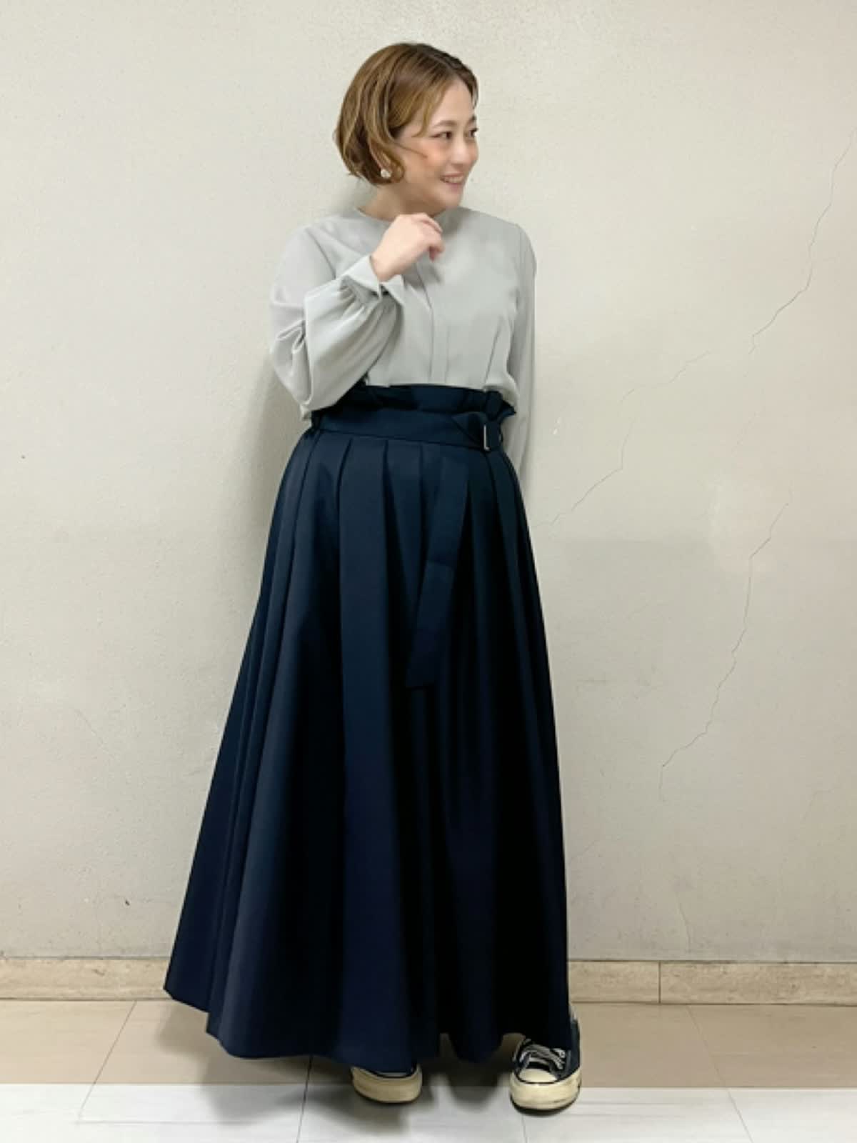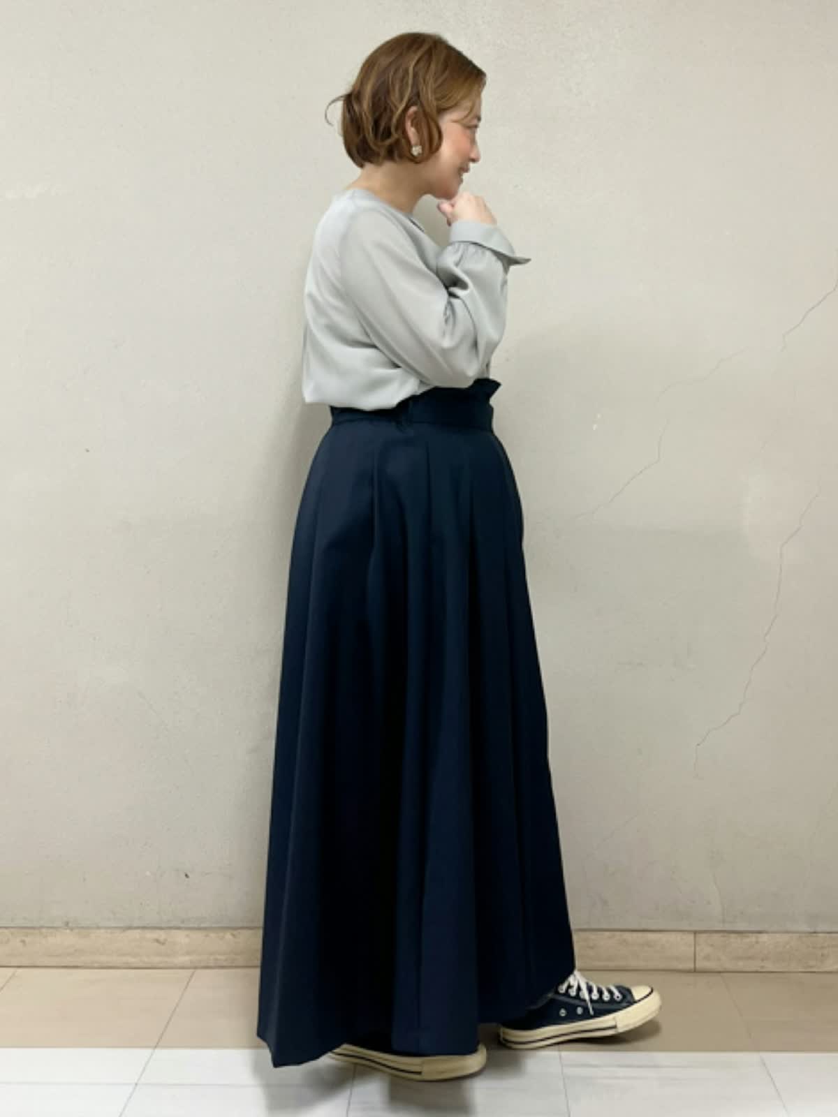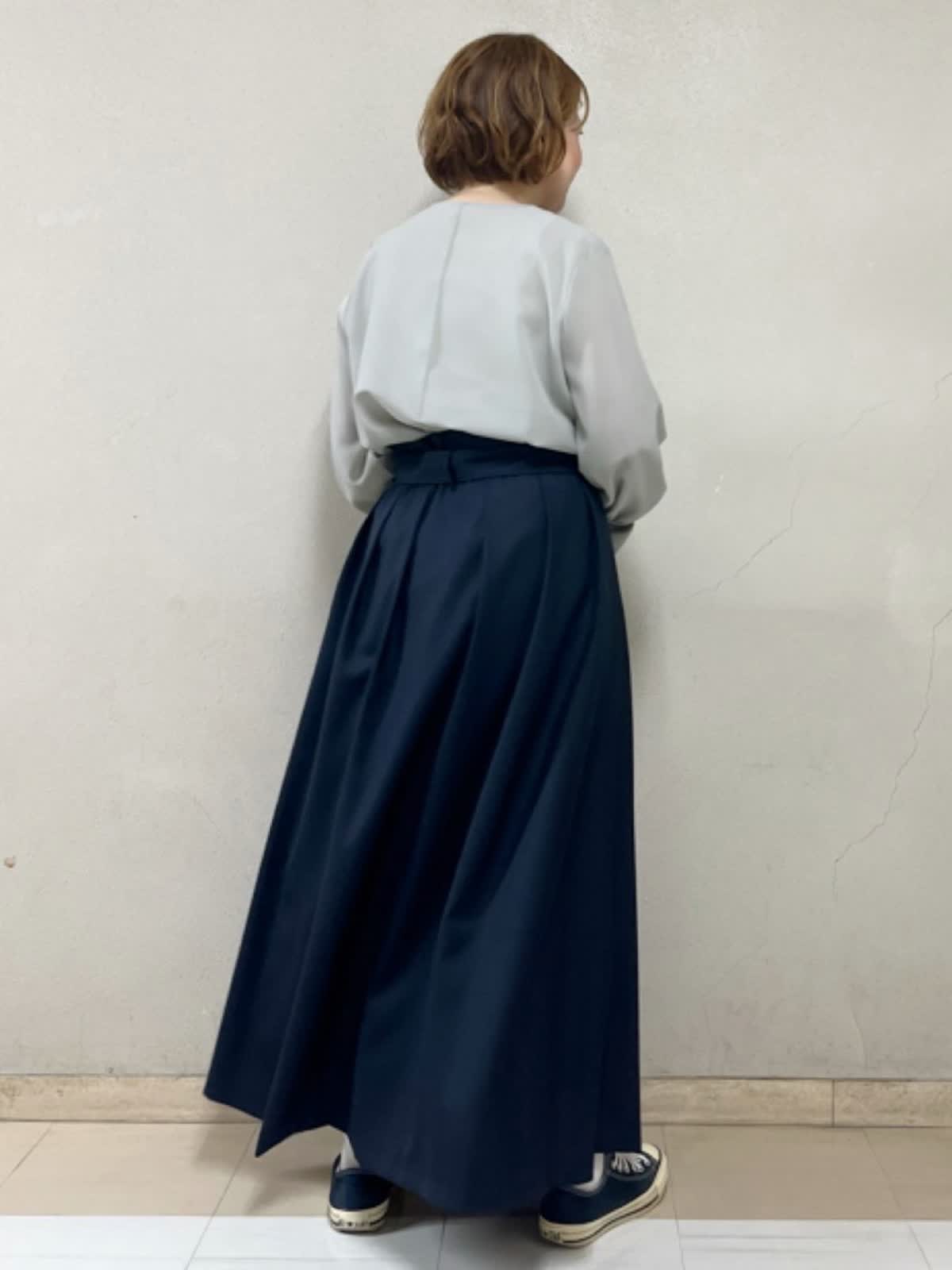 【着用サイズ】ブラウス:9号 スカート:フリーサイズ 【着用カラー】ブラウス:グレー スカート:ネイビー 休日のお出かけコーディネートです。シアー感が上品なブラウスです。比翼ですっきりとしたデザインです。羽織りとしても使えます。スカートはハイウエストでスタイルアップして見せてくれます。歩く度に出る揺れ感がきれいです。2型ありロング丈とレギュラー丈があります。ロング丈でスタイリングしてみました。
