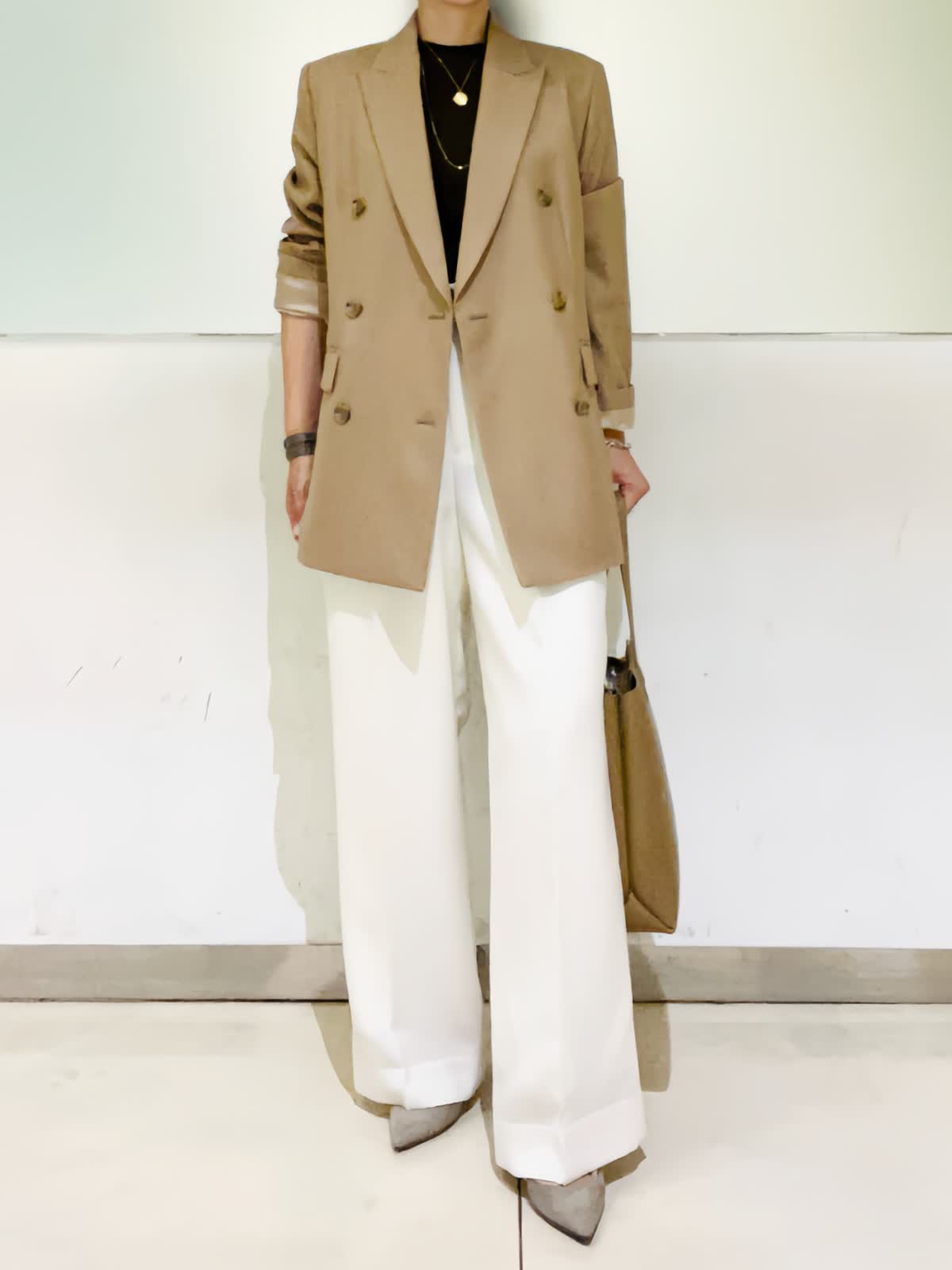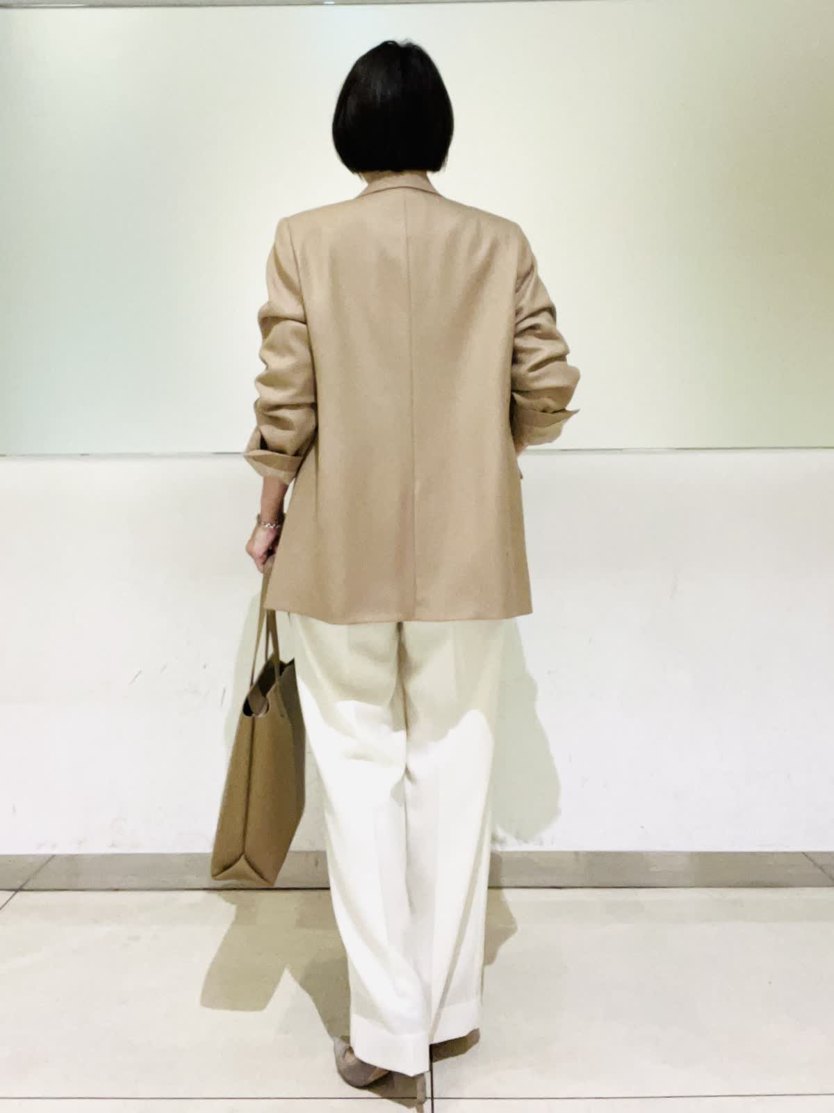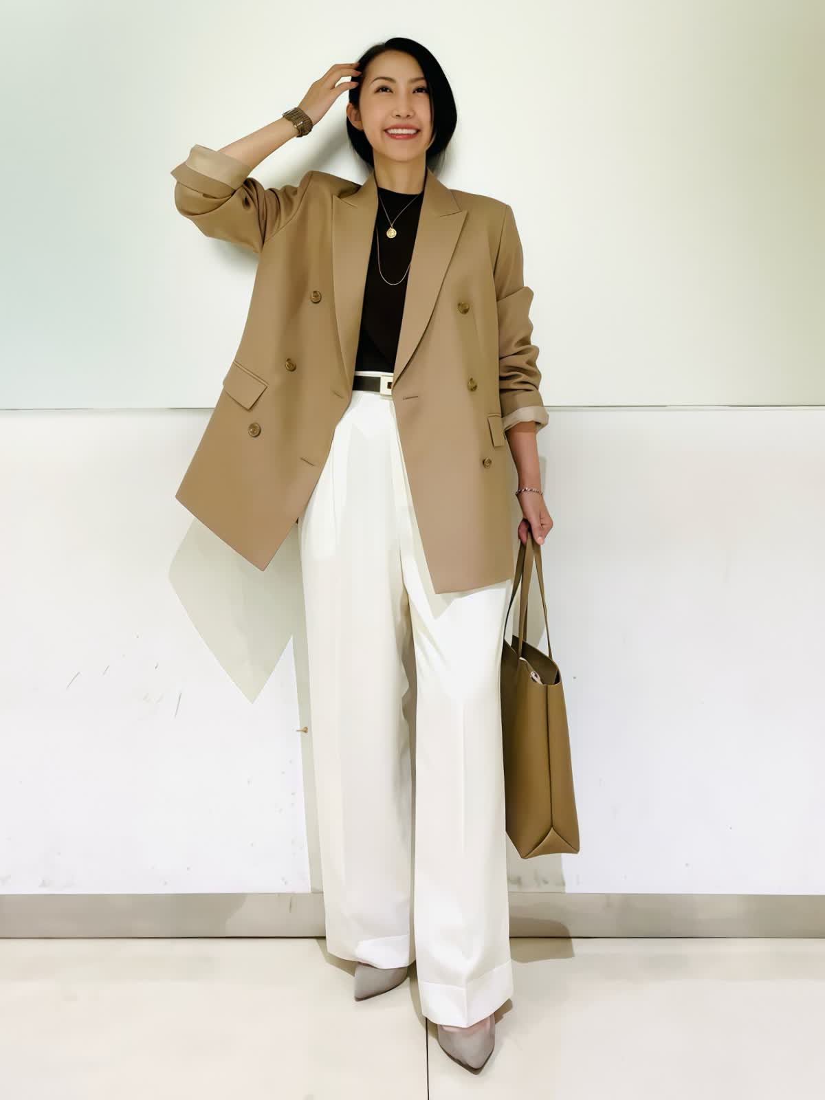 【着用アイテム】すべて9号 【着用カラー】ジャケット:キャメル ニット:ダークブラウン パンツ:オフホワイト 秋のオフィスカジュアル。キャメル×ホワイトの大人の上品な組み合わせ。インナーに今年トレンドのブラウンのニットを合わせました。ブラウンが入ることでコーディネートがしまります。トレンドカラーをしっかりおさえれば、ベーシックなコーディネートもよりこなれ感がでるのでおすすめです。