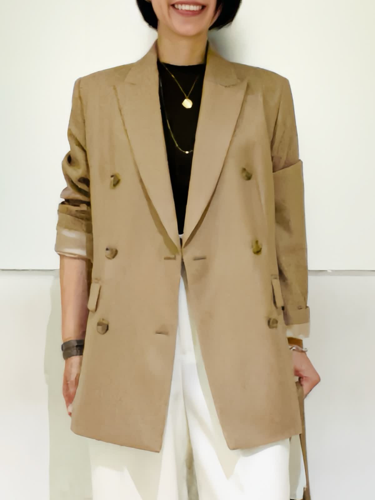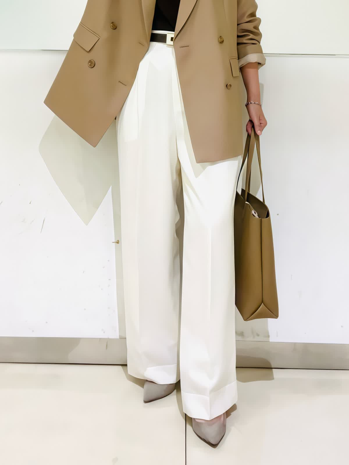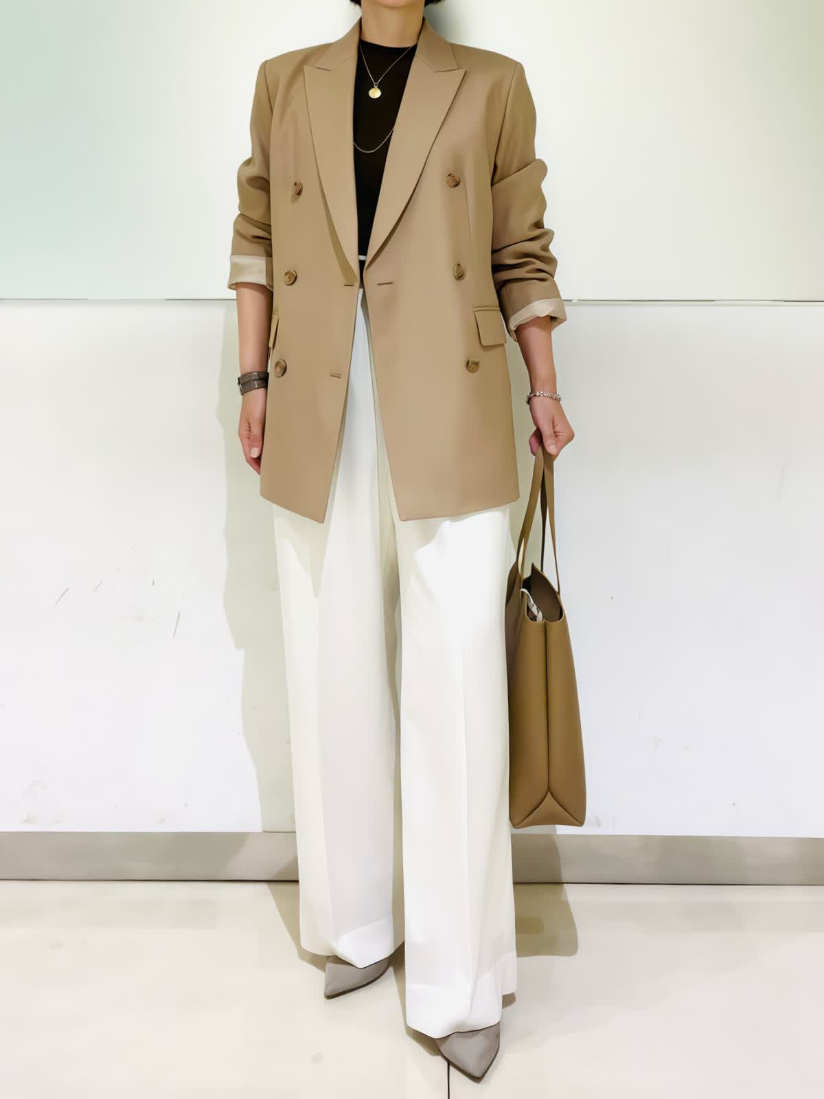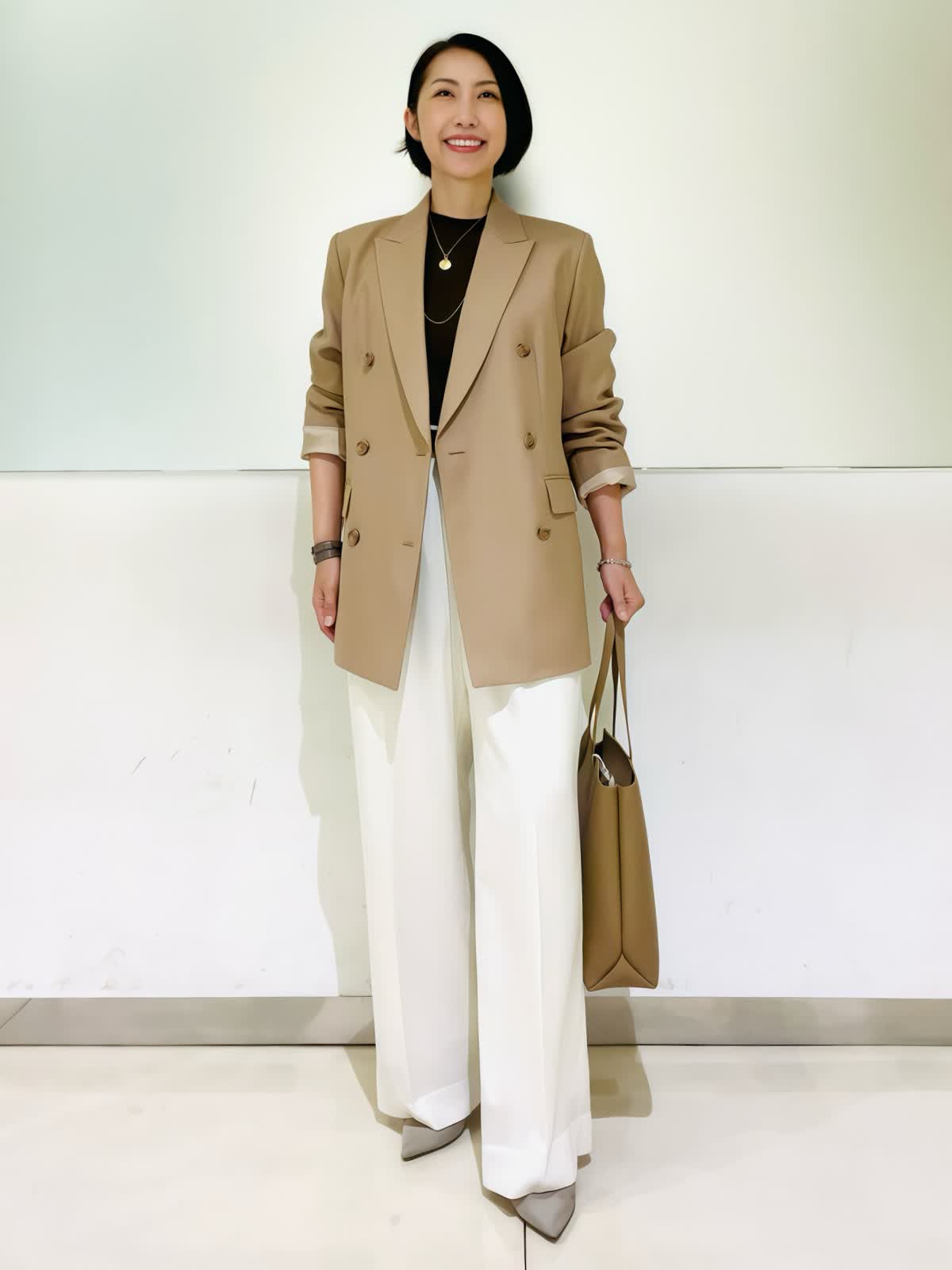 【着用アイテム】すべて9号 【着用カラー】ジャケット:キャメル ニット:ダークブラウン パンツ:オフホワイト 秋のオフィスカジュアル。キャメル×ホワイトの大人の上品な組み合わせ。インナーに今年トレンドのブラウンのニットを合わせました。ブラウンが入ることでコーディネートがしまります。トレンドカラーをしっかりおさえれば、ベーシックなコーディネートもよりこなれ感がでるのでおすすめです。