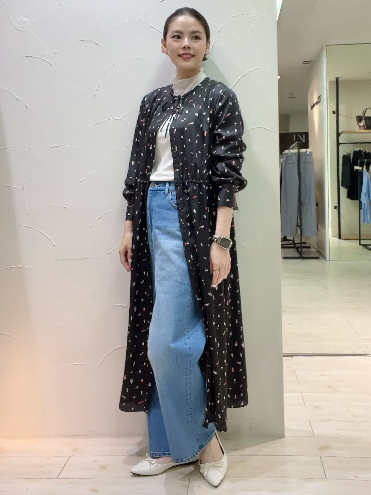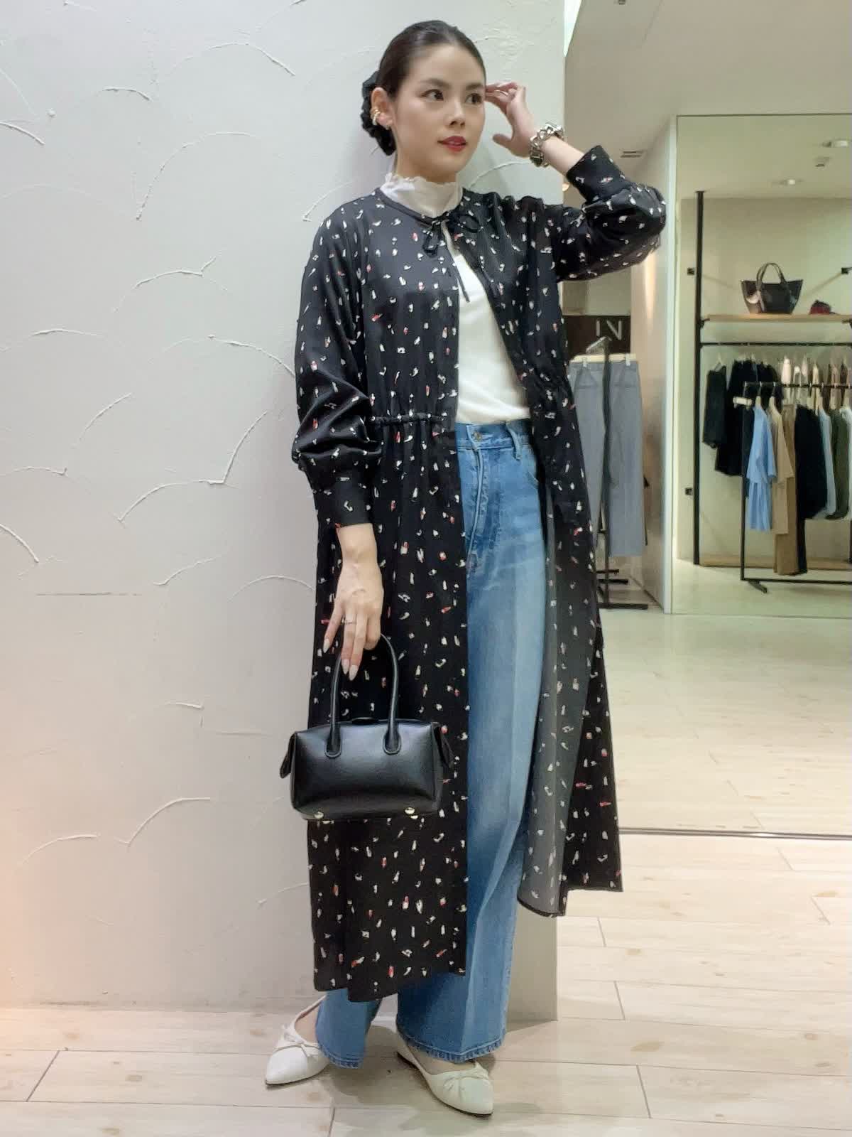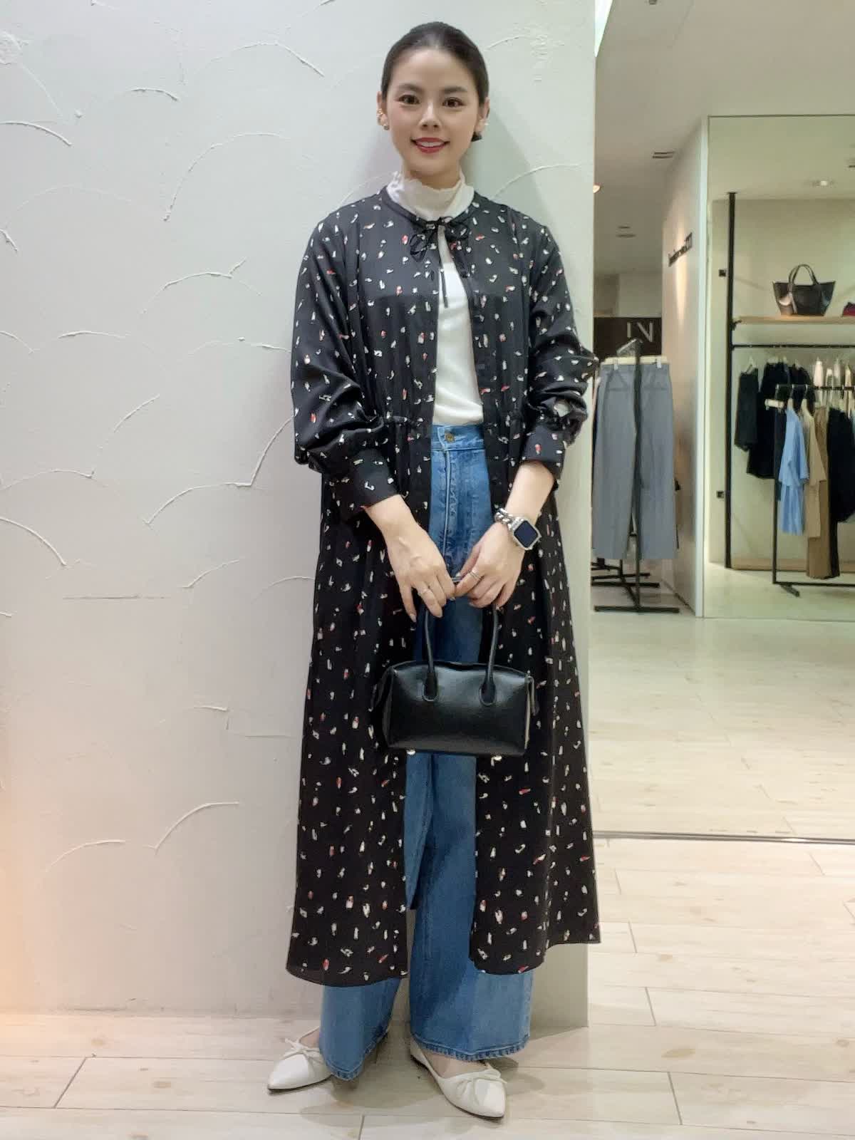 ワンピースレイヤードコーディネート。デニムと合わせた旬なスタイリング。もう少し肌寒くなったらウール素材のインナーを合わせると季節長くお召しいただくことが出来ます。サラッとした素材でシワになりづらく、羽織りとしてもワンピースとしてもおすすめです