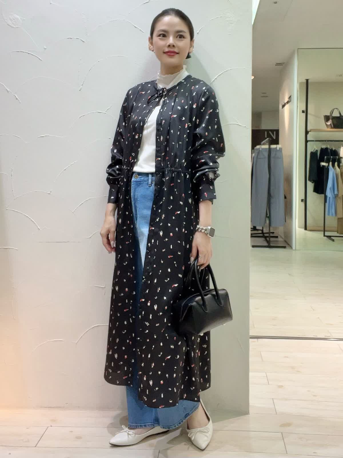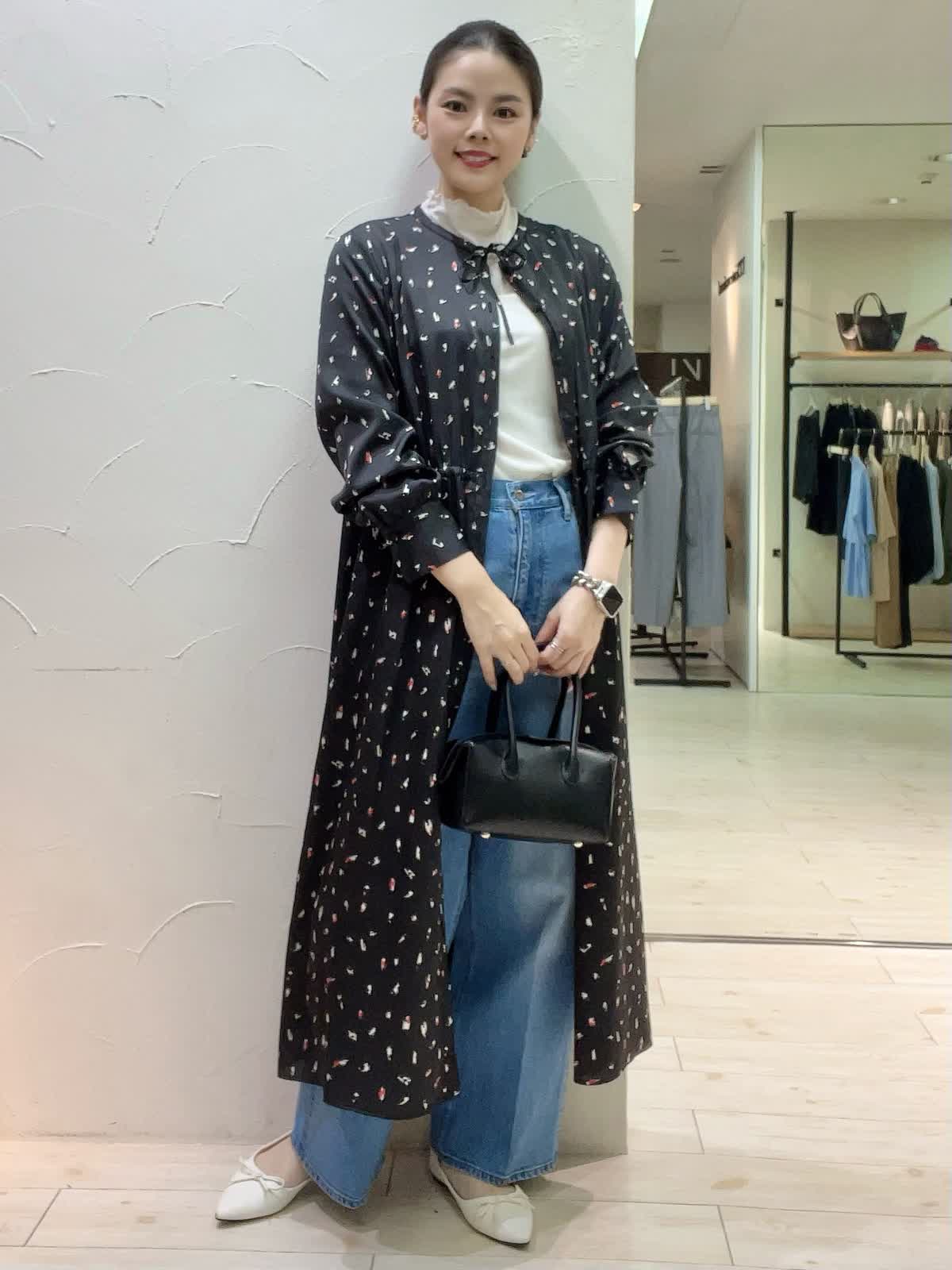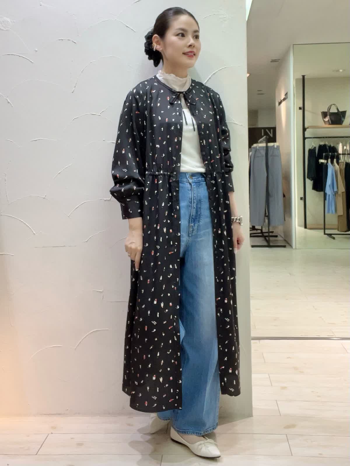 ワンピースレイヤードコーディネート。デニムと合わせた旬なスタイリング。もう少し肌寒くなったらウール素材のインナーを合わせると季節長くお召しいただくことが出来ます。サラッとした素材でシワになりづらく、羽織りとしてもワンピースとしてもおすすめです