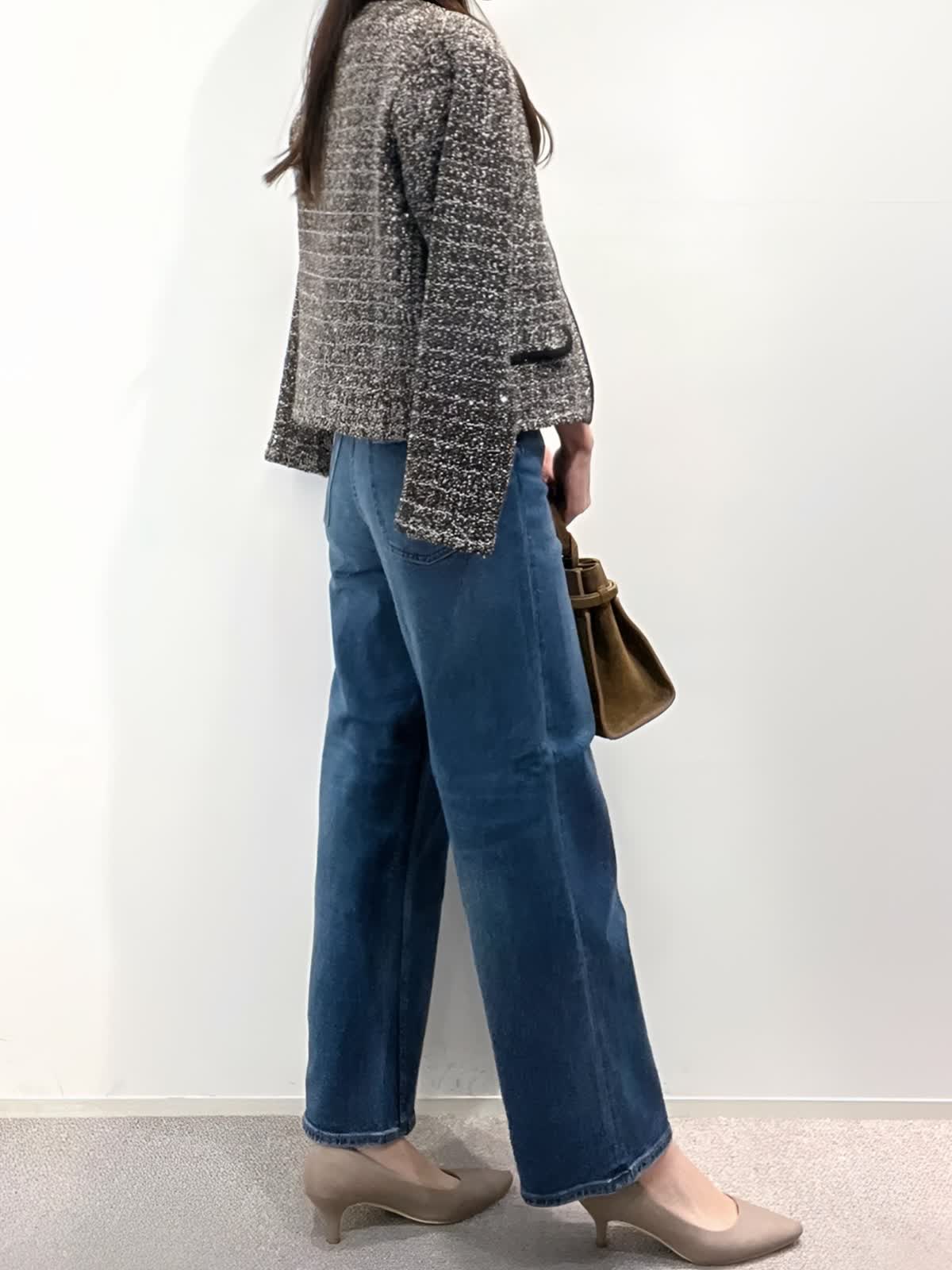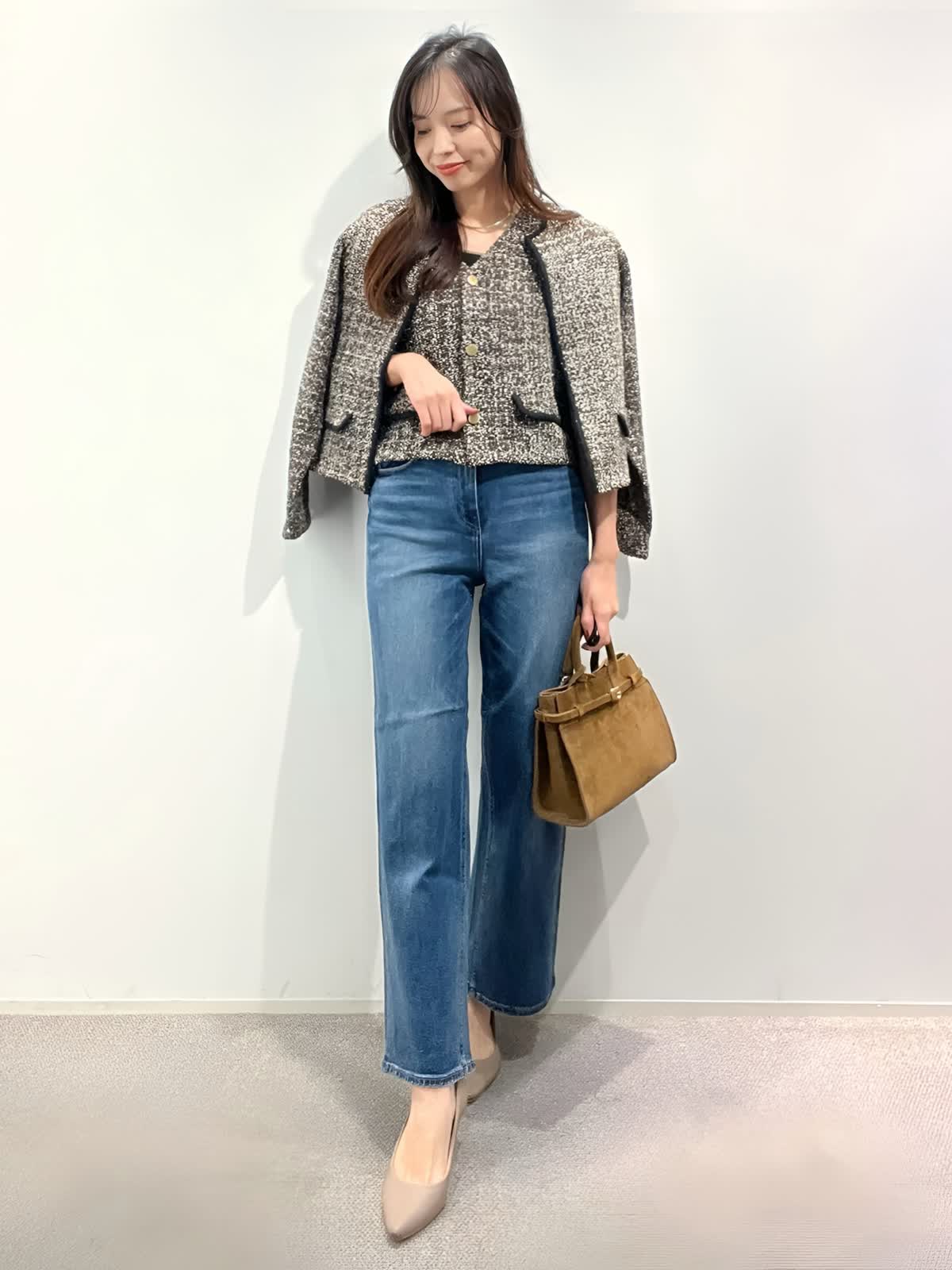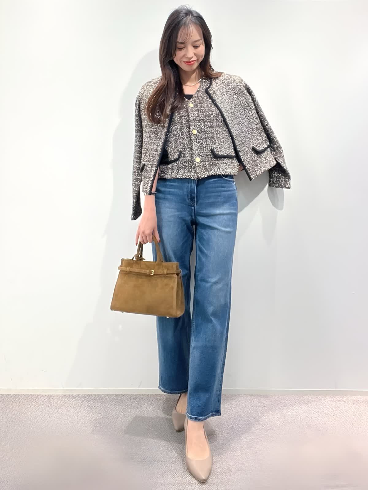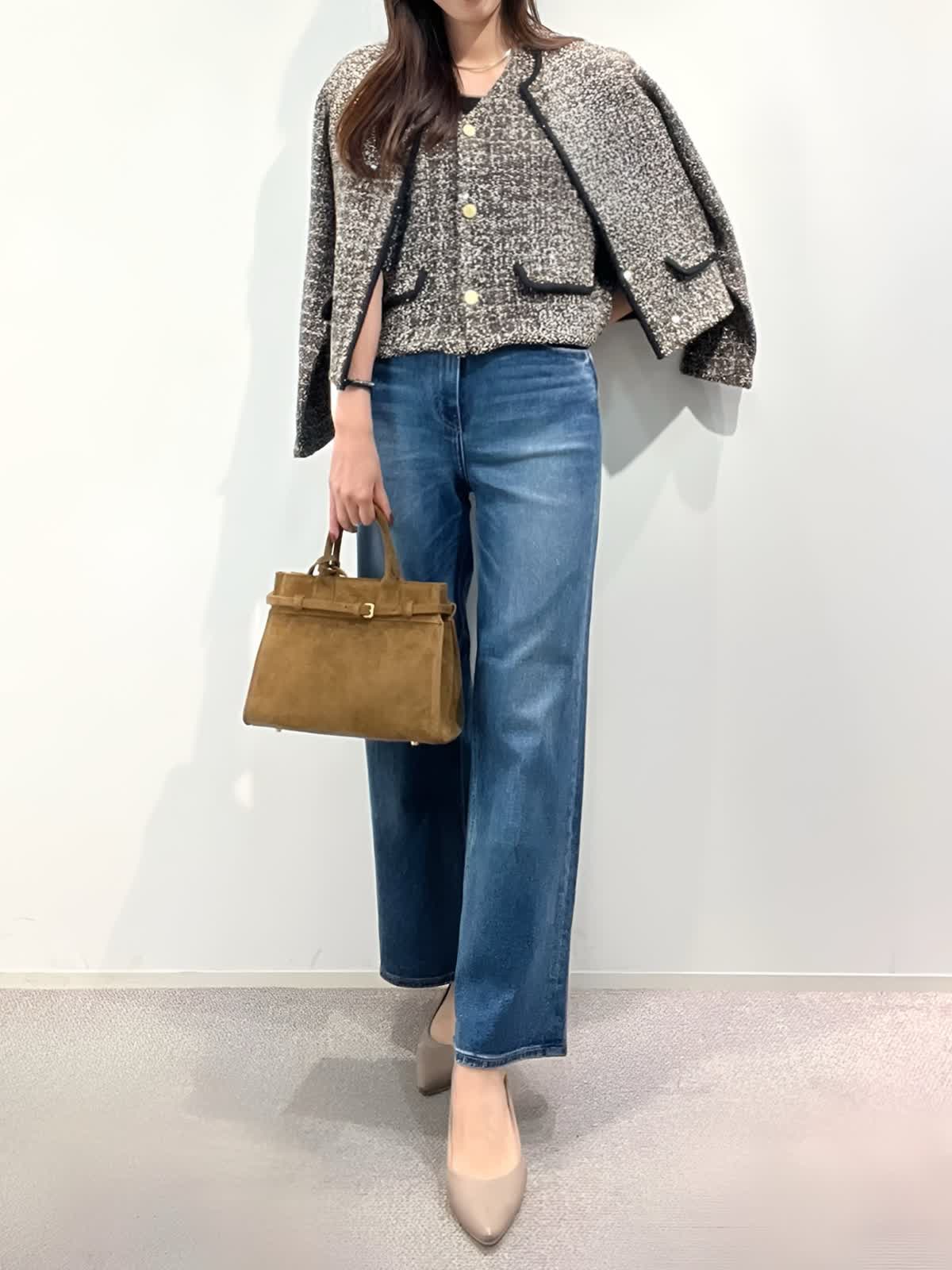 【着用サイズ】カーディガン:9号 ジレ:9号 カットソー:9号 パンツ:9号 【着用カラー】カーディガン:ブラウン ジレ:ブラウン カットソー:ブラック パンツ:インディゴ バッグ:ブラウン 「きれいめツイードで王道ミックスカジュアルコーデ」 ツイード風に仕上げたカーディガンとジレは、キラキラと光るスパンコールが、華やかさとエレガントさを演出。上品で高級のあるデザインで、コーディネートの格上げアイテムに。ウール8%なので、季節の変わり目にも活用しやすく、秋のスタイリングにおすすめなアイテムです。ニットジャケットとのアンサンブルで、セットで合わせるとより華やかさアップ。デニムと合わせることで、こなれ感のある大人のきれいめカジュアルスタイルに。 秋のお出かけシーンにぴったりなおすすめコーデです。