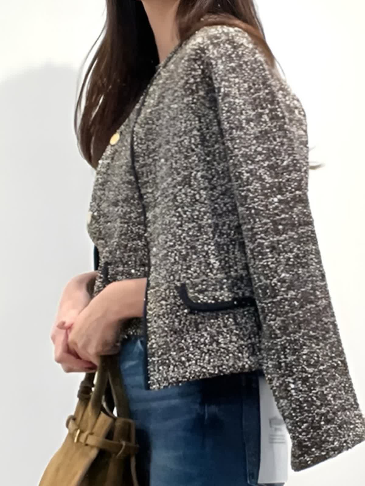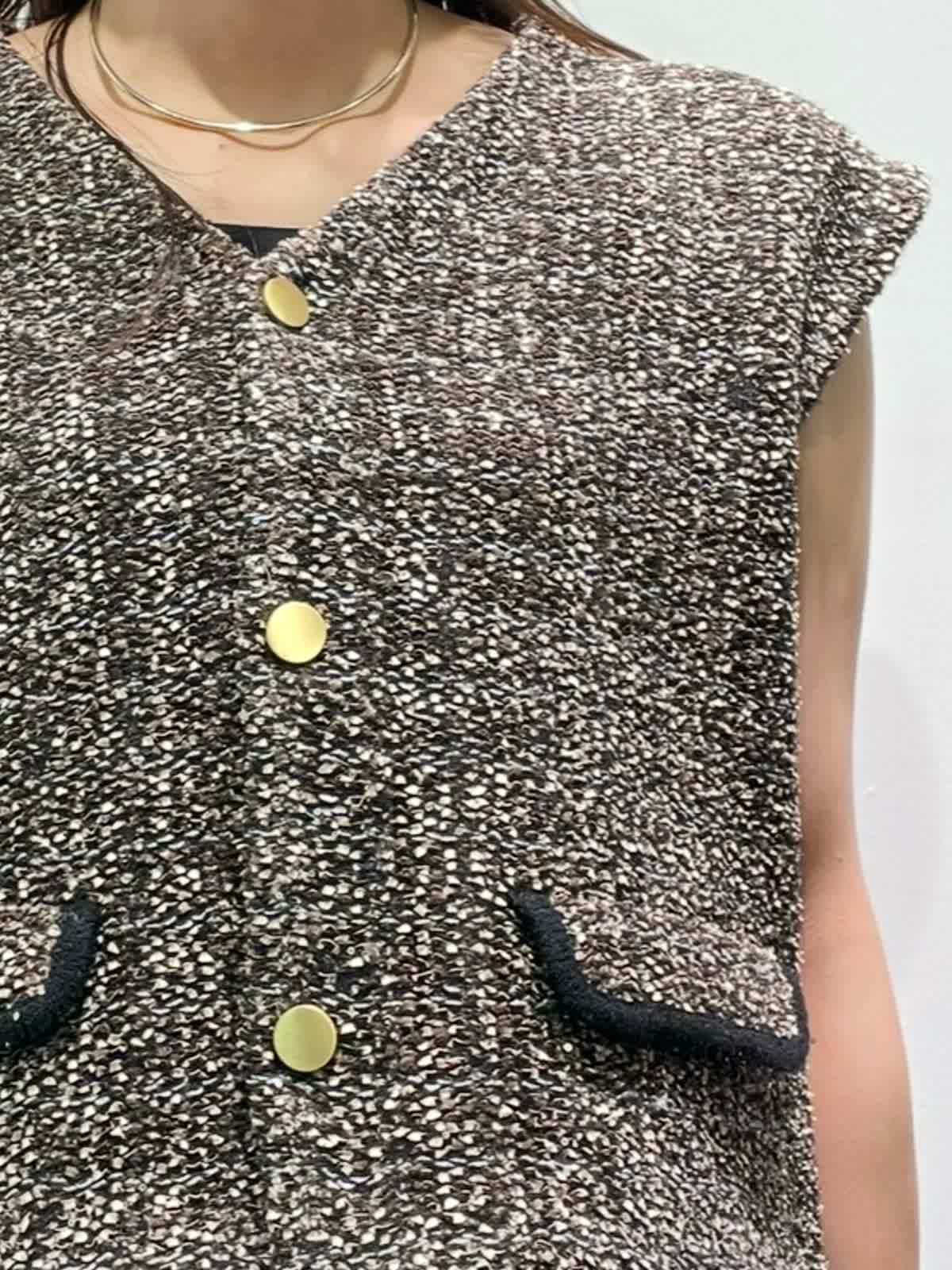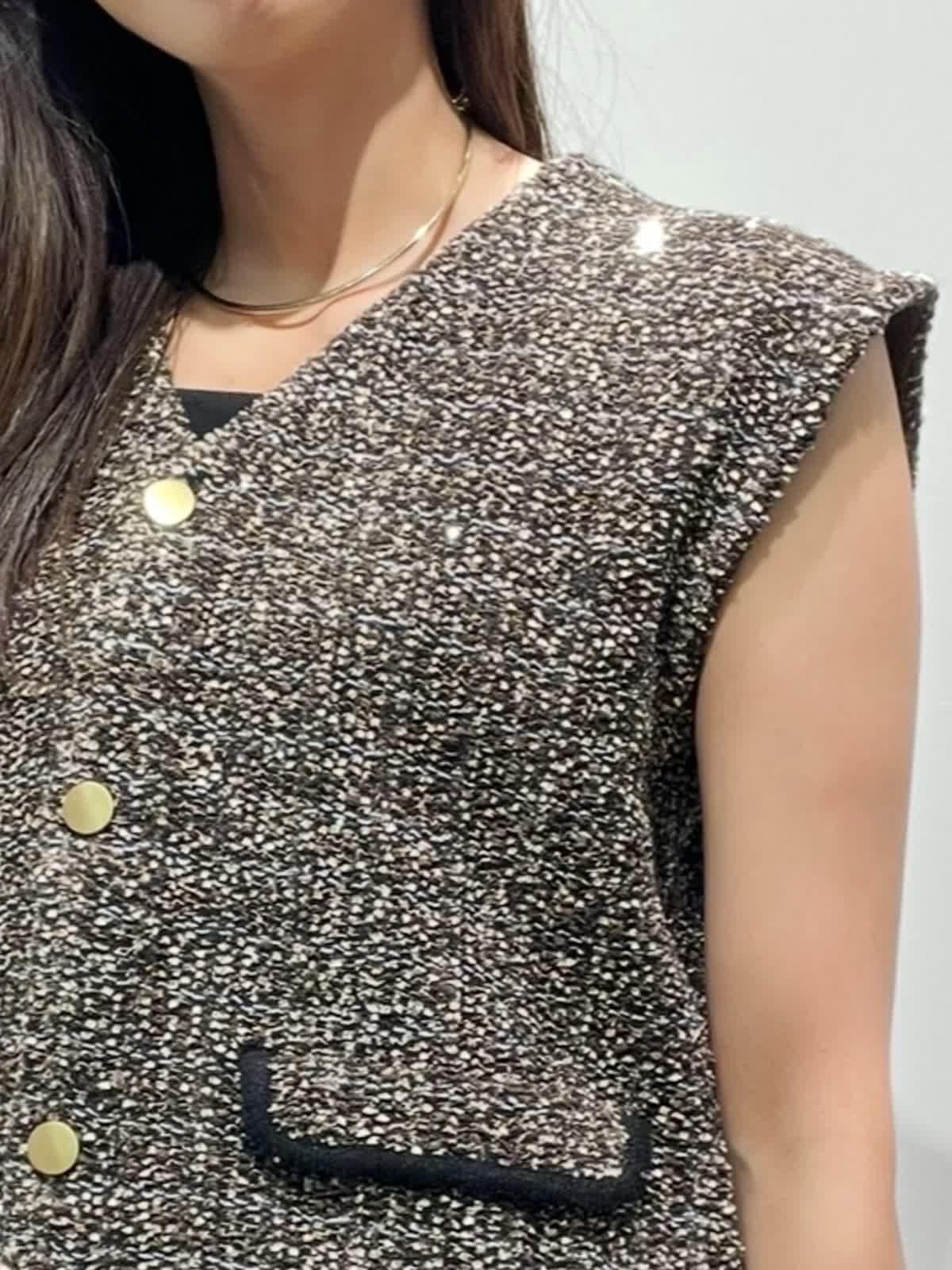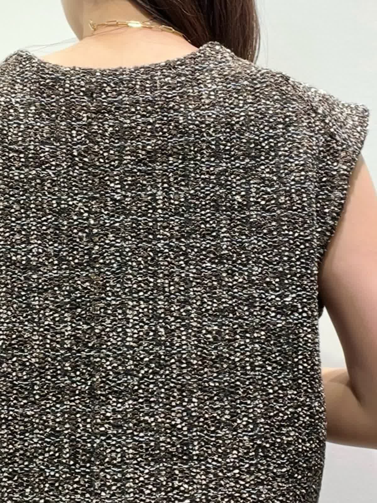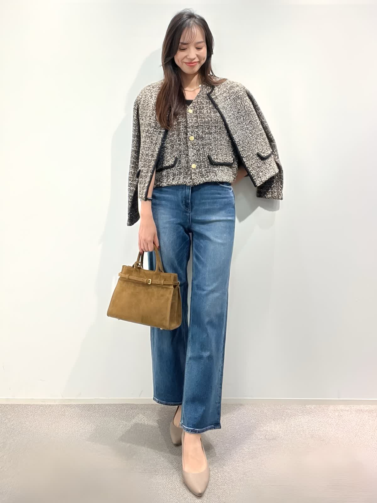 【着用サイズ】カーディガン:9号 ジレ:9号 カットソー:9号 パンツ:9号 【着用カラー】カーディガン:ブラウン ジレ:ブラウン カットソー:ブラック パンツ:インディゴ バッグ:ブラウン 「きれいめツイードで王道ミックスカジュアルコーデ」 ツイード風に仕上げたカーディガンとジレは、キラキラと光るスパンコールが、華やかさとエレガントさを演出。上品で高級のあるデザインで、コーディネートの格上げアイテムに。ウール8%なので、季節の変わり目にも活用しやすく、秋のスタイリングにおすすめなアイテムです。ニットジャケットとのアンサンブルで、セットで合わせるとより華やかさアップ。デニムと合わせることで、こなれ感のある大人のきれいめカジュアルスタイルに。 秋のお出かけシーンにぴったりなおすすめコーデです。