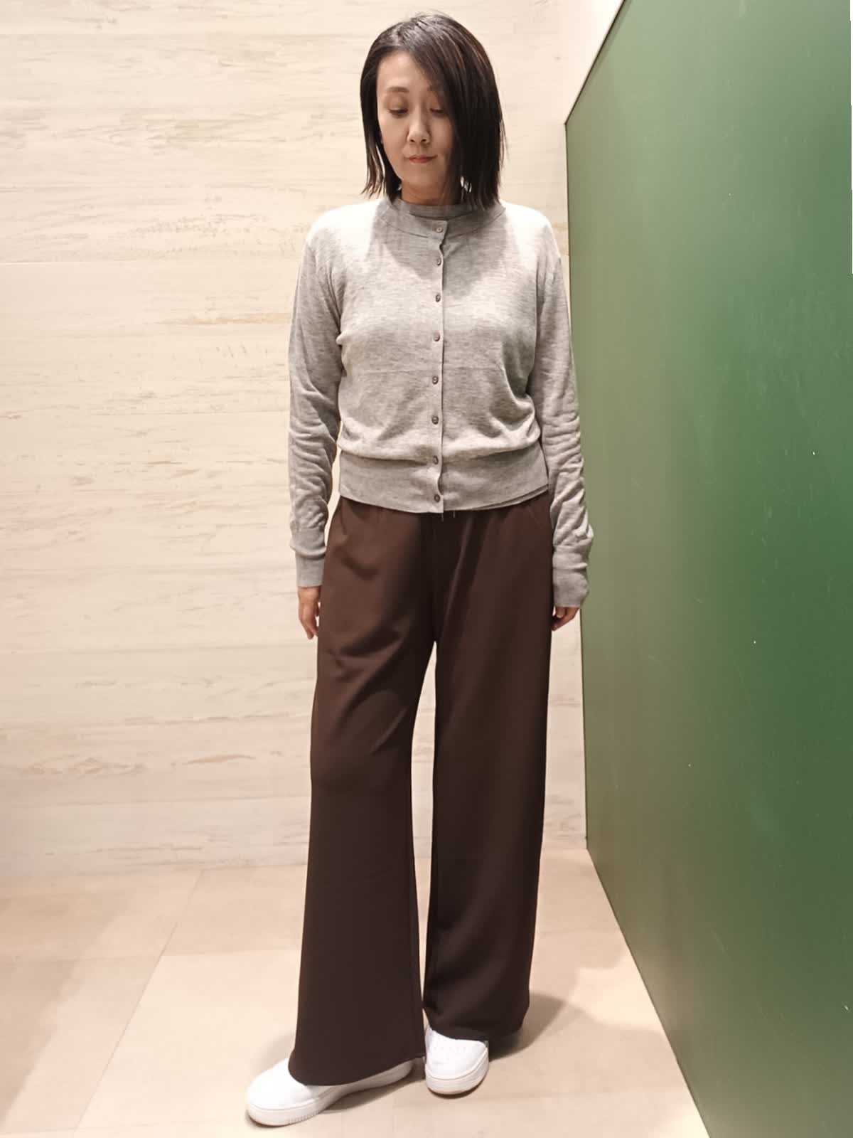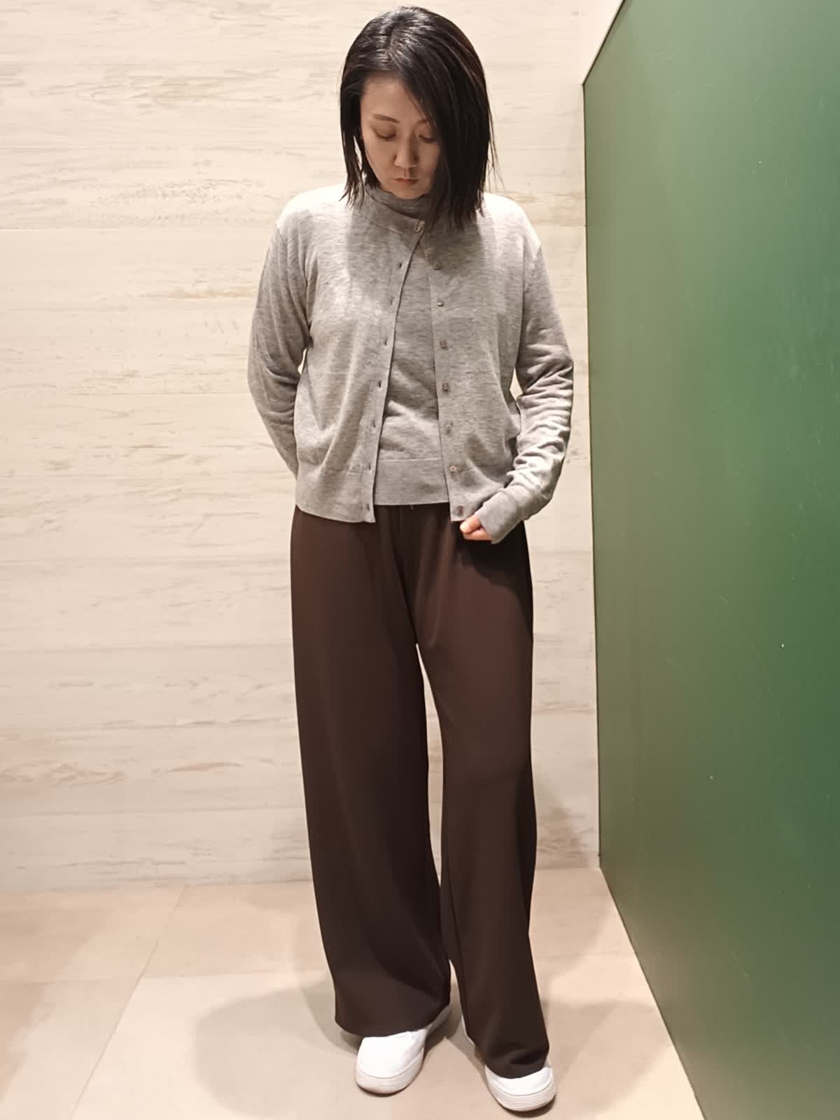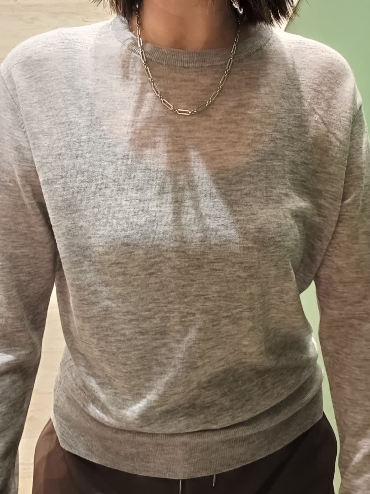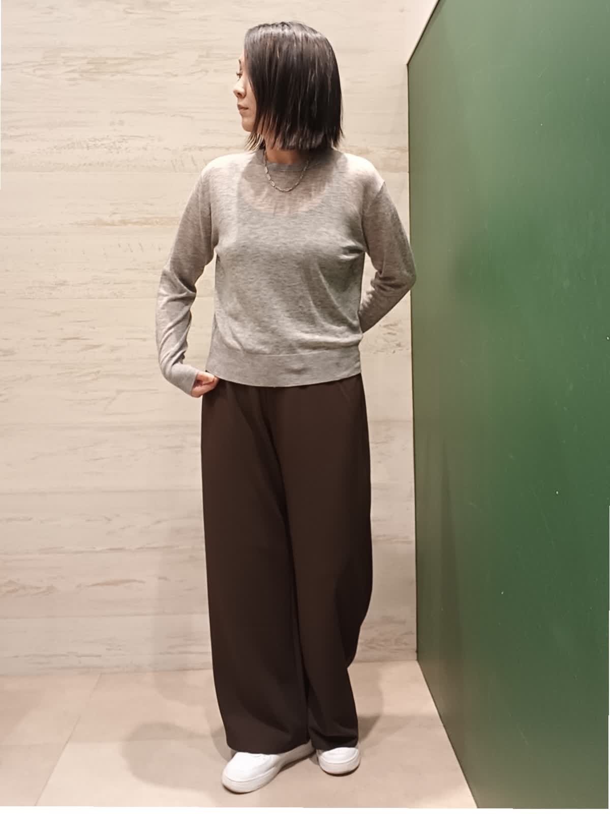 【着用サイズ/カラー】クルーネックプルオーバー:グレー/フリー クルーネックカーディガン:グレー/フリー イージーパンツ:ブラウン/フリー ニットはウール100%でトレンドのシアータイプ。ふんわり軽く、とても暖かいので冬までトップスとしても着ていただけます。透け感が気になる方は、アームはゆったりしていて伸縮性もあるので、長袖インナーも着れるサイズ感です。アンサンブル合わせもおすすめです。パンツはウールなど、毛うつりしにくいジョーゼット素材です。寒冷地にお住まいの方はタイツやレギンスなど、サラッとした履き心地でインナーも合わせやすく寒さ対策しやすいですよ。