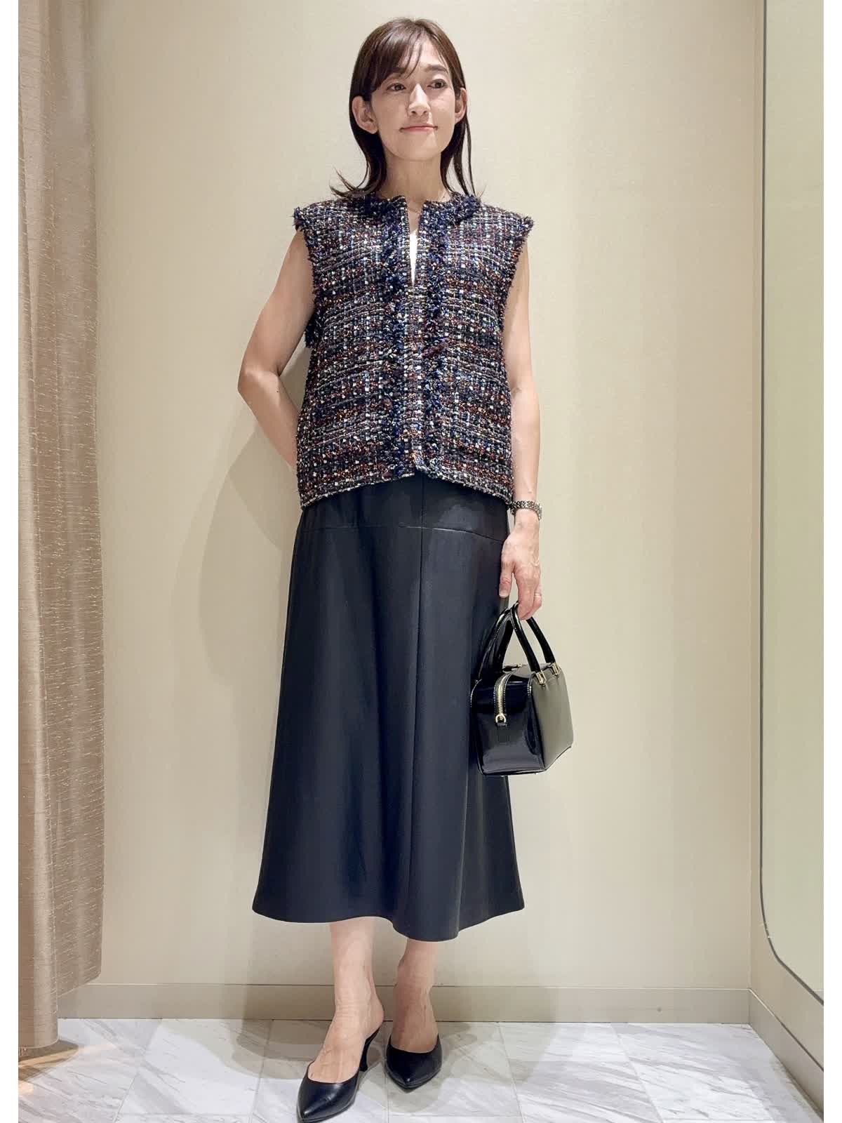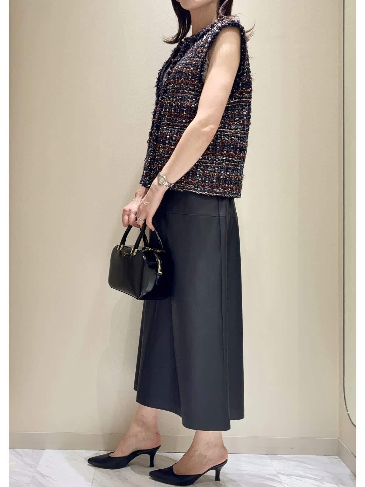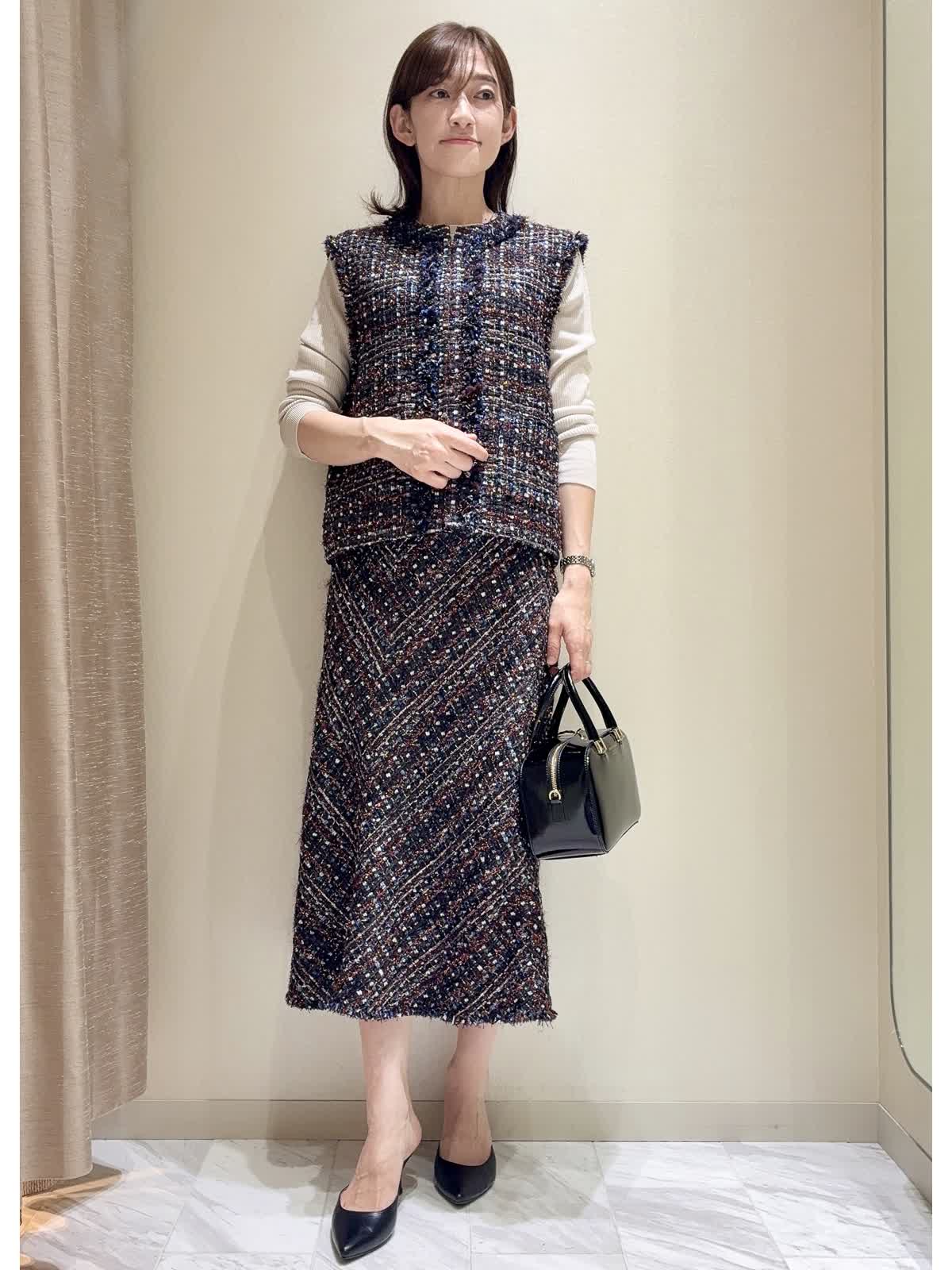【着用サイズ】全て:9号 【着用カラー】ツイードジレ/スカート:ブルー ニット:グレーベージュ レザー風スカート:ブラック バッグ:ブラック 新作セットアップです。 ラメ糸があしらわれたツイードが秋冬らしく、とても華やかな印象です。 インナーやボトムスを変えて、きれい目にもカジュアルにも着回しを楽しめるデザインです。 ジレはすっきりとした着丈で、トレンドのロングスカートやワイドパンツとも合わせやすいです。