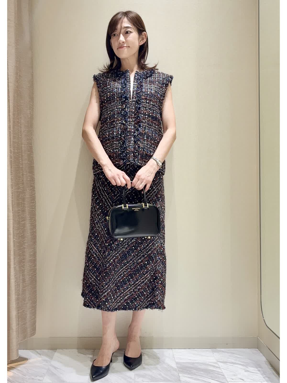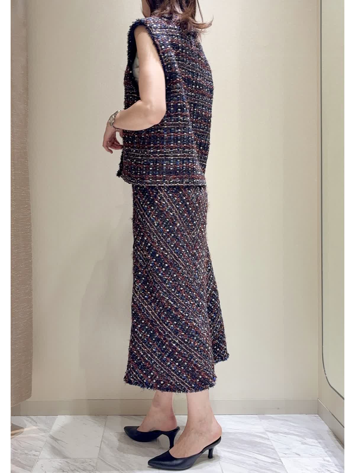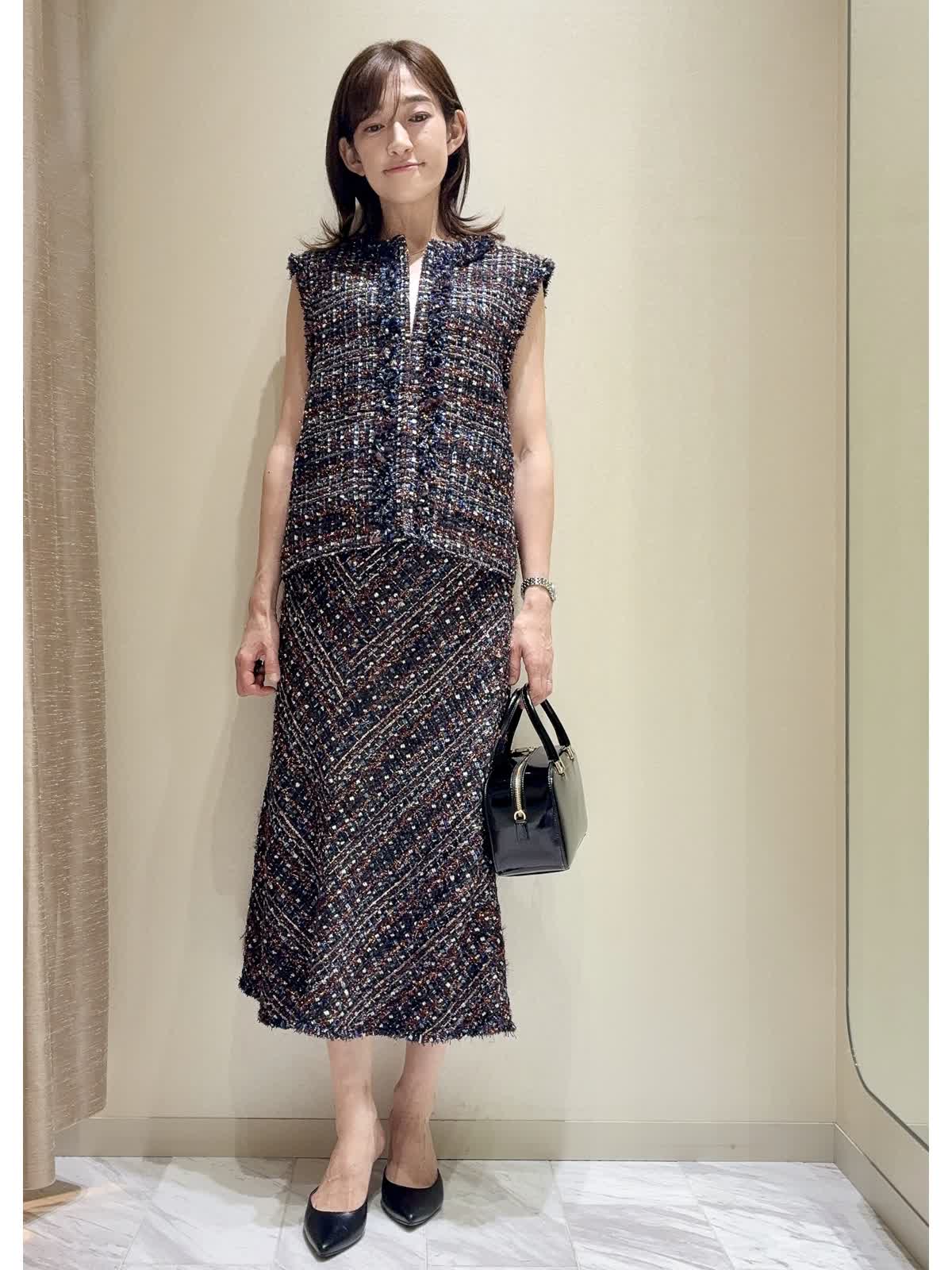 【着用サイズ】全て:9号 【着用カラー】ツイードジレ/スカート:ブルー ニット:グレーベージュ レザー風スカート:ブラック バッグ:ブラック 新作セットアップです。 ラメ糸があしらわれたツイードが秋冬らしく、とても華やかな印象です。 インナーやボトムスを変えて、きれい目にもカジュアルにも着回しを楽しめるデザインです。 ジレはすっきりとした着丈で、トレンドのロングスカートやワイドパンツとも合わせやすいです。