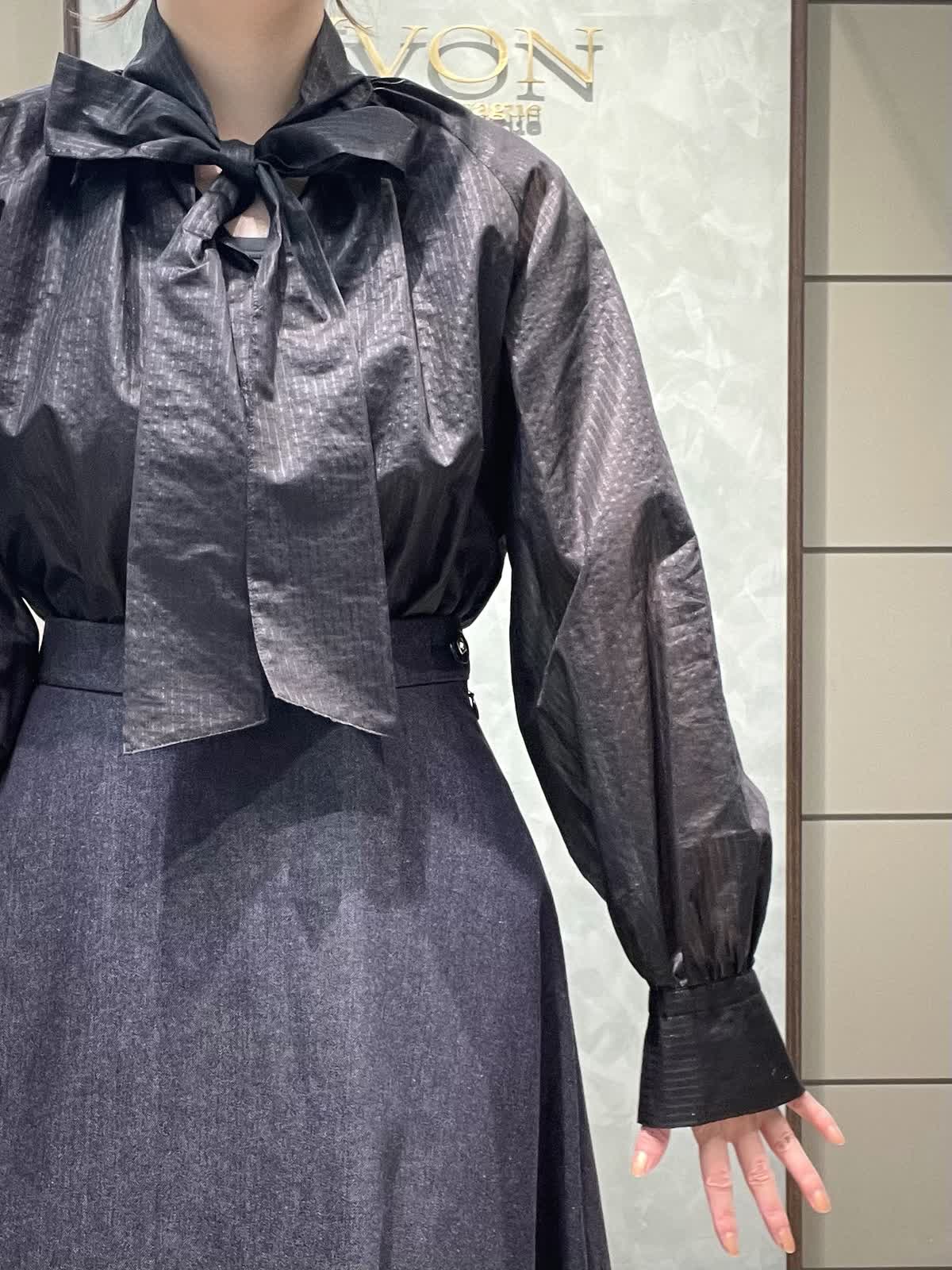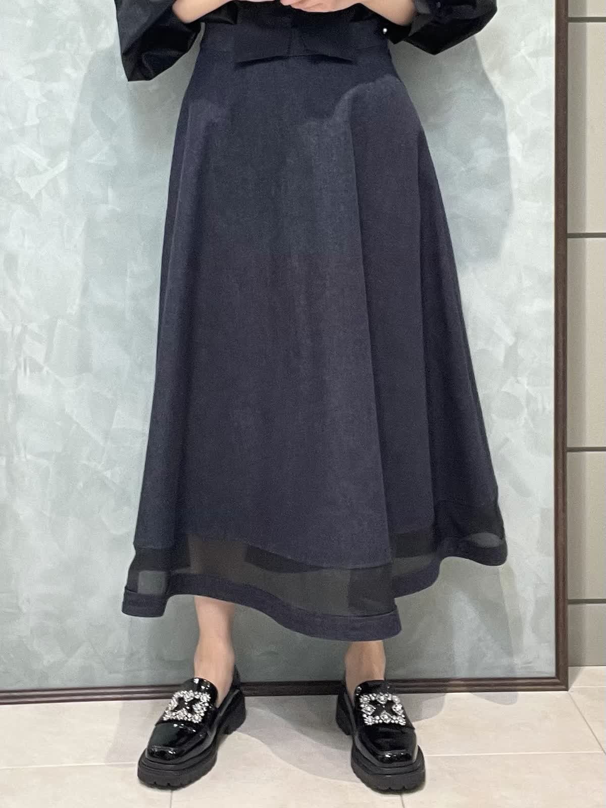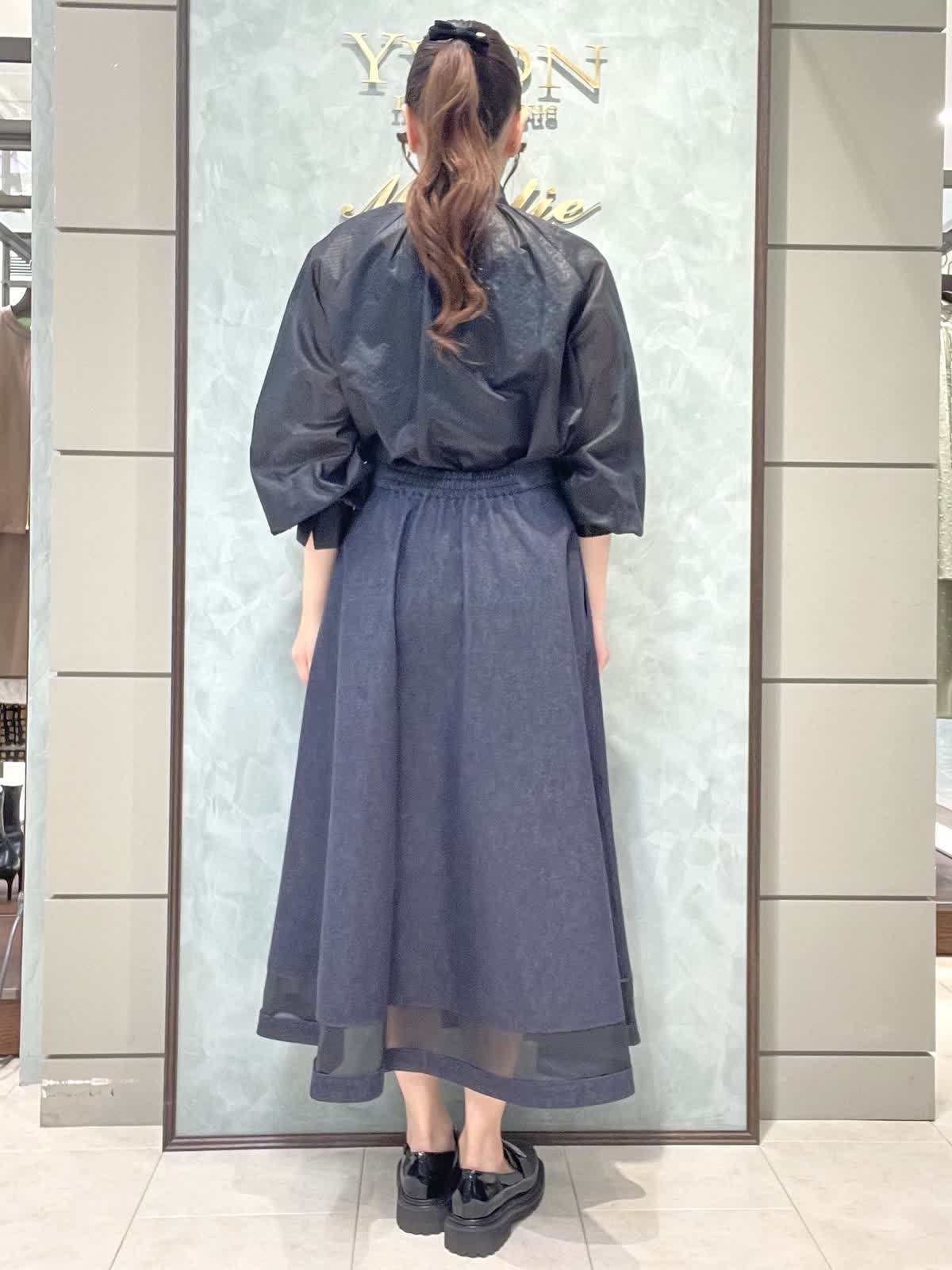 【着用サイズ】ブラウス:7号 スカート:9号 トレンド感のあるシアーブラウスはラメの生地にストライプ柄が入っていて1枚で着映えします。襟高めなのでジャケットやカーディガンのインナーにもおすすめです。首元はV開きですがリボンを結ぶとあまり気にならないです。お袖丈は指にかかるくらい、着丈はヒップ隠れるくらいです。スカートはパリッとしたデニムのお素材で、立体感のあるシルエットです。ウエストにはワンポイントで飾りボタンが付いてます。裾のシアーが軽さが出てこれからの季節ブーツ合わせも素敵です。着丈はふくらはぎ下くらいです。左ファスナー、右のみポケット付き、後ろゴム仕様です。