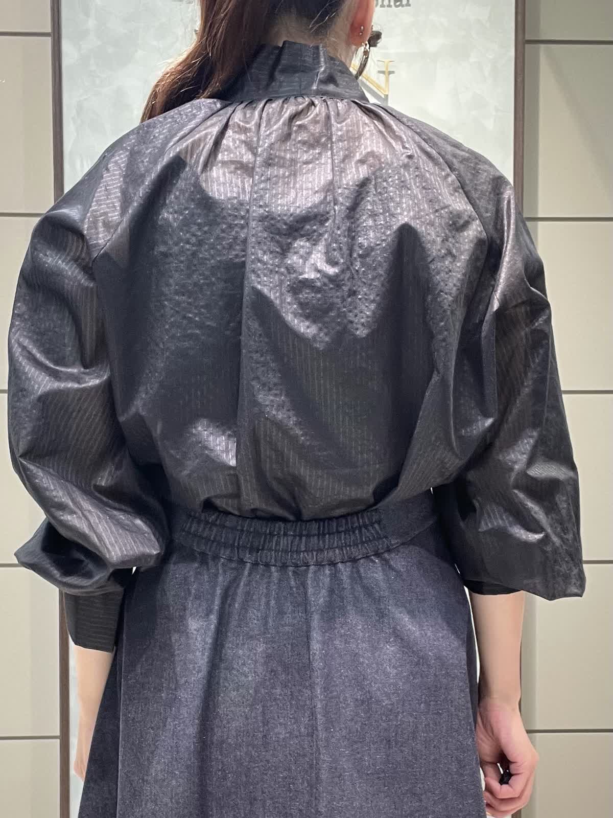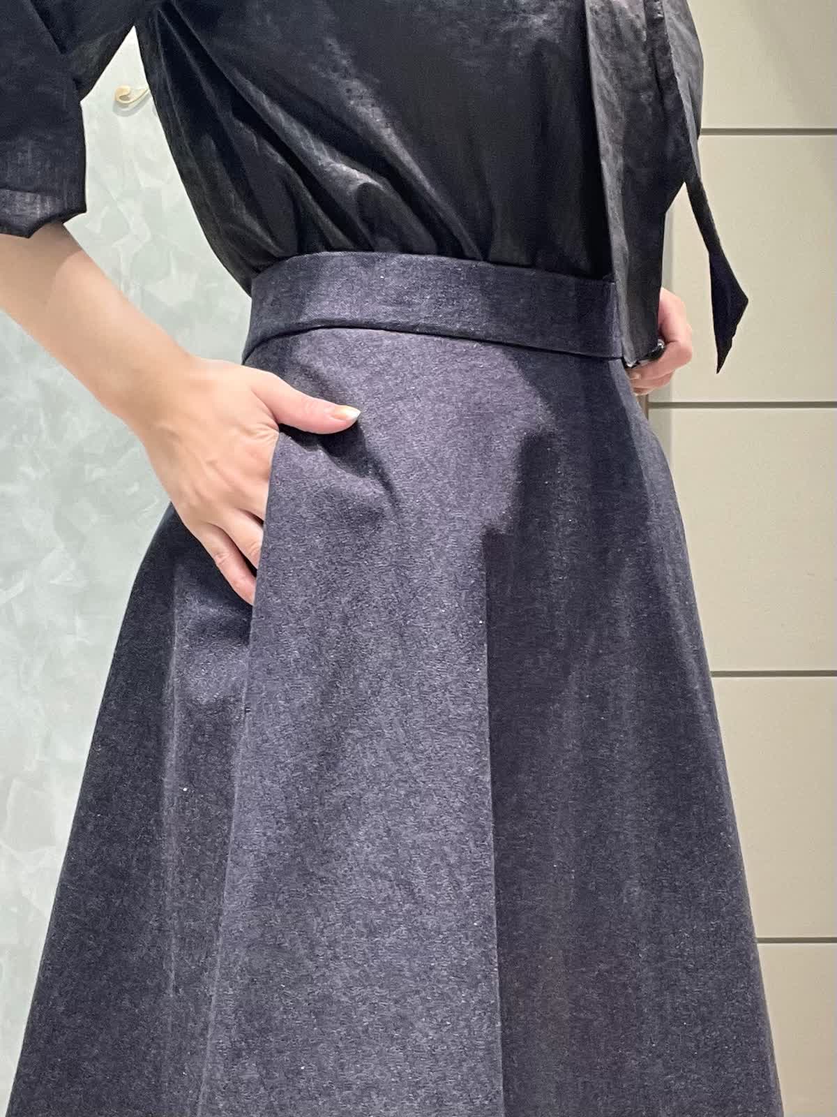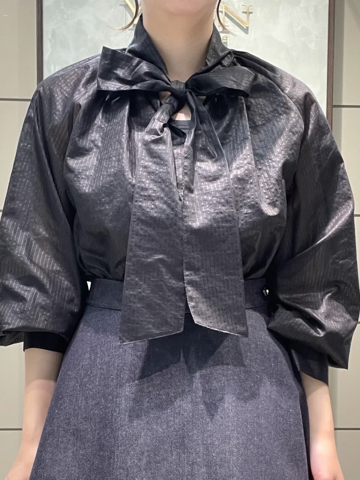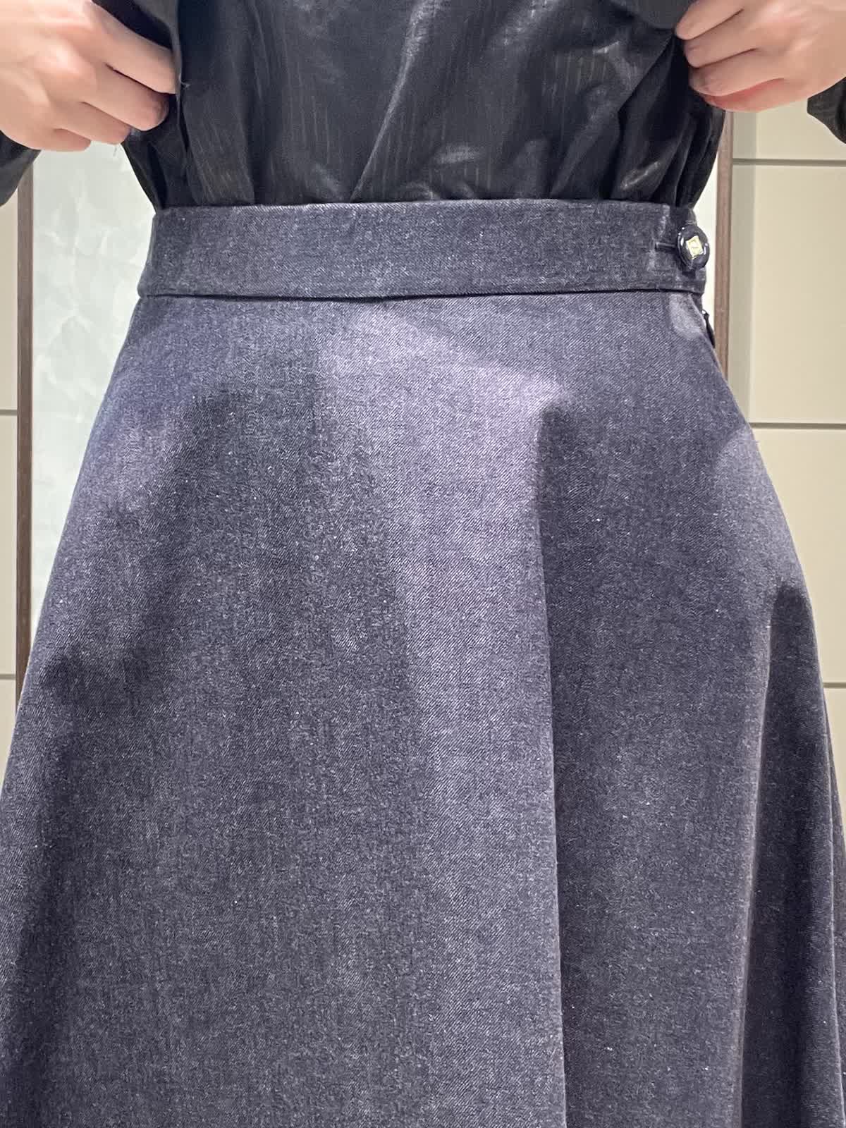 【着用サイズ】ブラウス:7号 スカート:9号 トレンド感のあるシアーブラウスはラメの生地にストライプ柄が入っていて1枚で着映えします。襟高めなのでジャケットやカーディガンのインナーにもおすすめです。首元はV開きですがリボンを結ぶとあまり気にならないです。お袖丈は指にかかるくらい、着丈はヒップ隠れるくらいです。スカートはパリッとしたデニムのお素材で、立体感のあるシルエットです。ウエストにはワンポイントで飾りボタンが付いてます。裾のシアーが軽さが出てこれからの季節ブーツ合わせも素敵です。着丈はふくらはぎ下くらいです。左ファスナー、右のみポケット付き、後ろゴム仕様です。