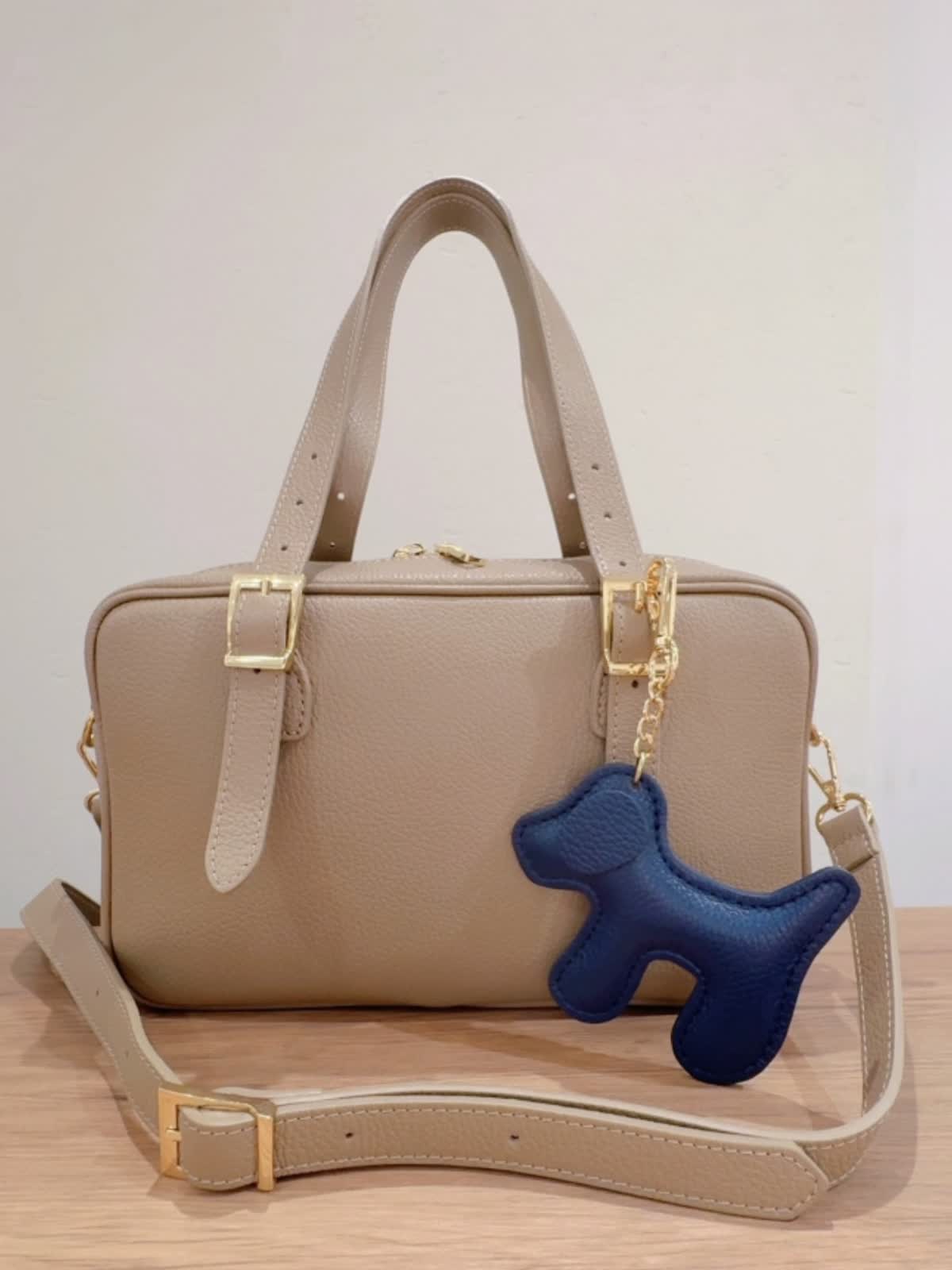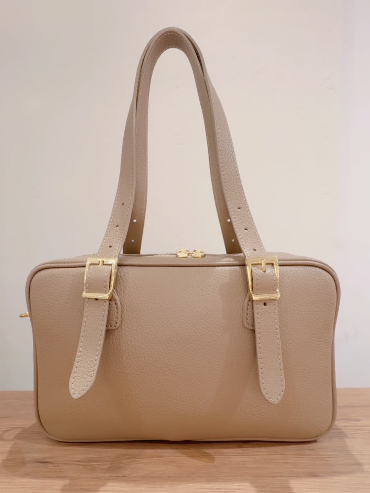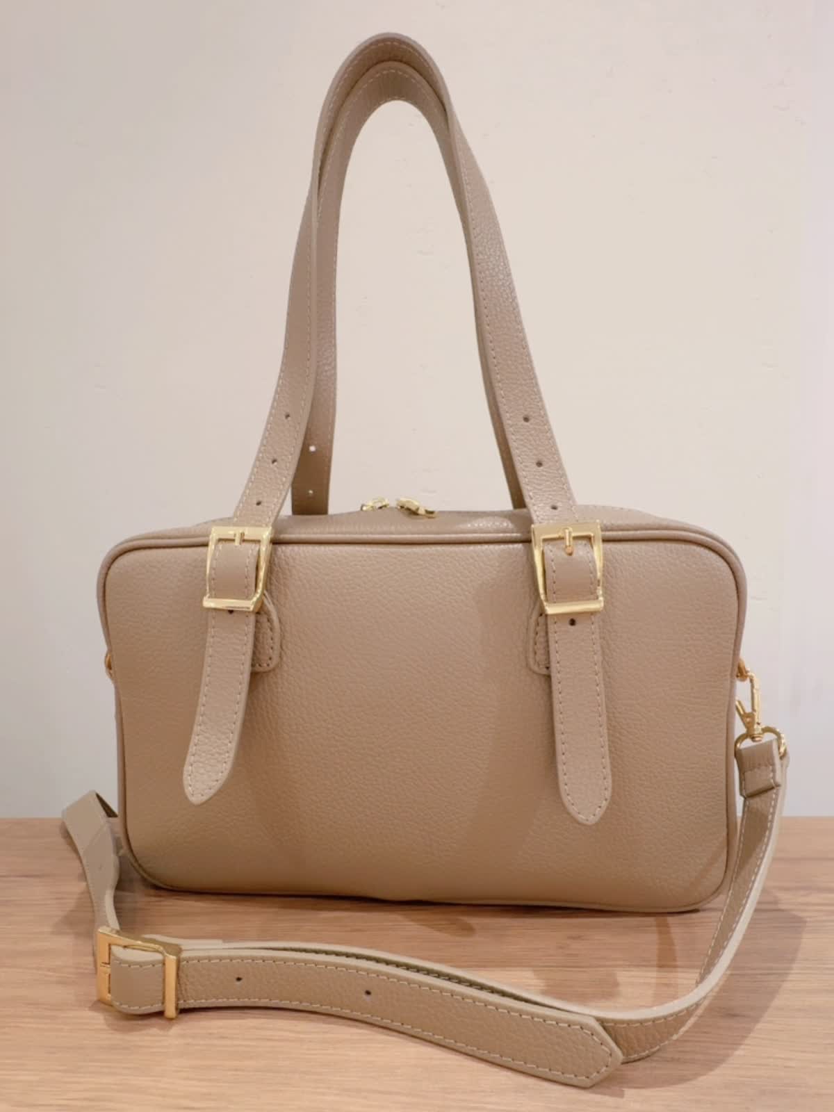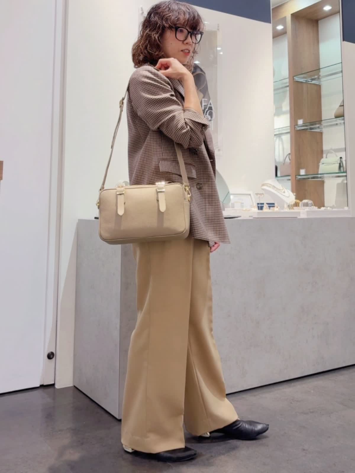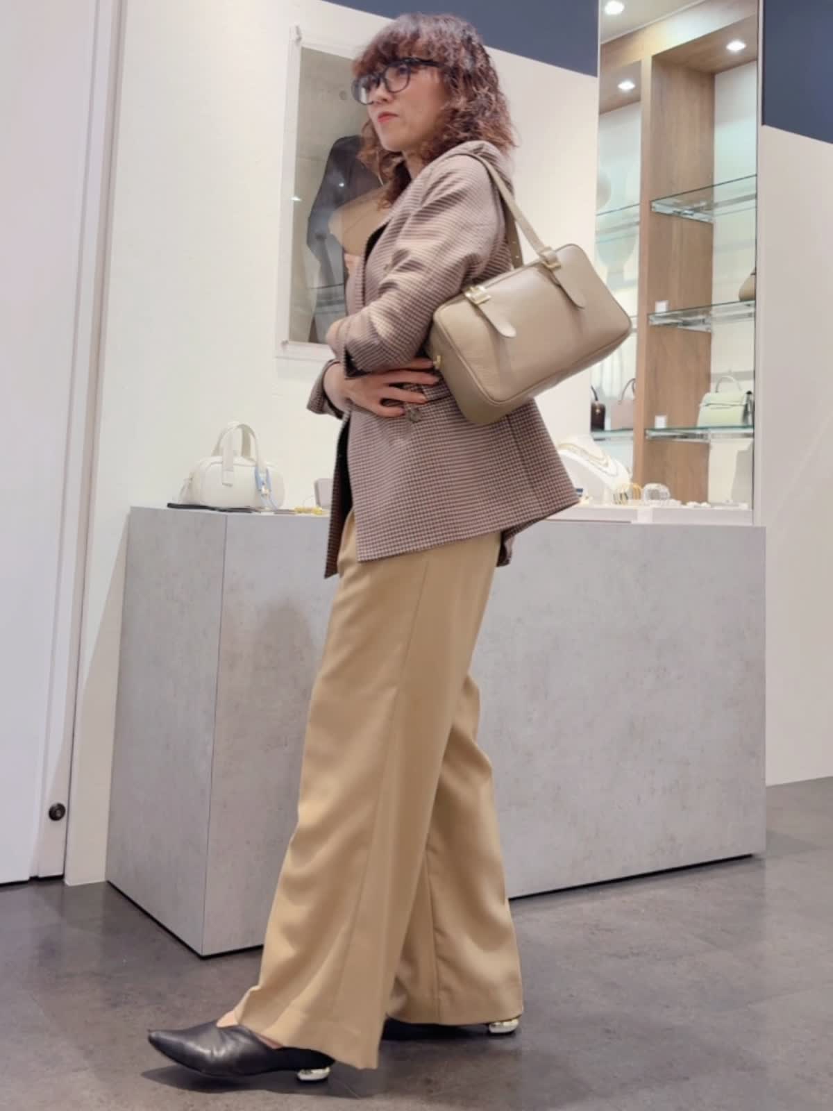 【INNUE/イヌエ】 ショルダーボストンバッグ バッグ:グレーベージュ 【着用サイズ】ジャケット:9号 ニット:11号 パンツ:9号 【着用カラー】ジャケット:柄小 ニット:ブラック パンツ:ベージュ シボ感のあるイタリアンレザーを使用。 シンプルなのでオンオフどちらのコーディネートにも合わせられます! ハンドルはベルトになっていて長さ調整が可能。 付属でショルダーベルトも付いています。