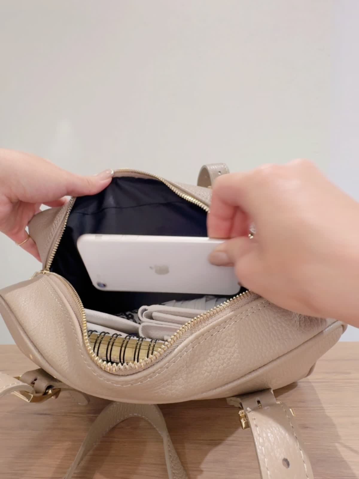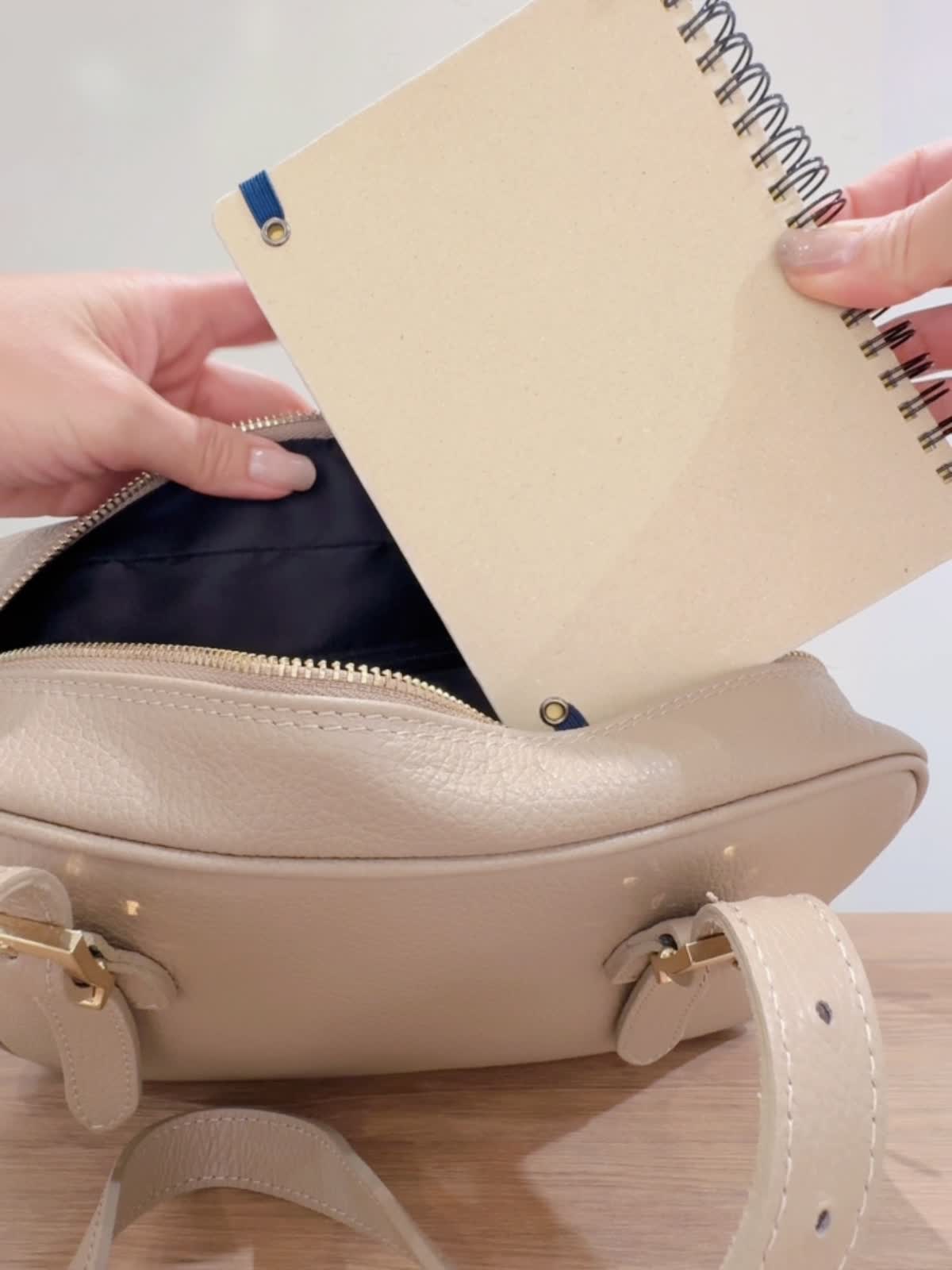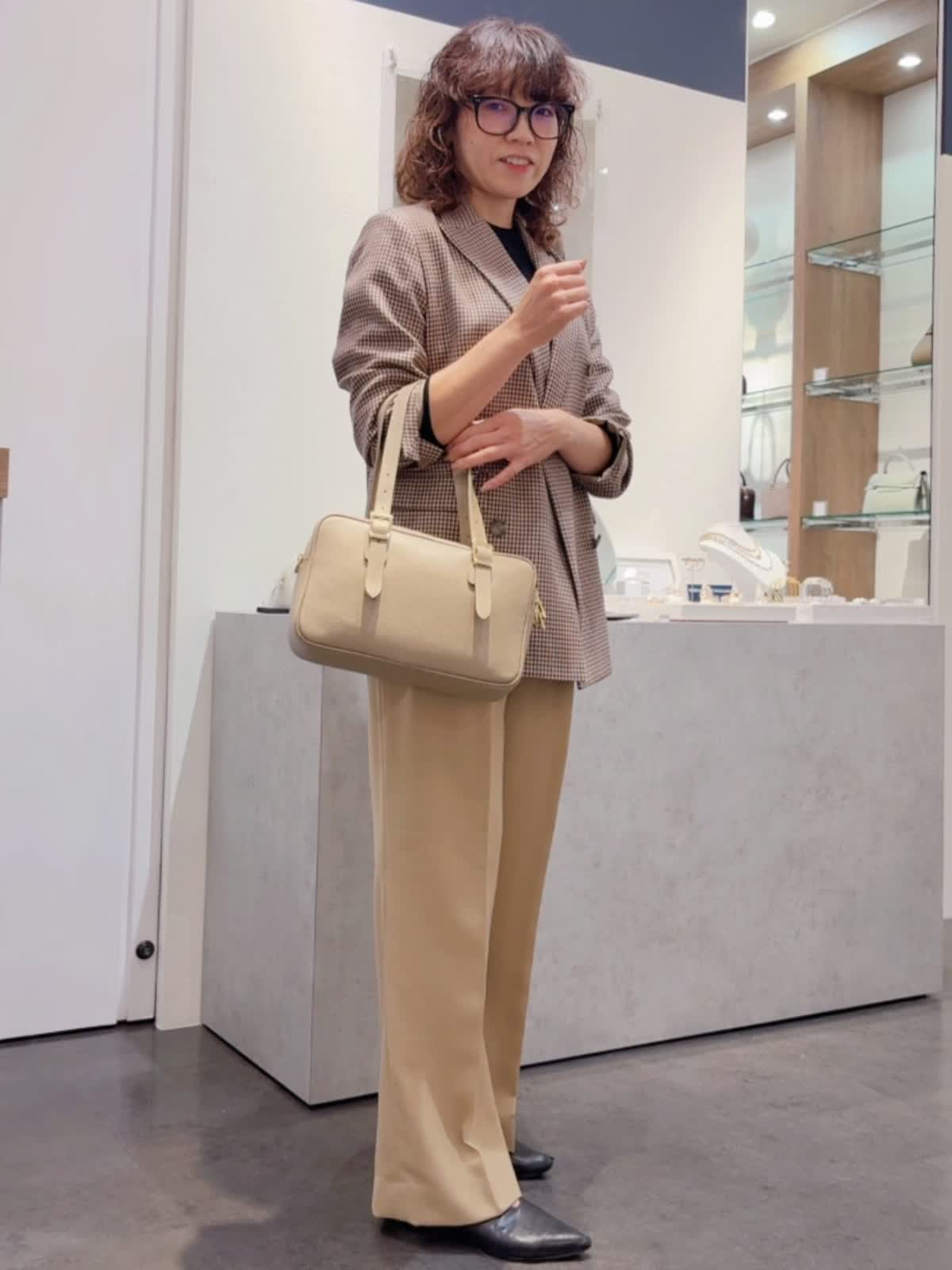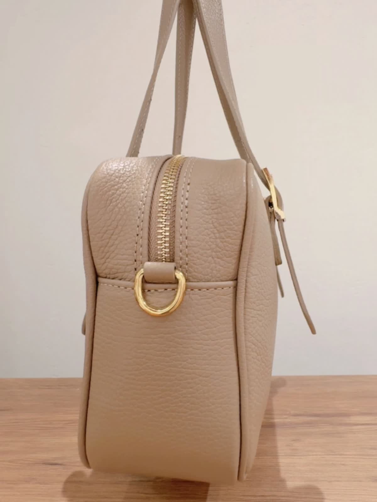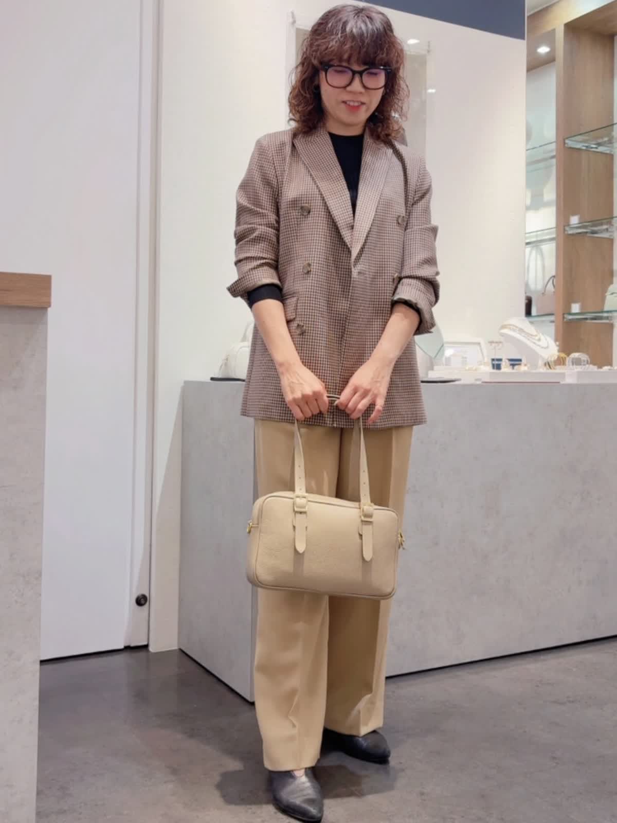 【INNUE/イヌエ】 ショルダーボストンバッグ バッグ:グレーベージュ 【着用サイズ】ジャケット:9号 ニット:11号 パンツ:9号 【着用カラー】ジャケット:柄小 ニット:ブラック パンツ:ベージュ シボ感のあるイタリアンレザーを使用。 シンプルなのでオンオフどちらのコーディネートにも合わせられます! ハンドルはベルトになっていて長さ調整が可能。 付属でショルダーベルトも付いています。