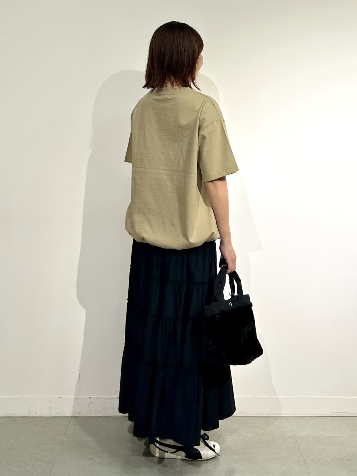 スカートはウエストゴムのティアードスカート。カジュアルの中にも可愛らしさが欲しい時に◎シワになりにくい生地がうれしいです。