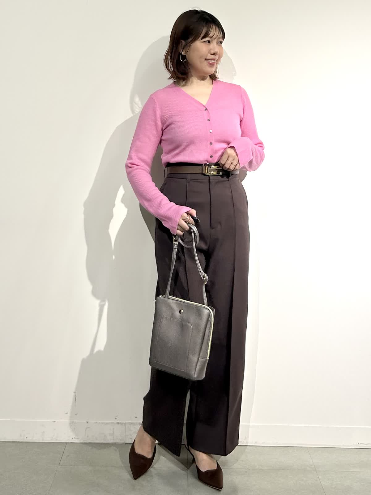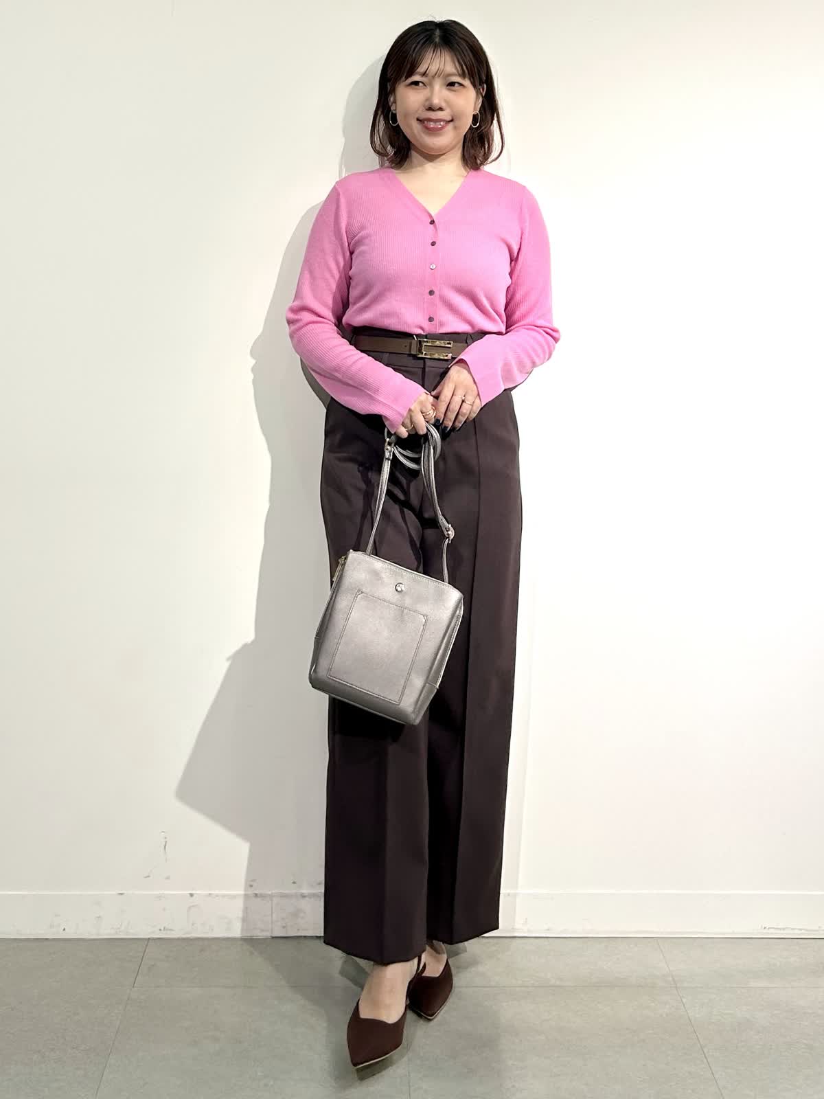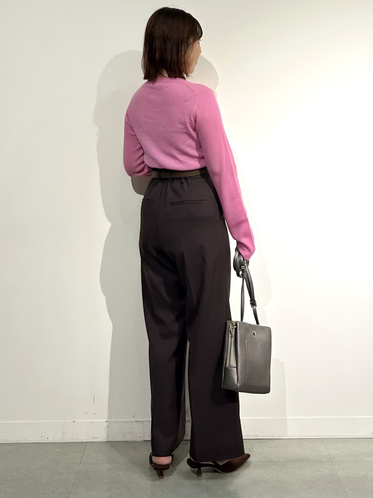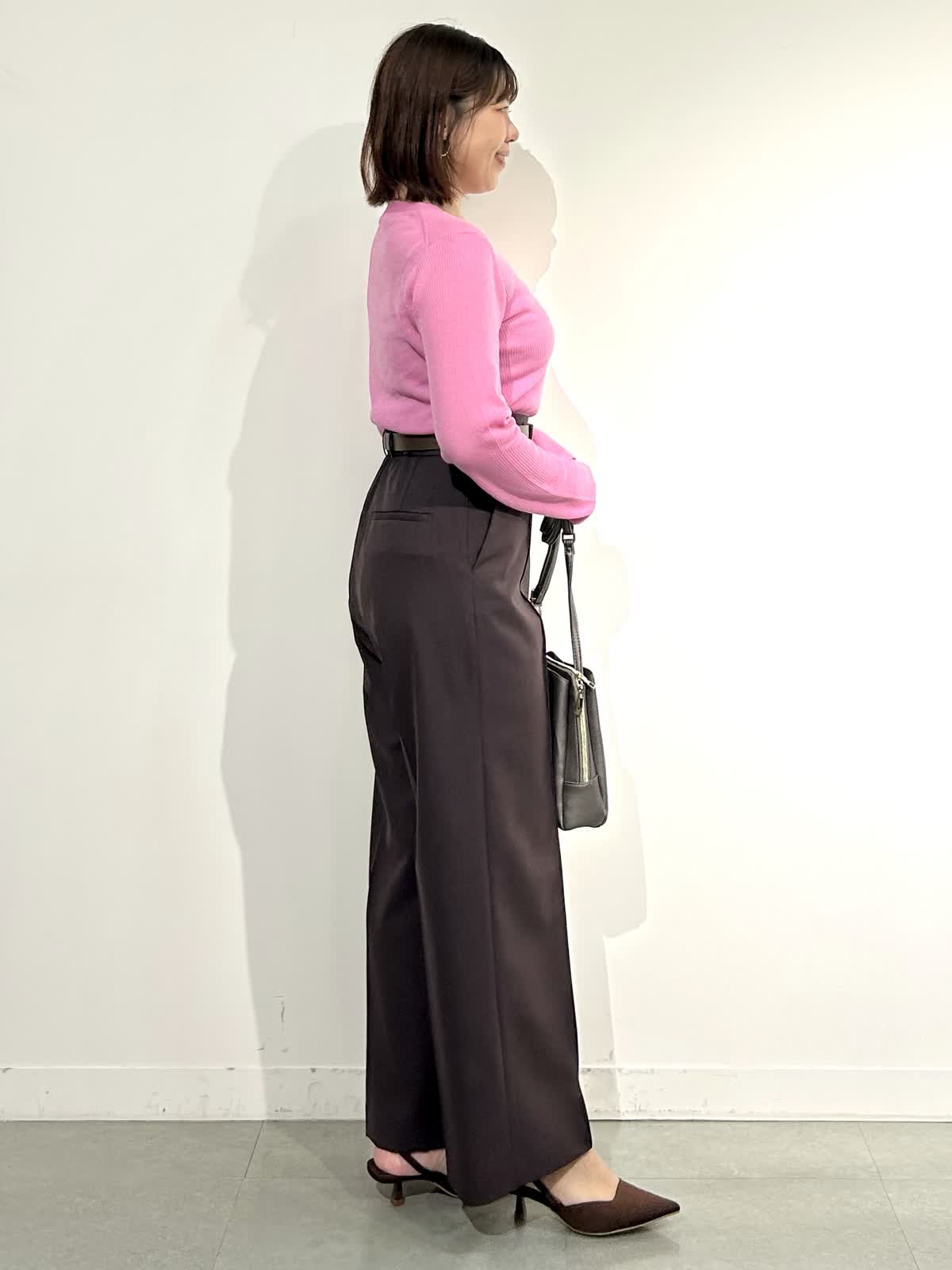 【着用サイズ】ニット:フリー パンツ:9号 【着用カラー】ニット:ピンク パンツ:ブラウン ニットは名前の通りとろけるような柔らかさで、ふわふわの肌触り。チクチク感なく着られるニットです。 Vの開きが大きすぎないので胸元も気になりにくいところが嬉しいです。ボトムはしっかりハイウエストで履ける美脚ライン。センターのピンタックで抜群の脚長効果です。 赤みよりのブラウンがとってもおしゃれな色です♪