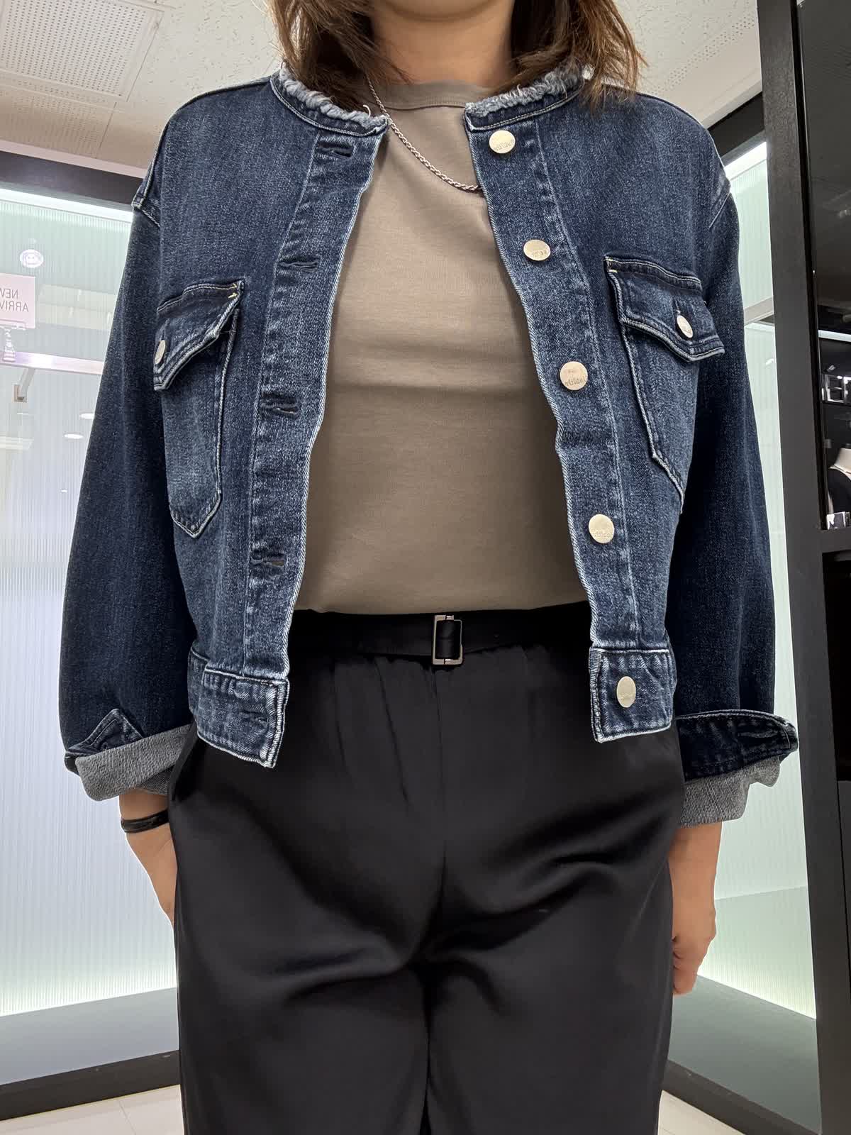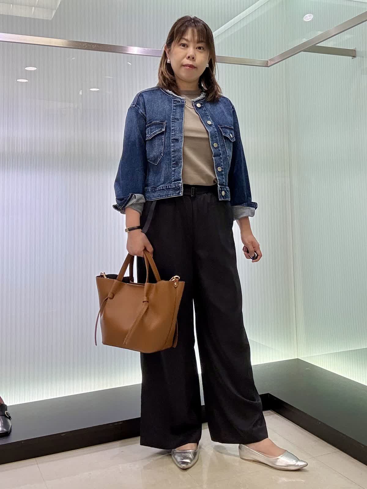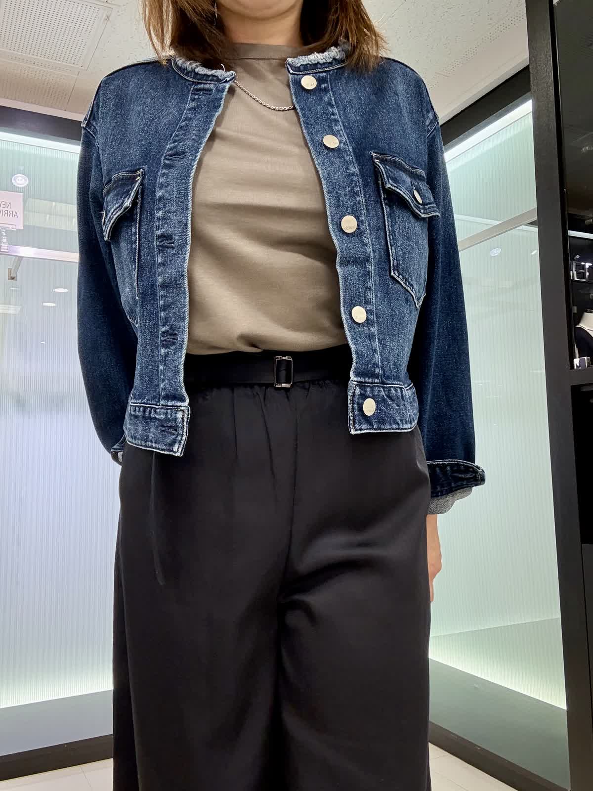 デニム着用サイズ9号 イネド別注のノーカラーデニムジャケットです。ストレッチが効いていてとても着やすいです。アームホールも広いのでニットを着てもごわつきません。ノースリーブTシャツ 11号 伸縮性があり合わせやすいコットンタイプです。 パンツ着用サイズ9号 サテン生地でウエストゴムのワイドパンツになります。いつも11号ですがこちらは9号で大丈夫でした。