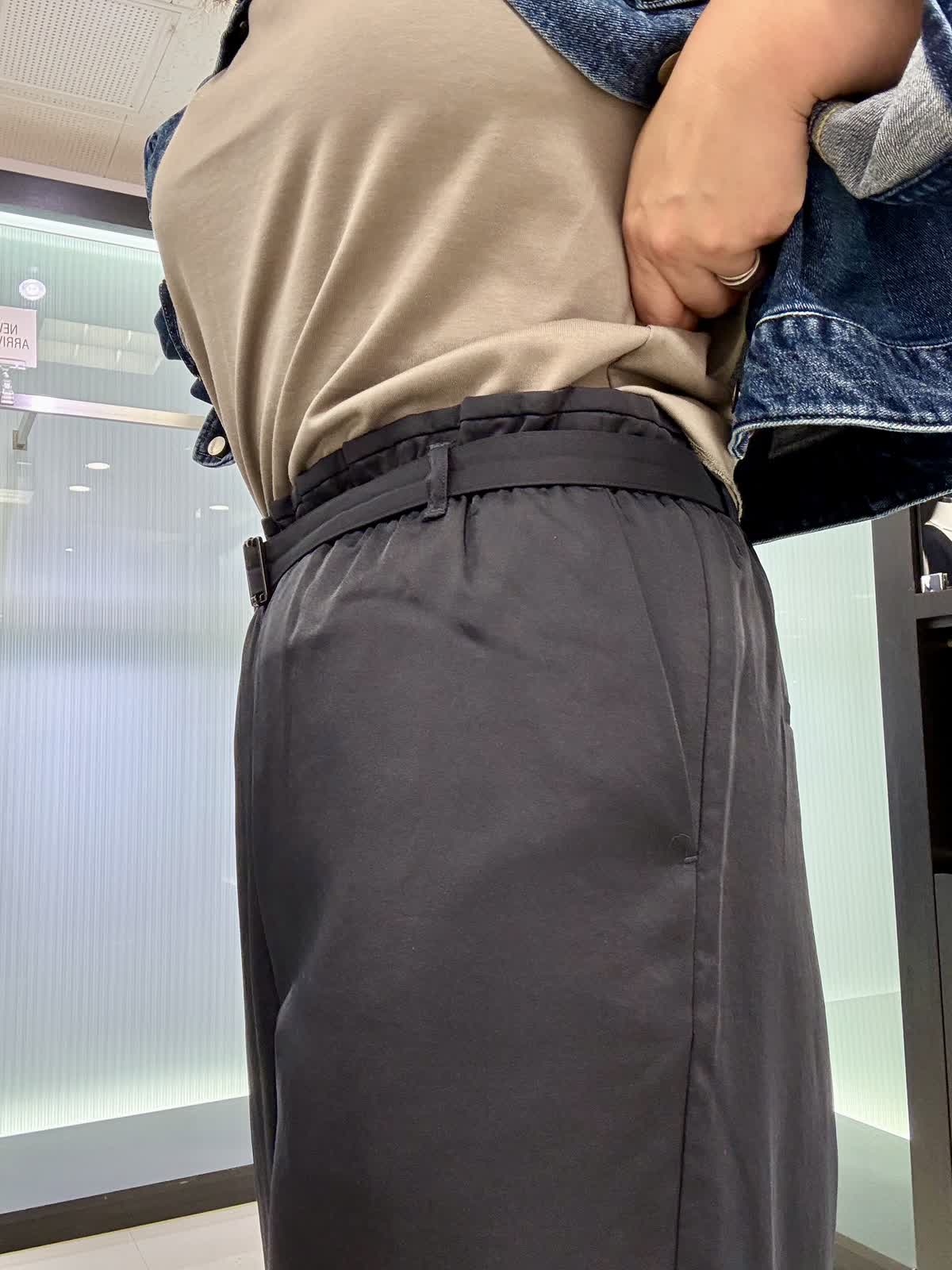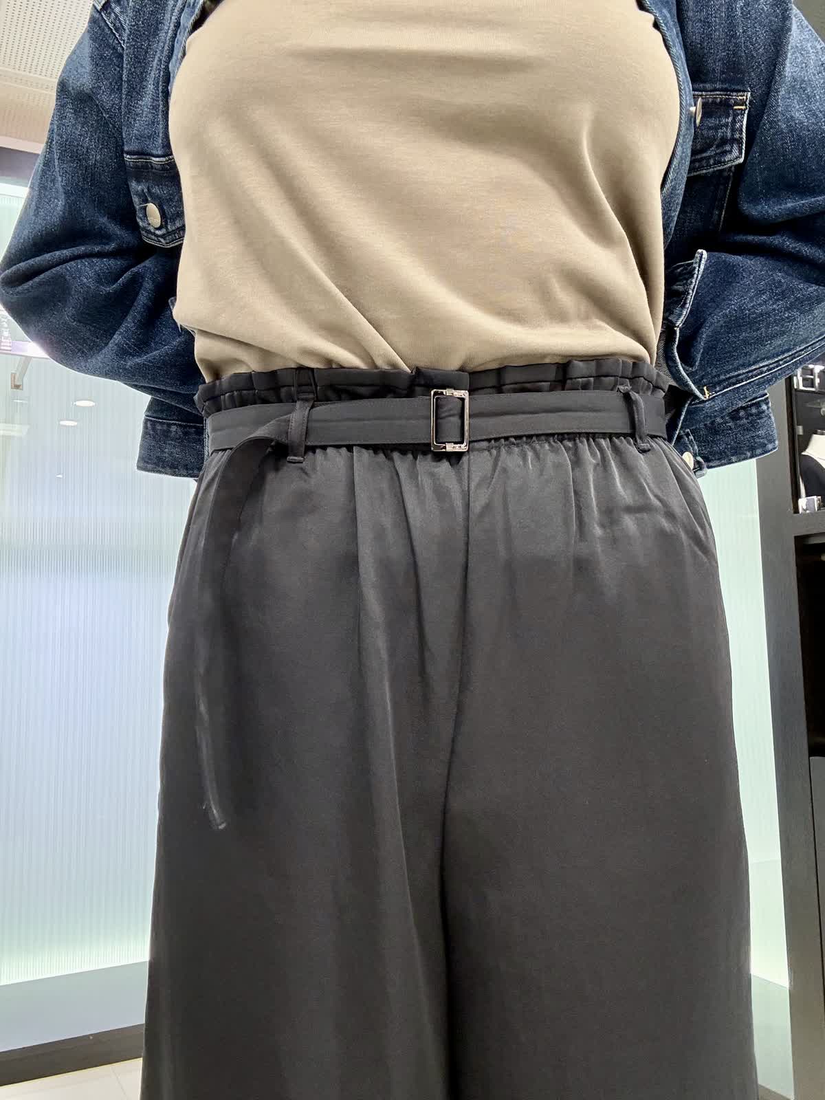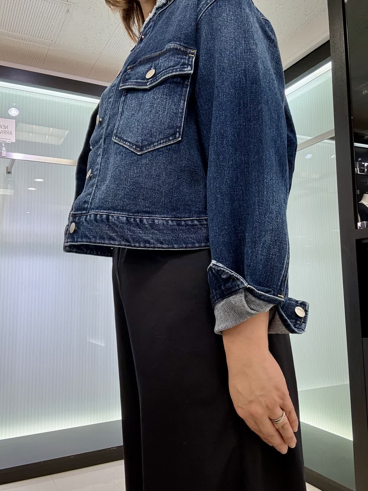 デニム着用サイズ9号 イネド別注のノーカラーデニムジャケットです。ストレッチが効いていてとても着やすいです。アームホールも広いのでニットを着てもごわつきません。ノースリーブTシャツ 11号 伸縮性があり合わせやすいコットンタイプです。 パンツ着用サイズ9号 サテン生地でウエストゴムのワイドパンツになります。いつも11号ですがこちらは9号で大丈夫でした。