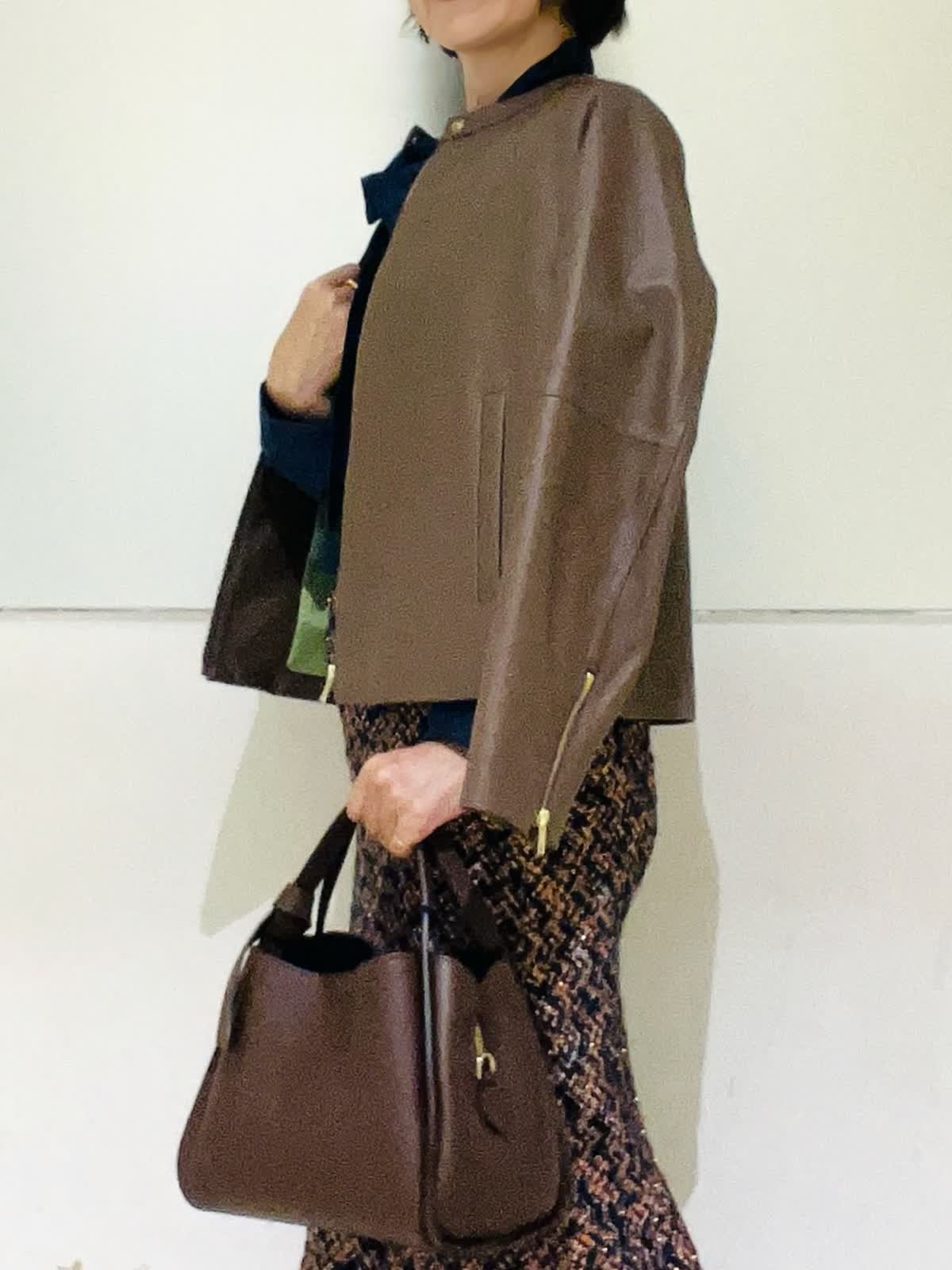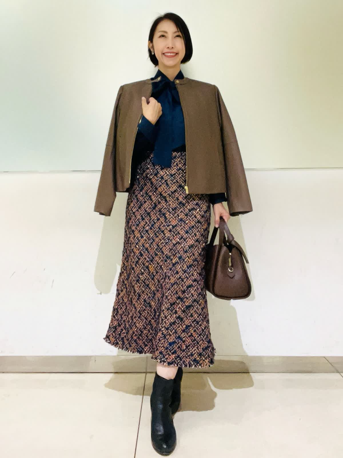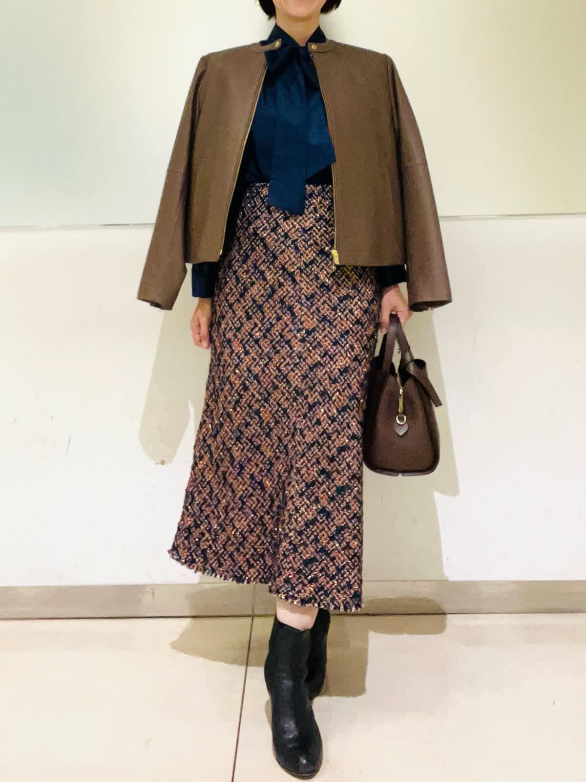 【着用アイテム】すべて9号 【着用カラー】ジャケット:ブラウン ブラウス:ブルー スカート:ベージュ クラシカルな雰囲気が秋らしいブラウンコーデ。トレンドのブラウンは今年ぜひ取り入れたいカラー。モカブラウンのレザージャケットは、優しい色合いでレザー独特のハードなイメージを柔らかい印象に変えてくれます。インナーにボータイブラウスを入れて女性らしいクラシカルな雰囲気をプラス。ツイードの華やかが主役になれるお出かけコーディネートです。