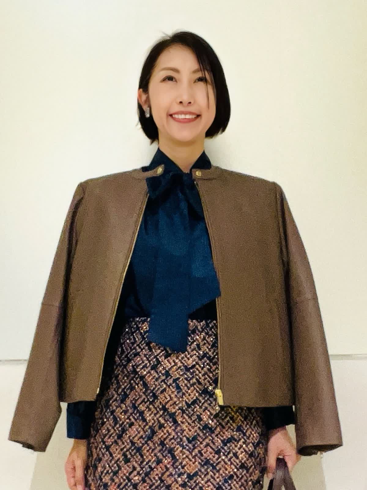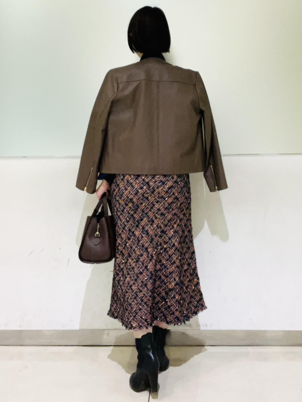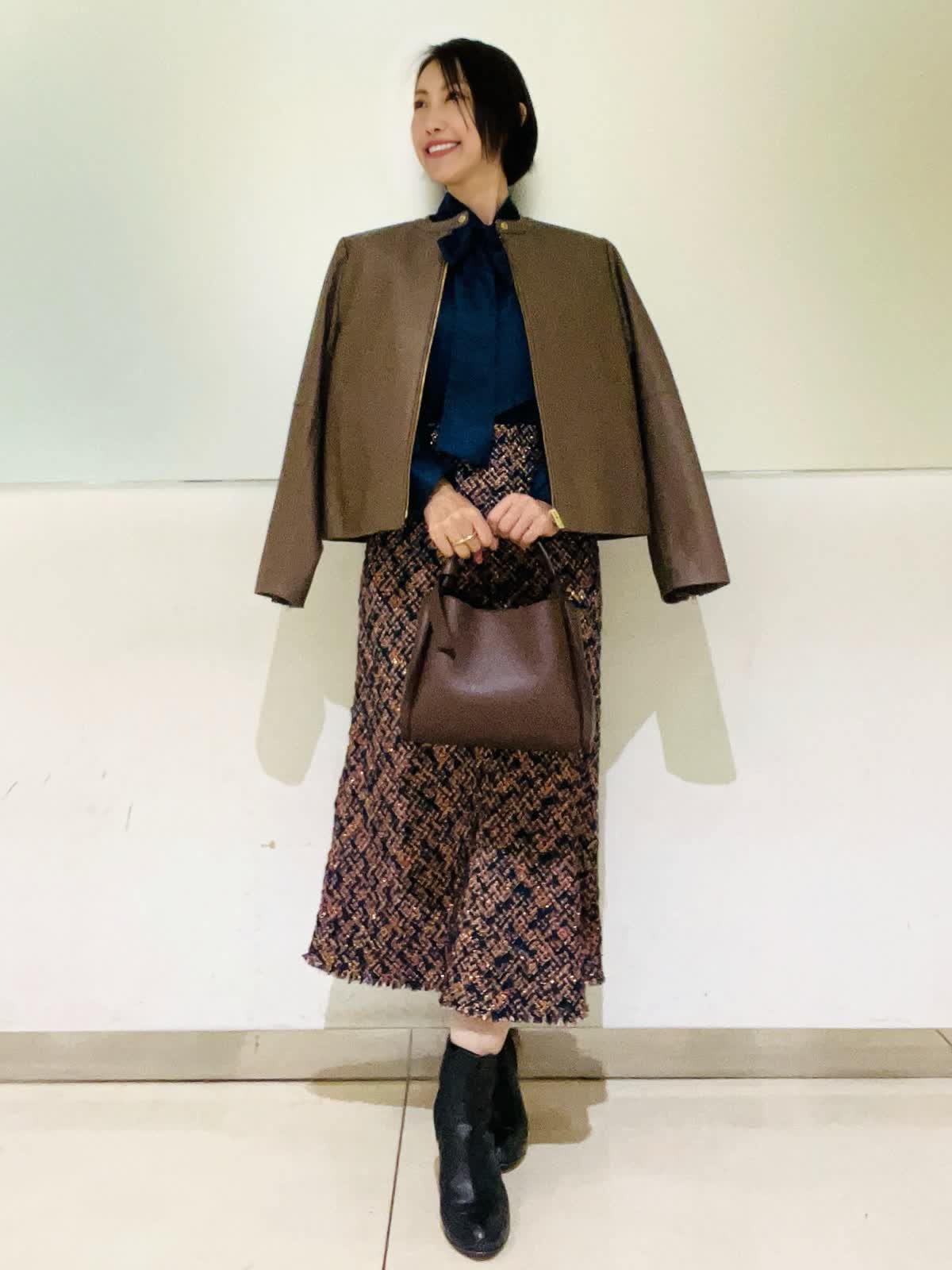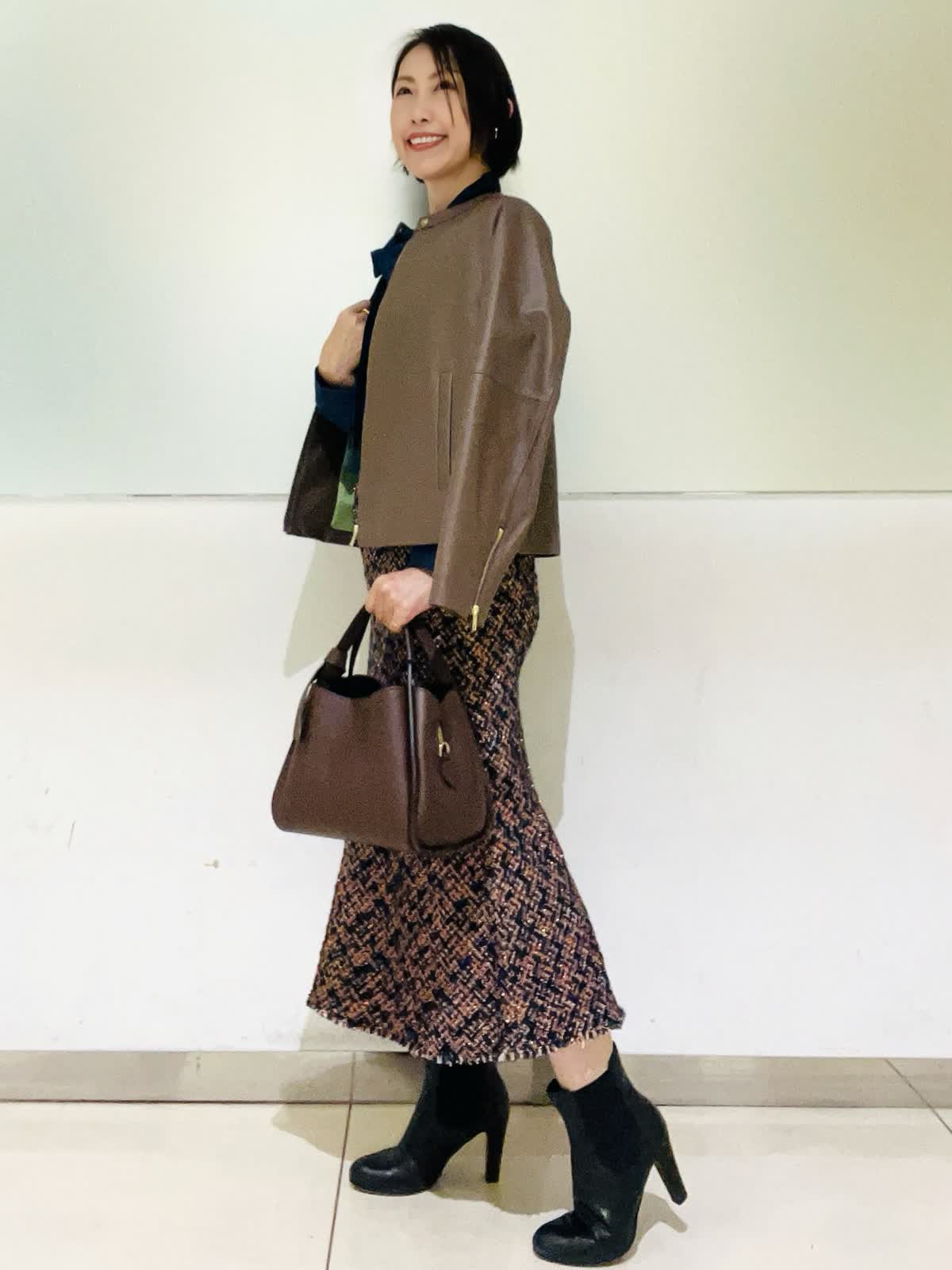 【着用アイテム】すべて9号 【着用カラー】ジャケット:ブラウン ブラウス:ブルー スカート:ベージュ クラシカルな雰囲気が秋らしいブラウンコーデ。トレンドのブラウンは今年ぜひ取り入れたいカラー。モカブラウンのレザージャケットは、優しい色合いでレザー独特のハードなイメージを柔らかい印象に変えてくれます。インナーにボータイブラウスを入れて女性らしいクラシカルな雰囲気をプラス。ツイードの華やかが主役になれるお出かけコーディネートです。