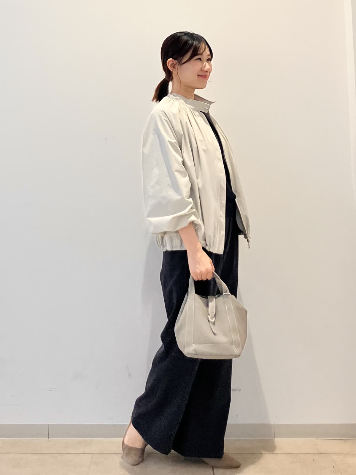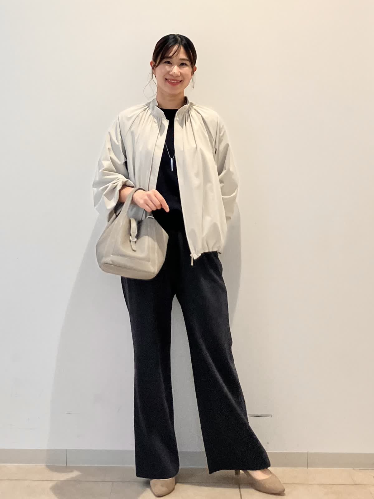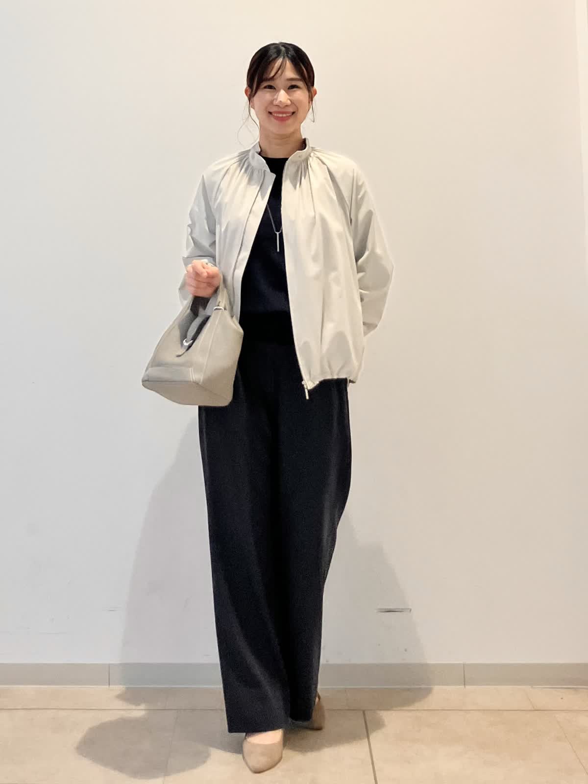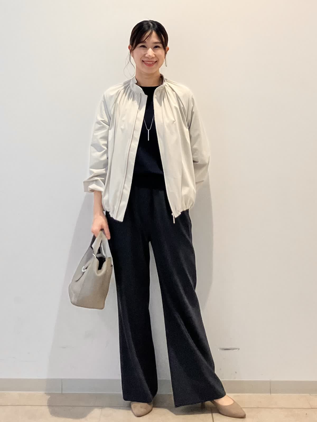 【着用サイズ】ブルゾン:フリー ニット:フリー パンツ:9号 快適とオシャレを両立できるお出かけコーデ。 気温差が出てきた季節に便利なブルゾン。さらっとしっとりとしていてカサカサしにくい素材です。伸び感があるので動きやすい! そして、脚長効果もあるフレアパンツ。こちらもさらっとした素材です。足元はスニーカーでも合いますよ♪これからお出かけが増える季節、おしゃれと快適さを兼ね備えたスタイリングをオススメします♪