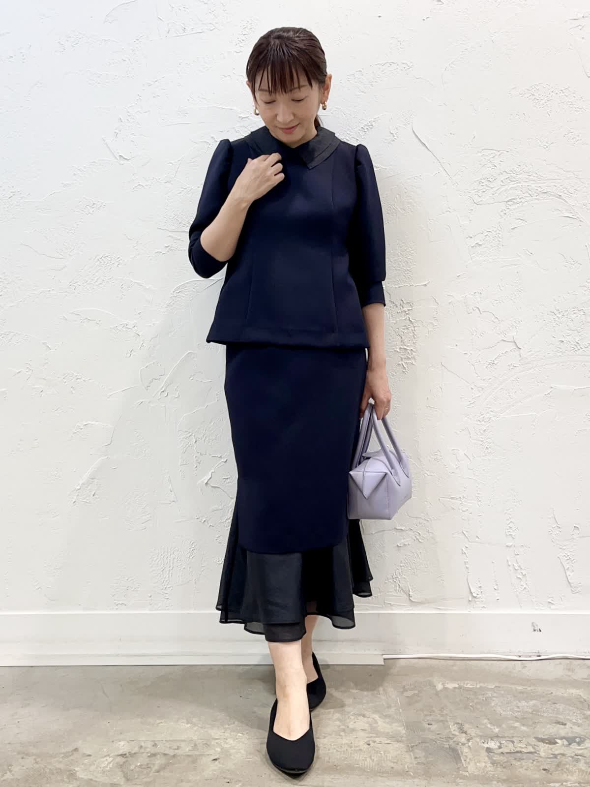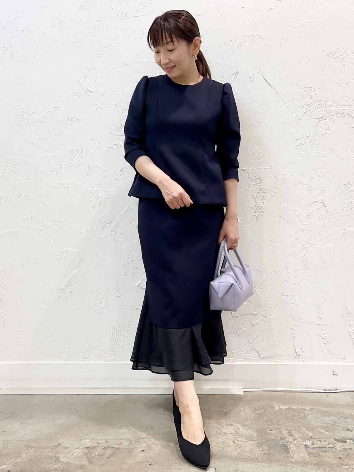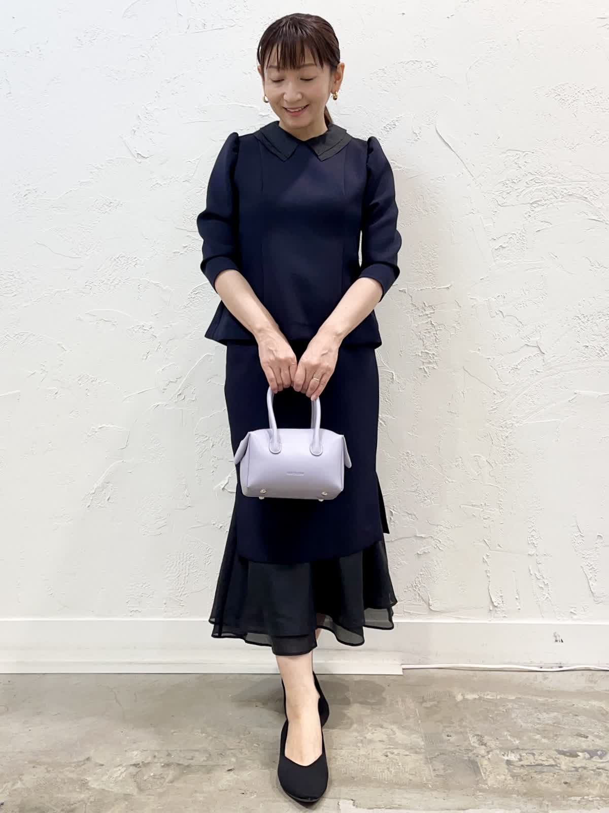 【着用サイズ/カラー】 ブラウス:7号/ネイビー スカート:7号/ネイビー バッグ:ラベンダー ネイビーのセットアップ。清楚なネイビーは行事にも学校用にもおすすめです。単品コーデで普段使いもしやすいです◎いろいろな着こなしを楽しめちゃいます♪ネイビーは7号着用で、ドットでは9号着用です。ぜひサイズ感を比べてみてください。